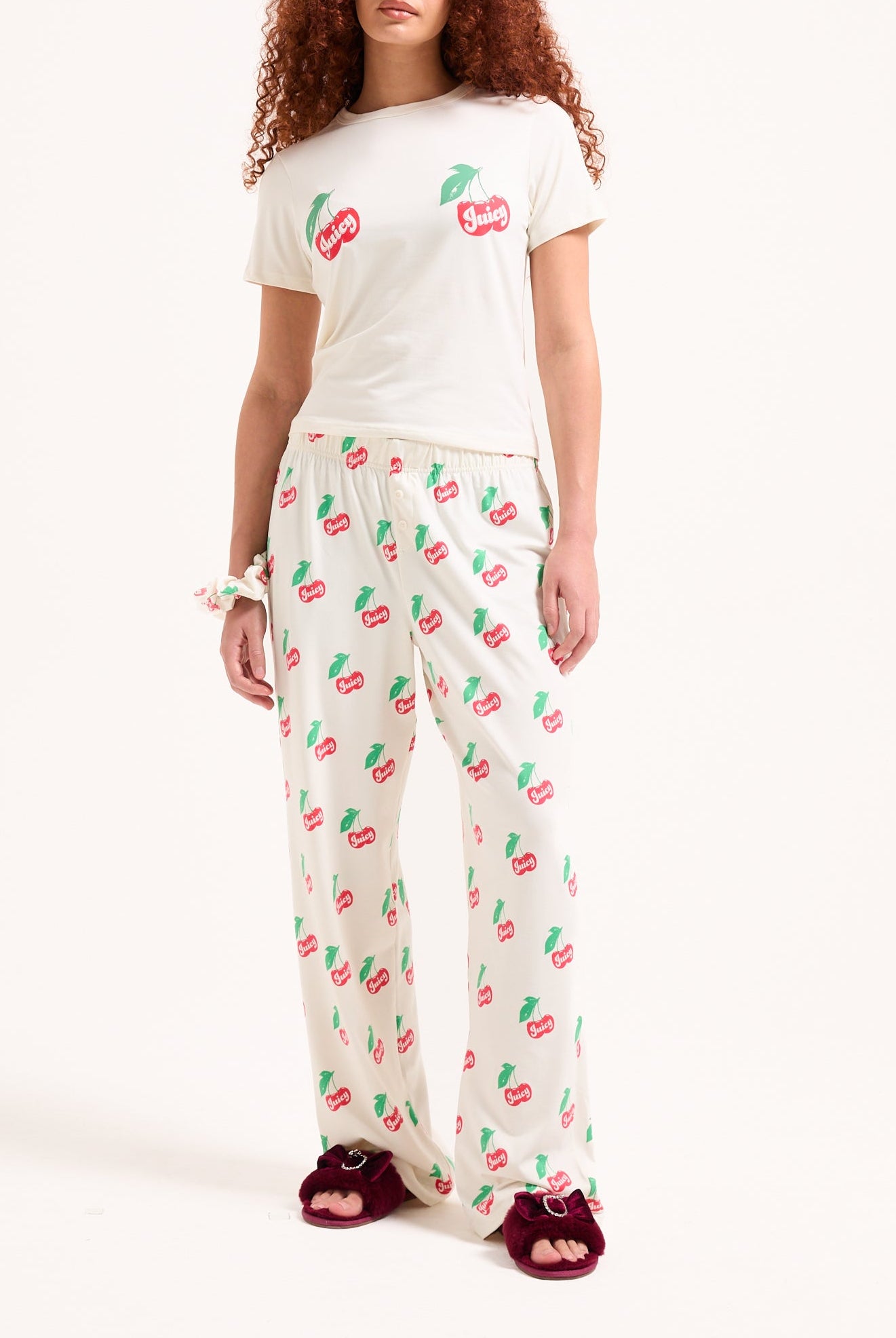 CHERRY PRINT PYJAMA SET WITH SCRUNCHIE