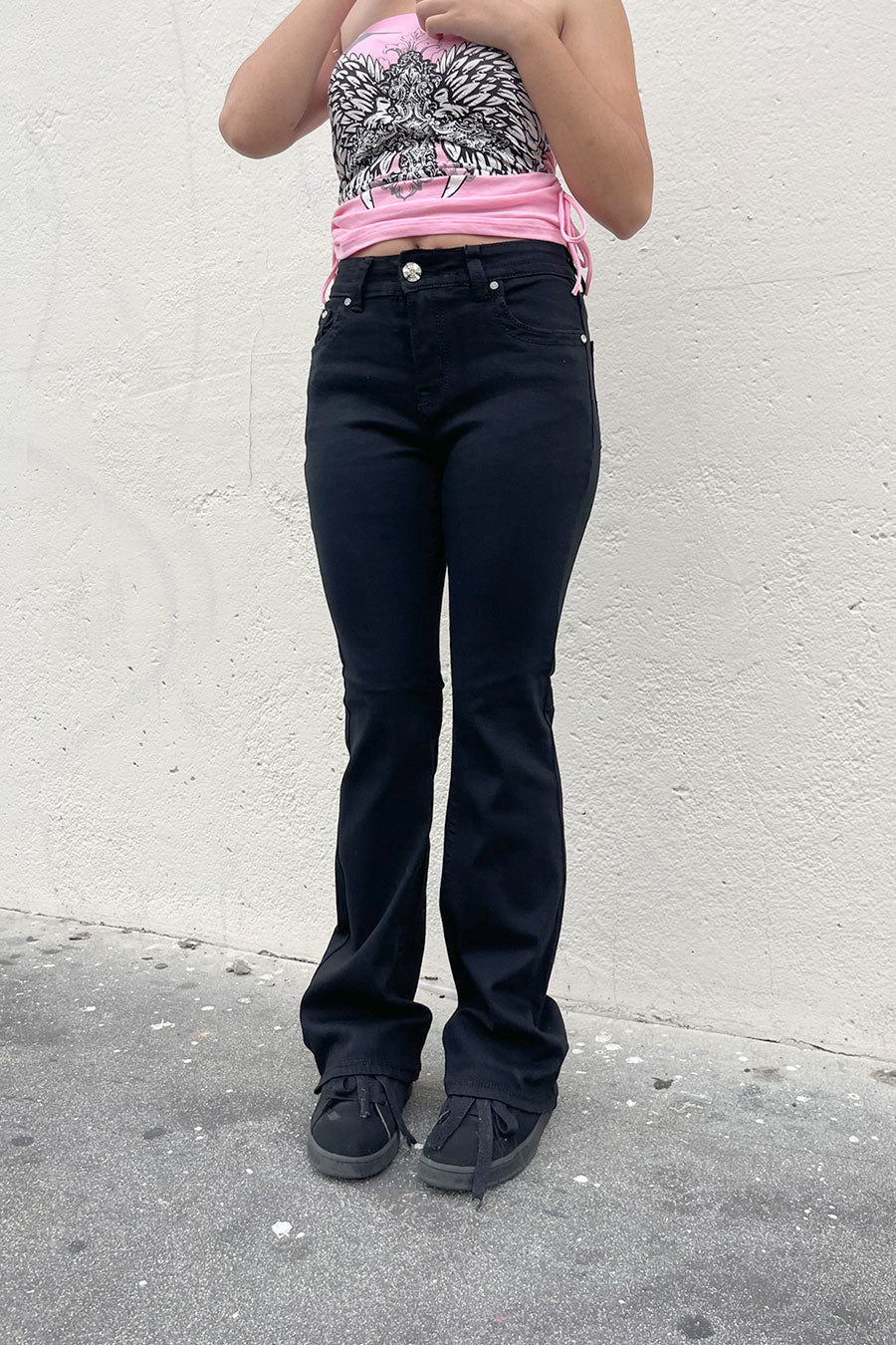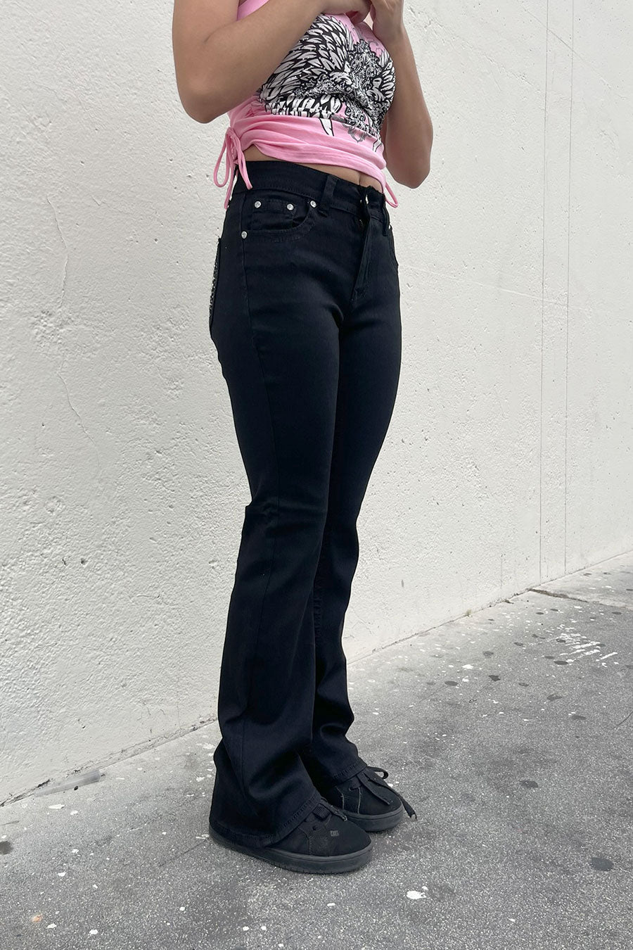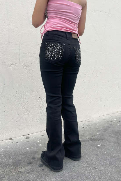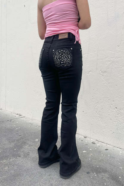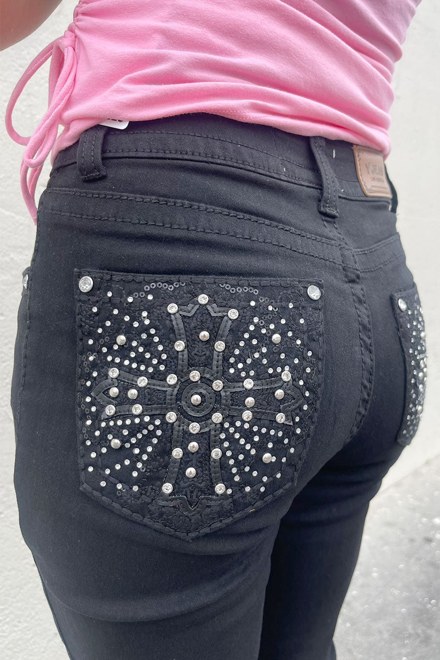 - Style Description: 2000s Style Cross Rhinestone Bling Back Pocket Bootcut Black Jean with Good Stretch
