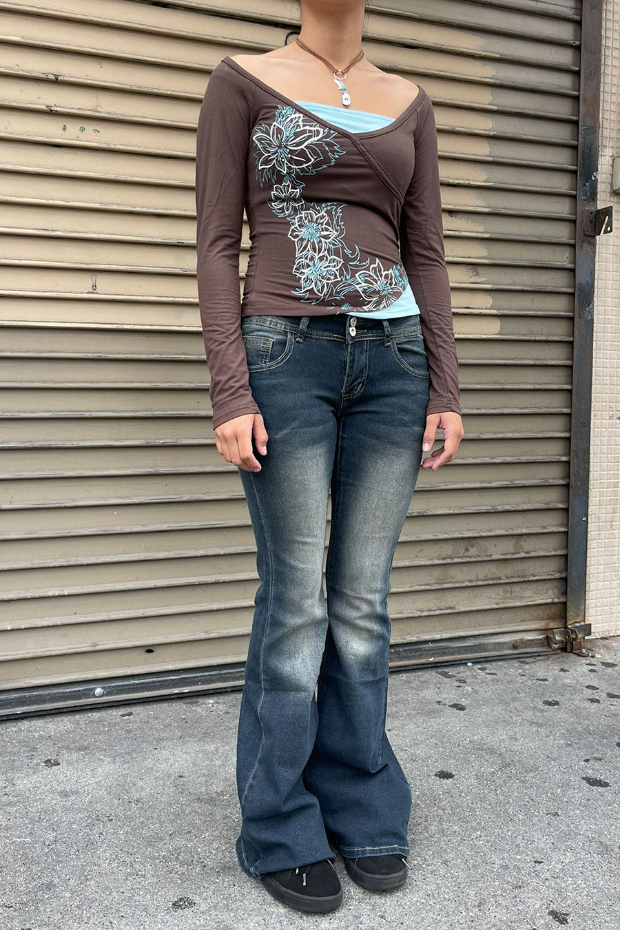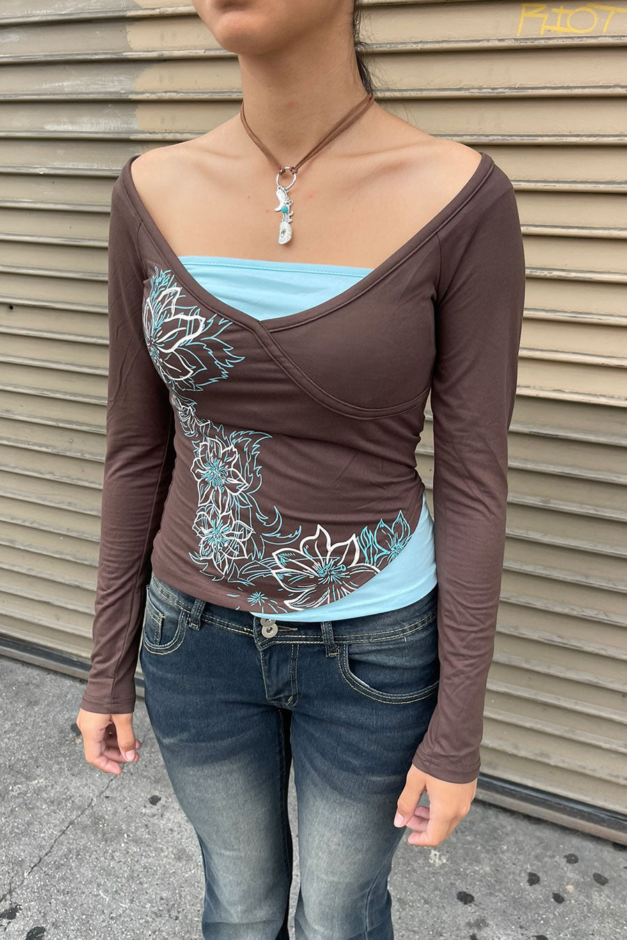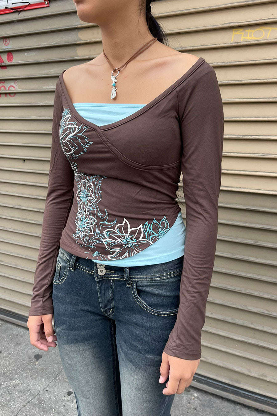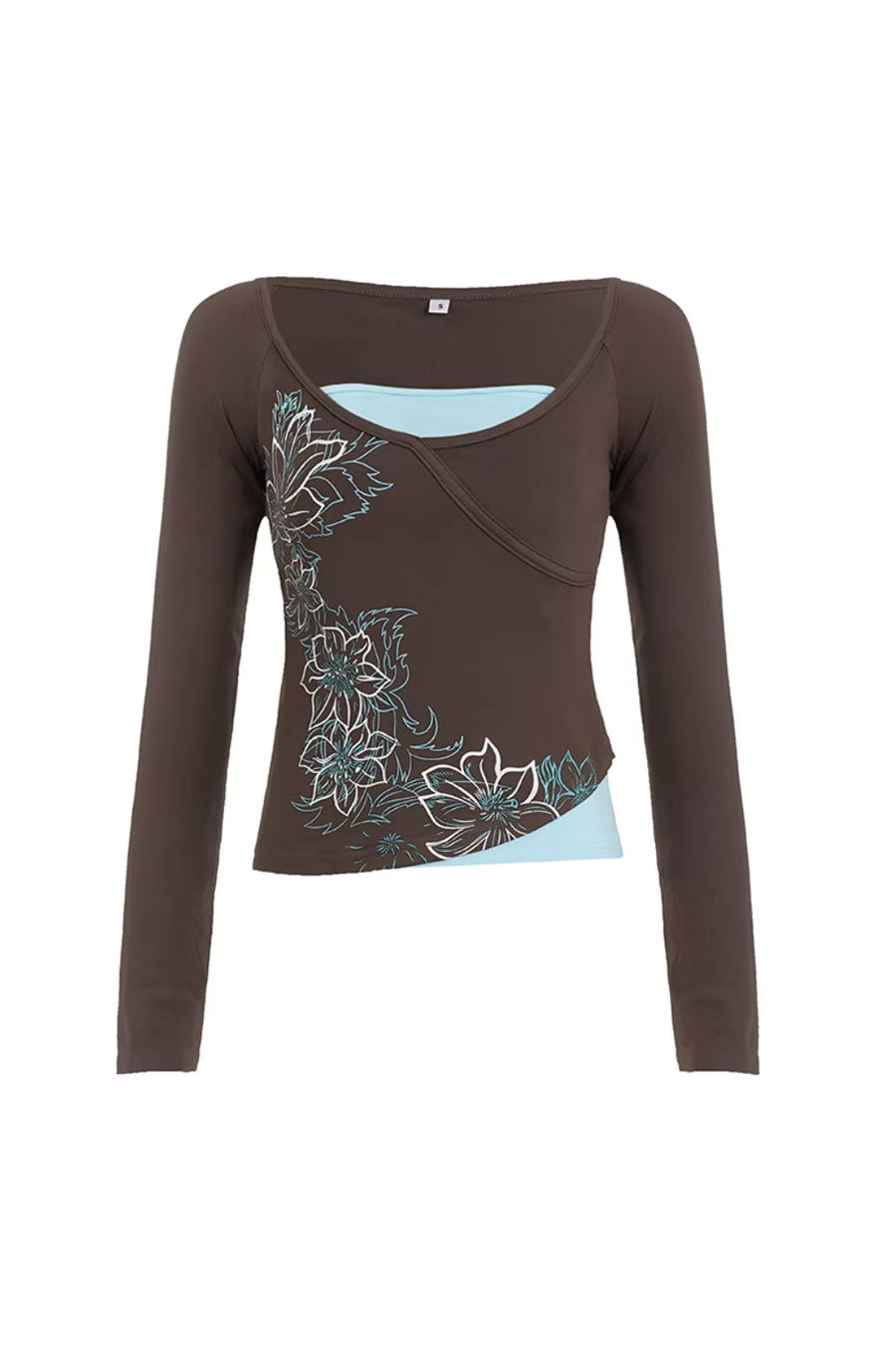 - Style Description: 2000s Vintage Floral Print Contrast Layered Long Sleeve V-Neck Top