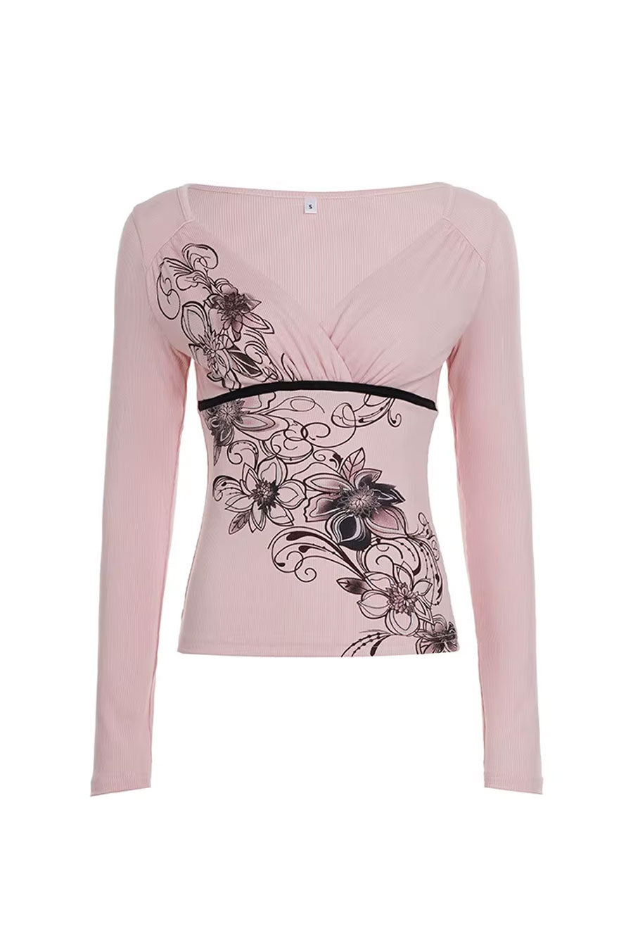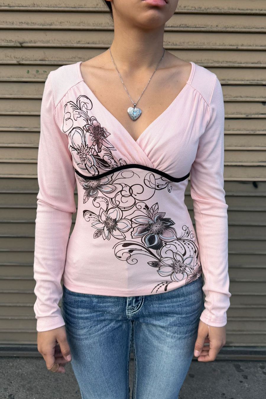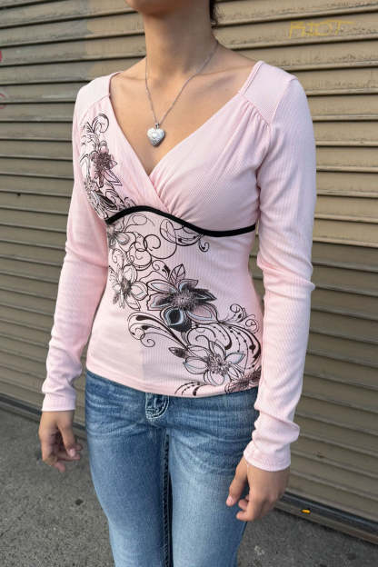 - Style Description: 2000s Vintage Floral Print Long Sleeve Ribbed Surplice Top with Contrast Detail