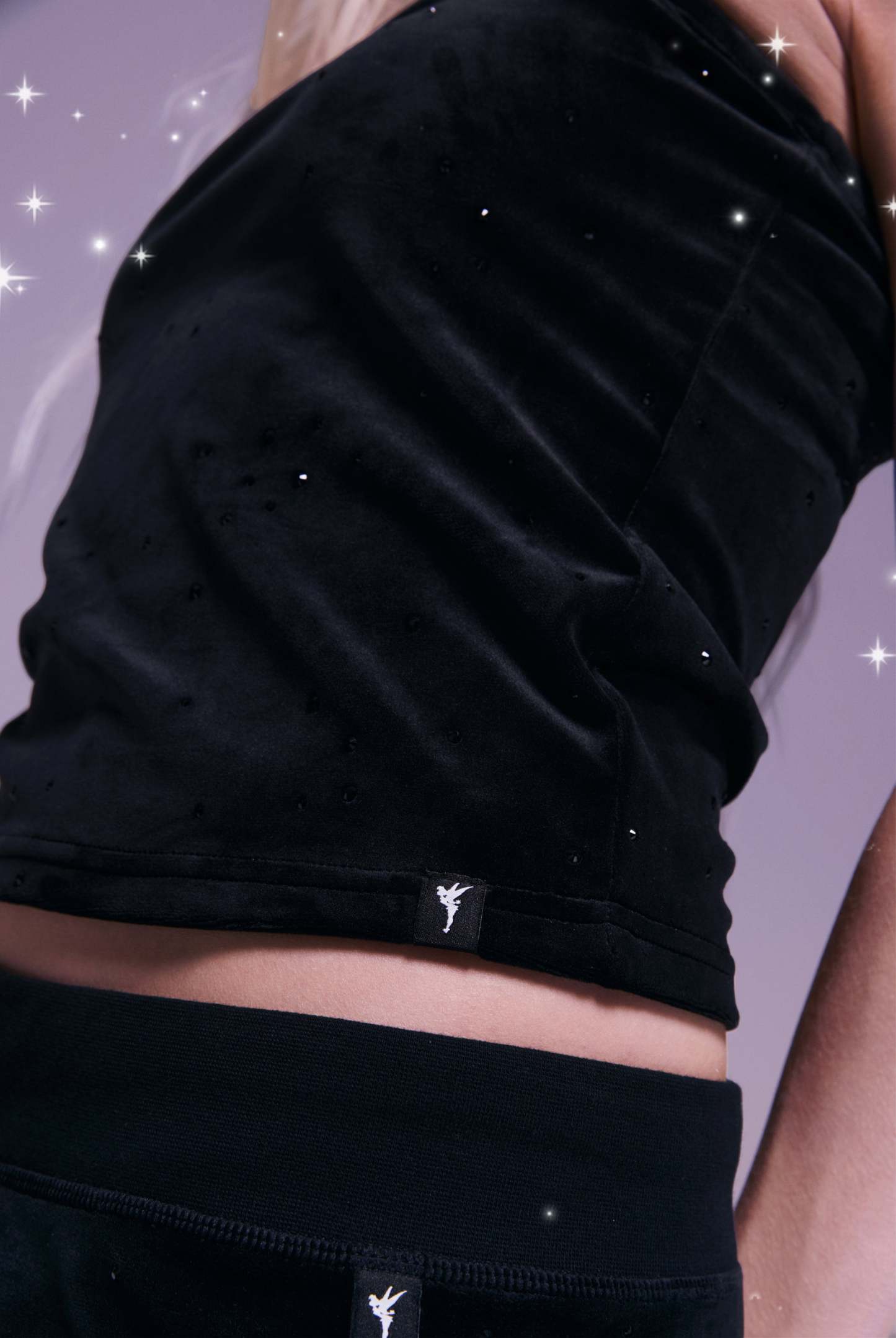 Bandeau top in black classic velour. This strapless top features all over scatter tonal diamantes and tonal embroidered Juicy logo to front.