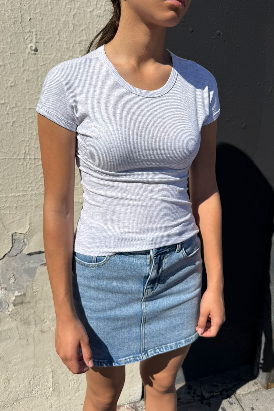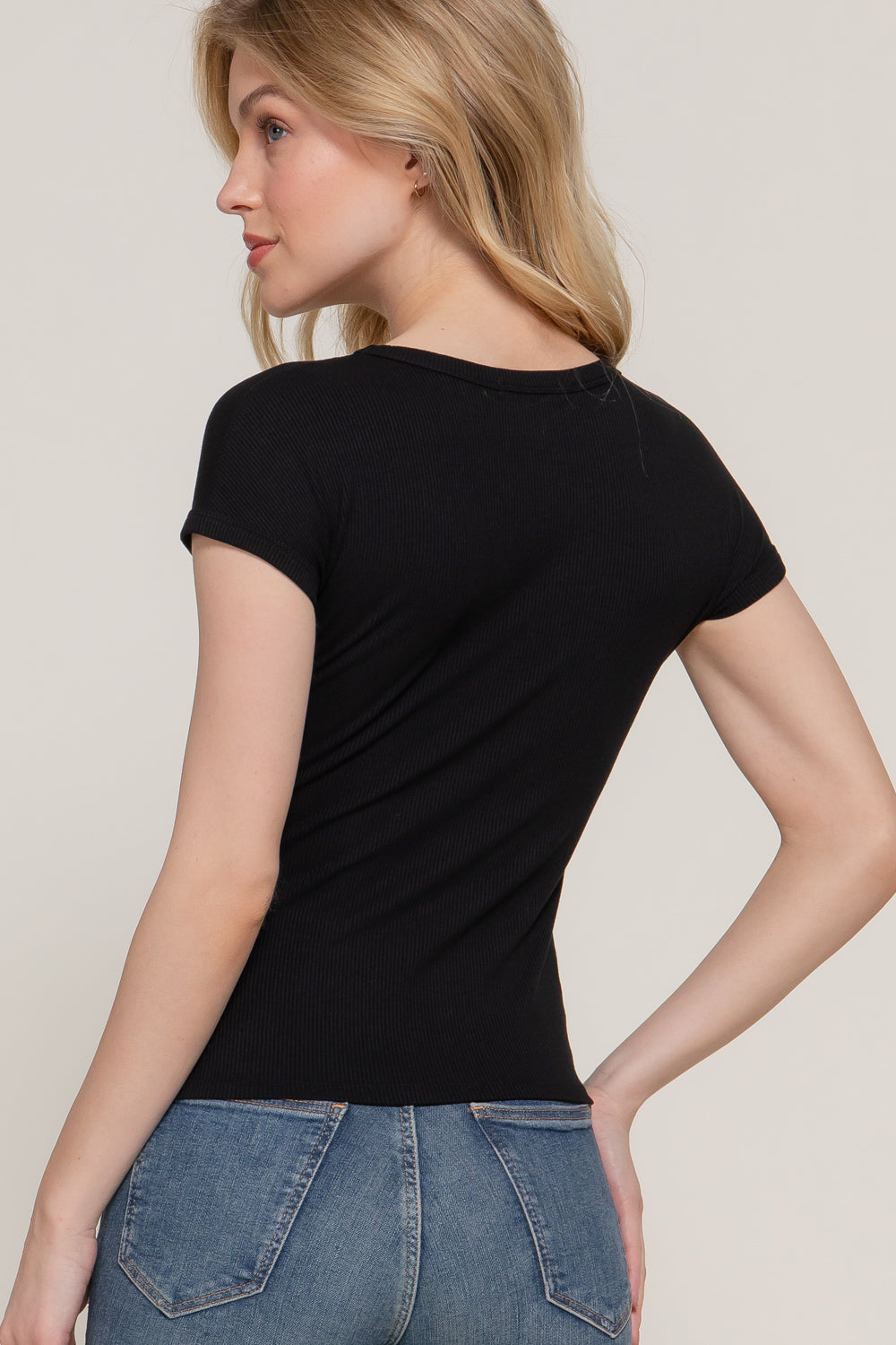 Description: Basic Short Sleeve Crew Neck Fitted Rib Knit Top