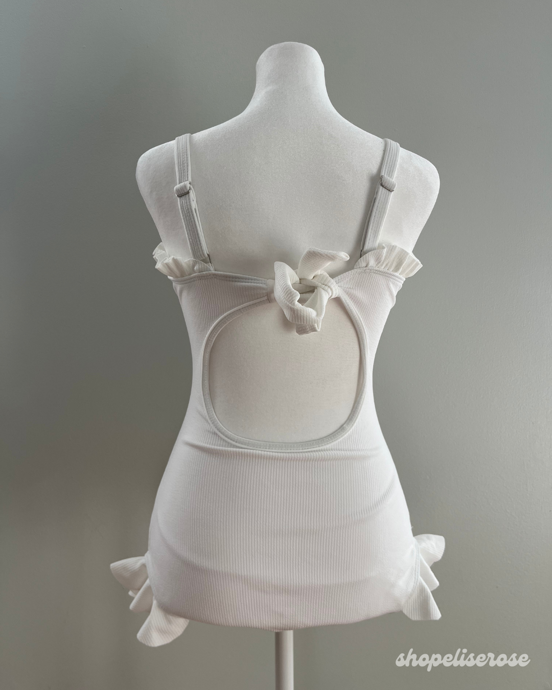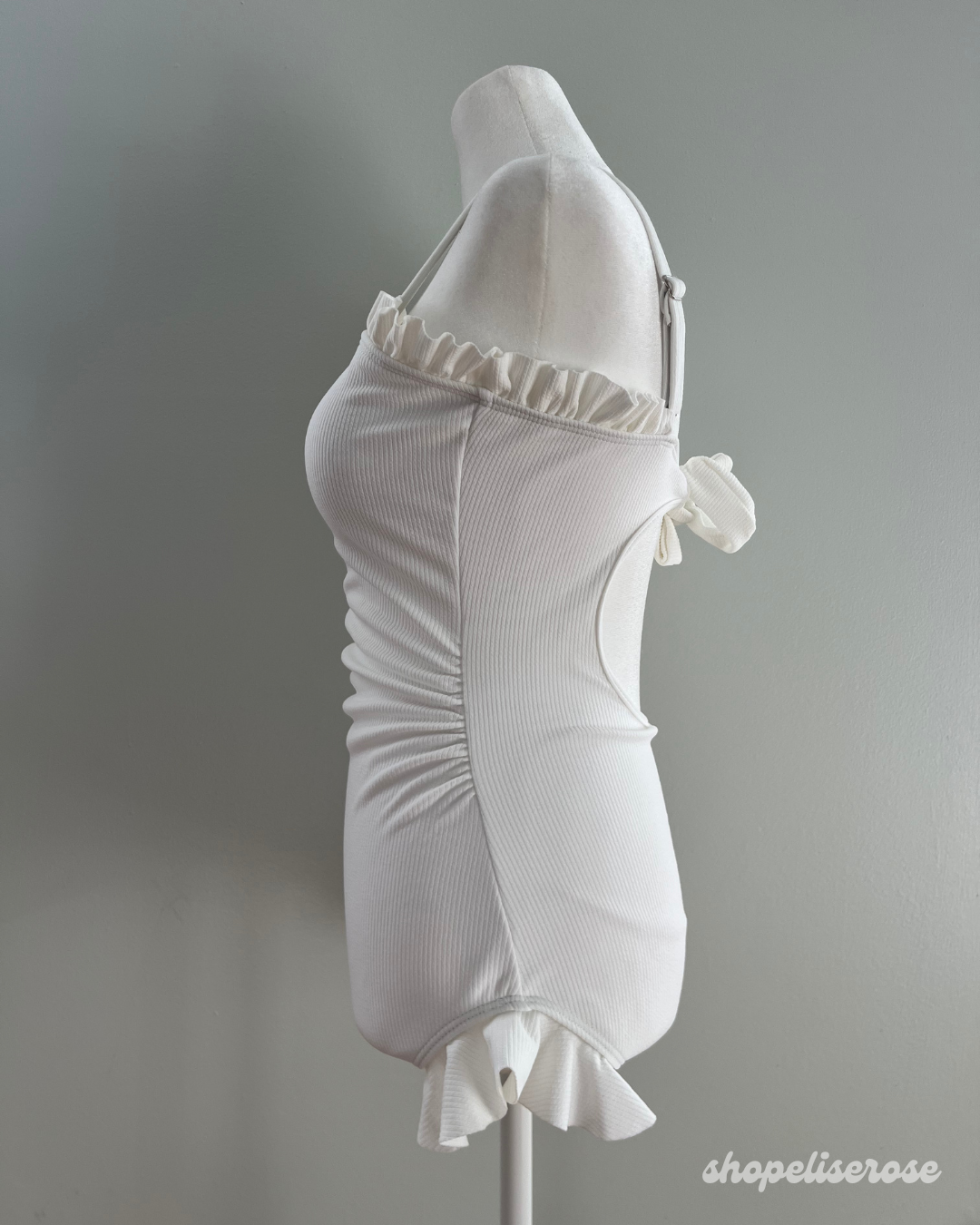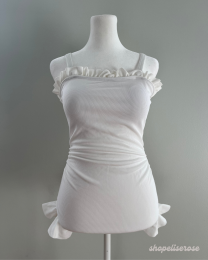 This soft white swimsuit is just gorgeous and features frilled edges. The Belle swimsuit is a great alternative to the Pearl swimsuit if you do not want a sheerer look! It's made with thick fabric and does not have removable pads.