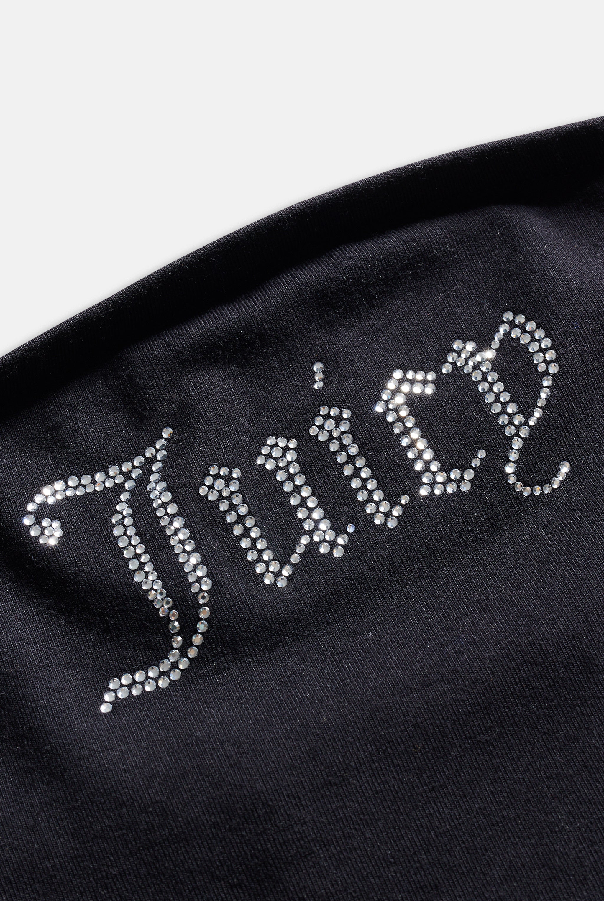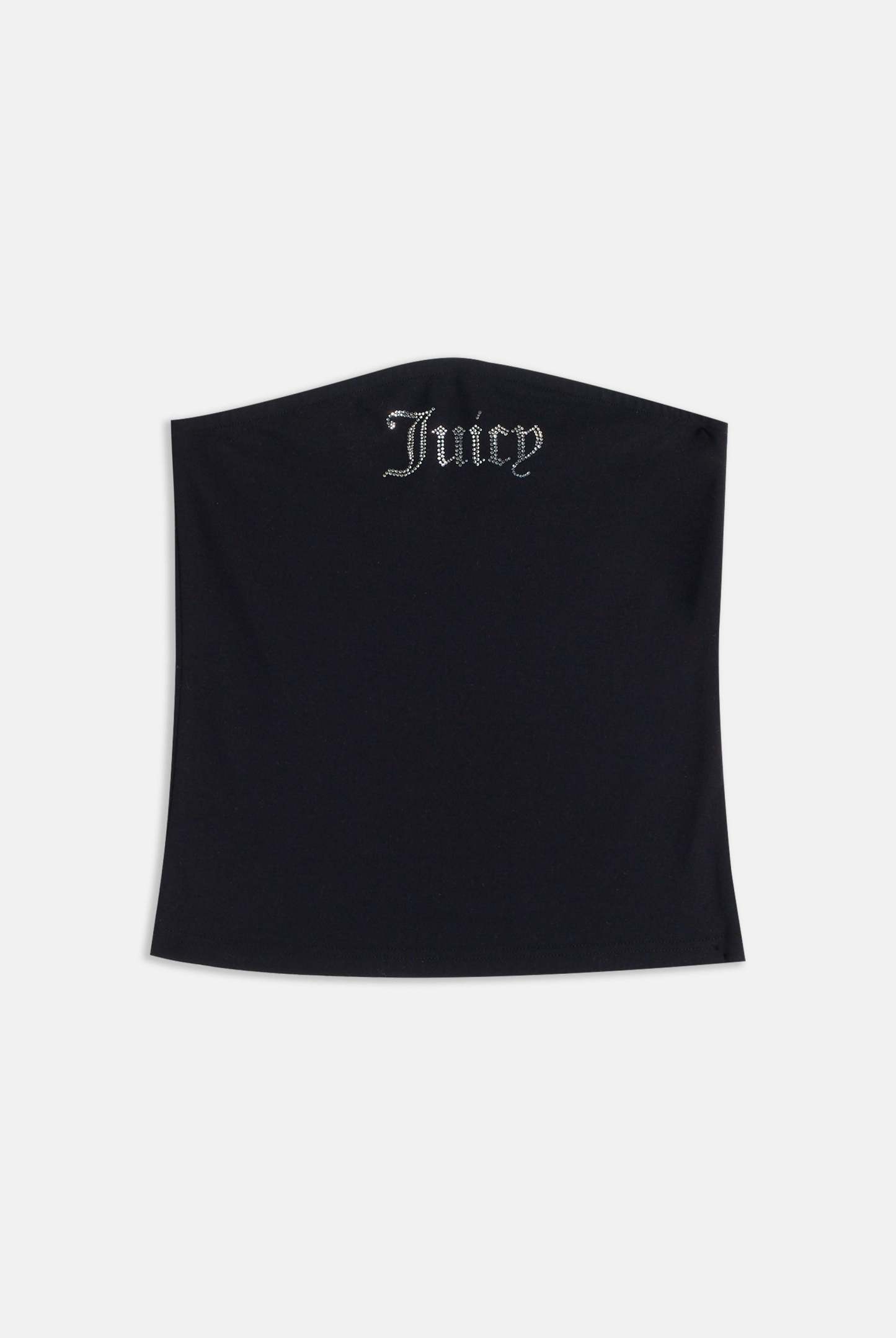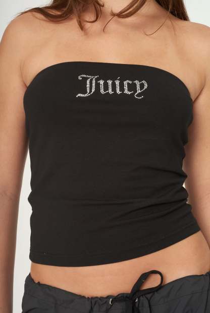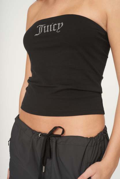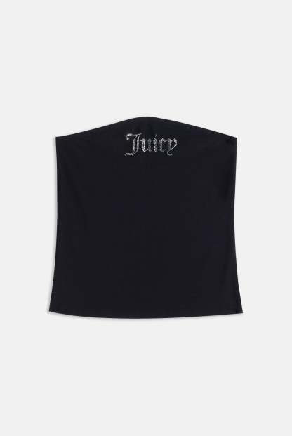Diamanté embellished tube top in black fitted jersey. Elasticated through top edge for a secure fit, this regular bandeau features a statement Juicy Couture silver crystal diamanté branding across the chest.
