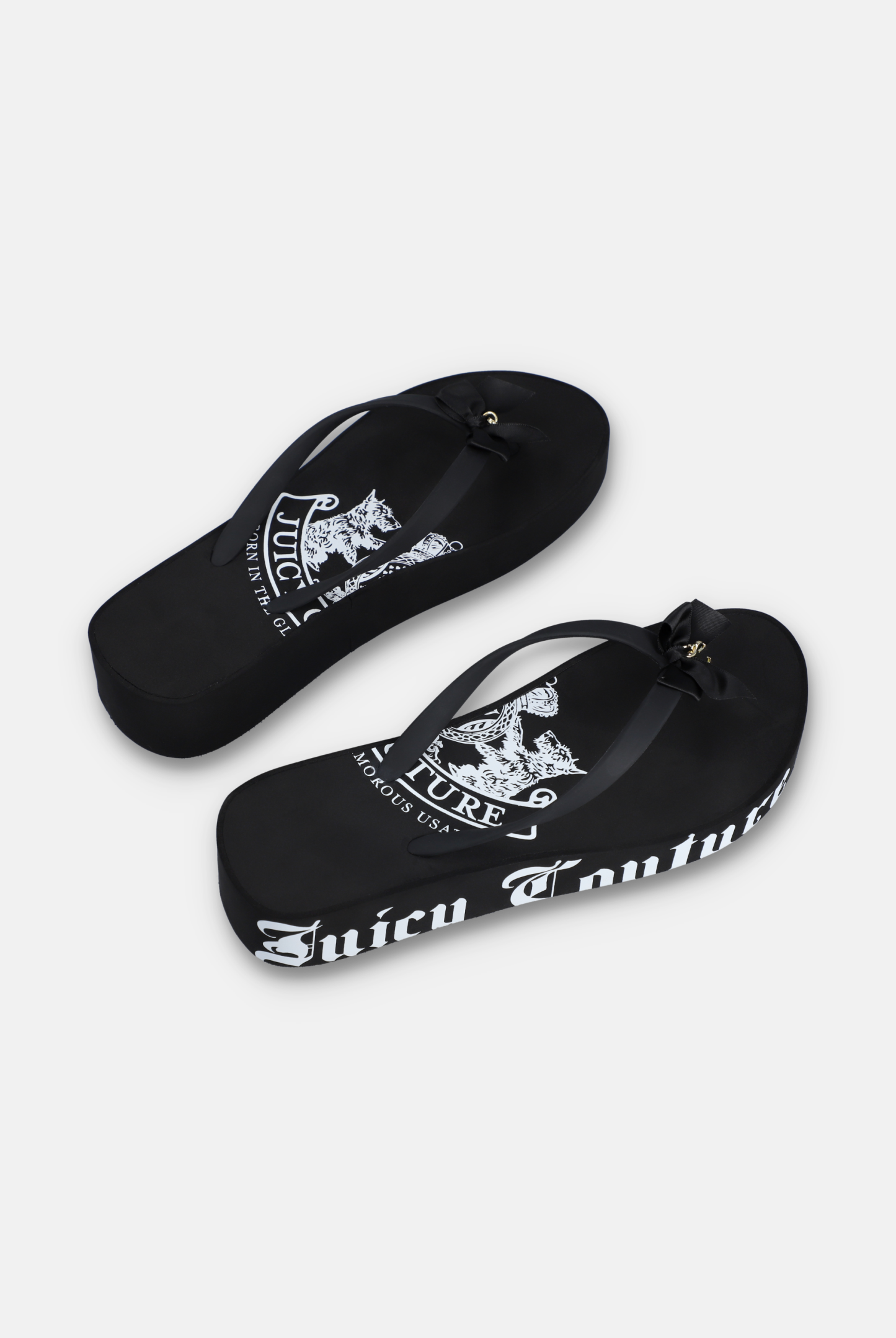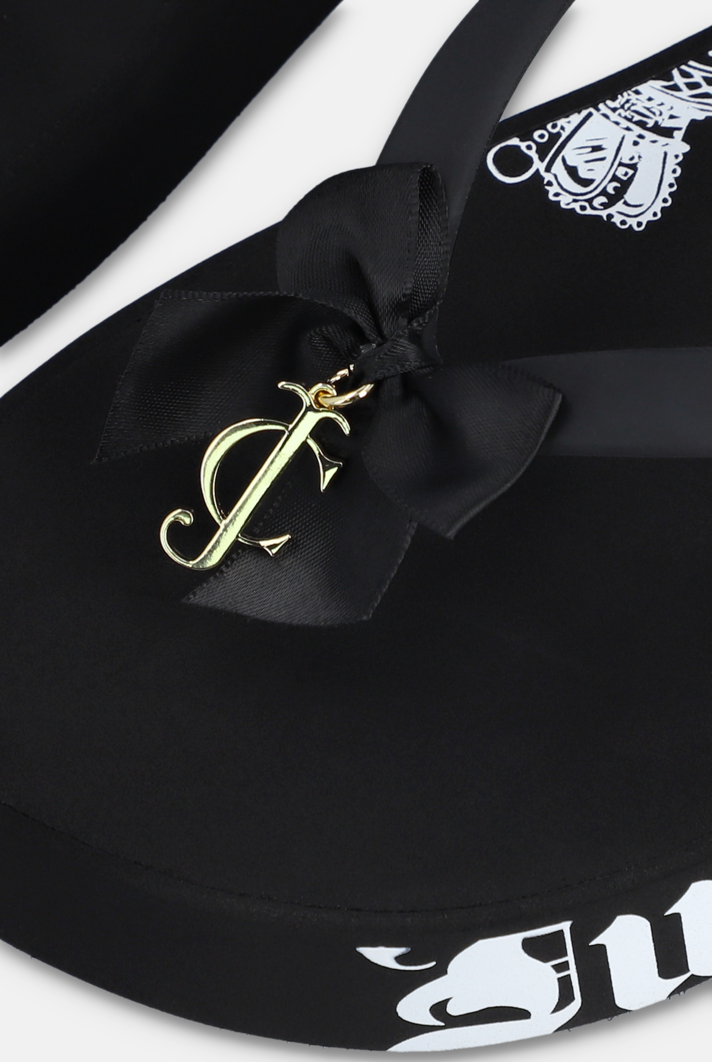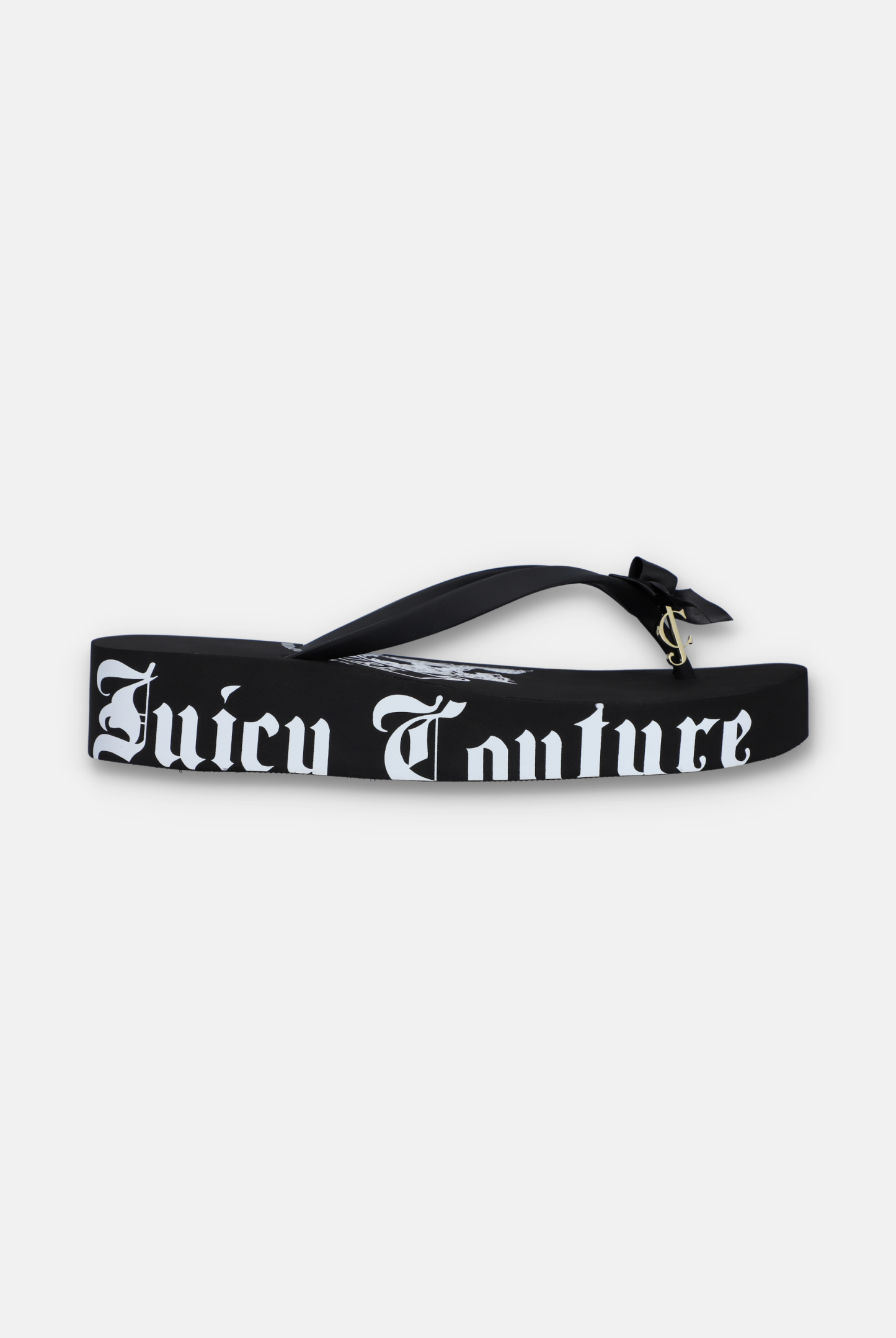 Black platform wedge with decorative bow & JC charm. Finished with a printed Juicy Couture graphic to outside sole.