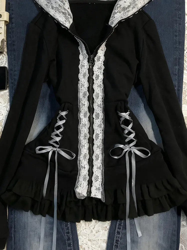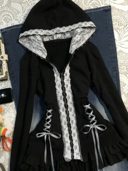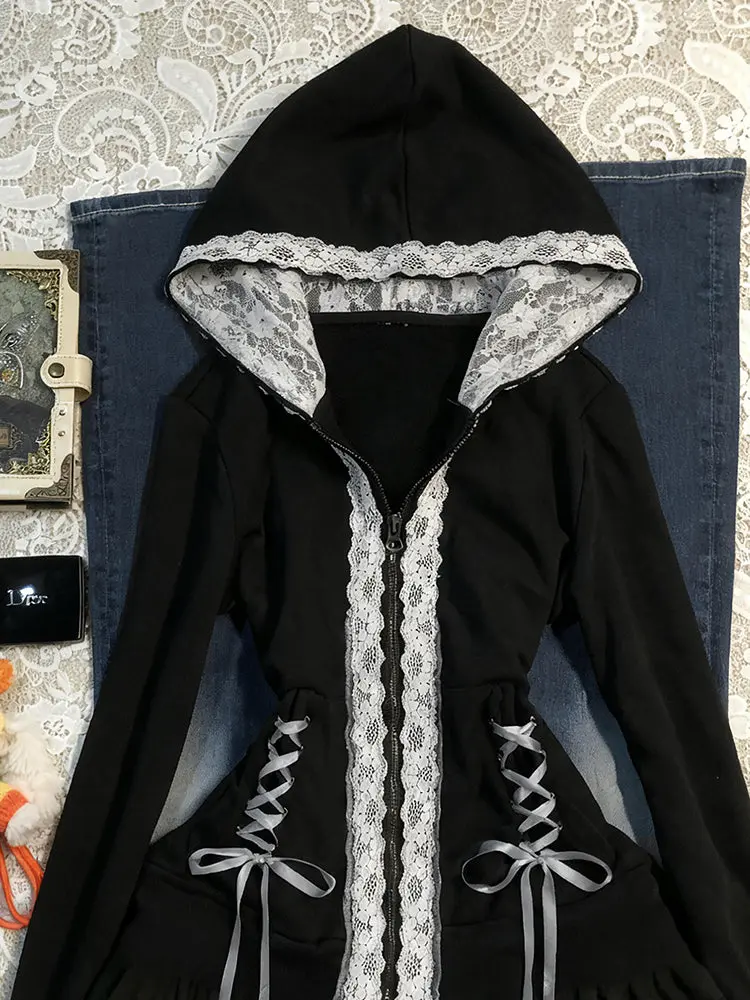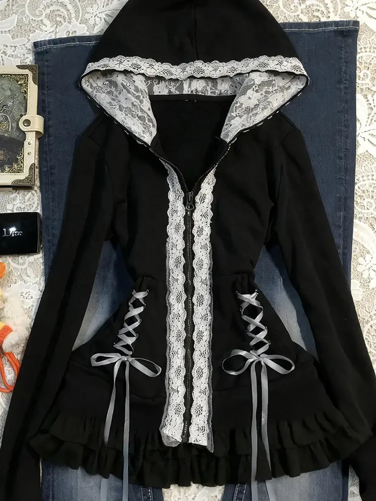 Retro-inspired hooded fleece jacket featuring delicate lace trim details for a refined dark coquette aesthetic
