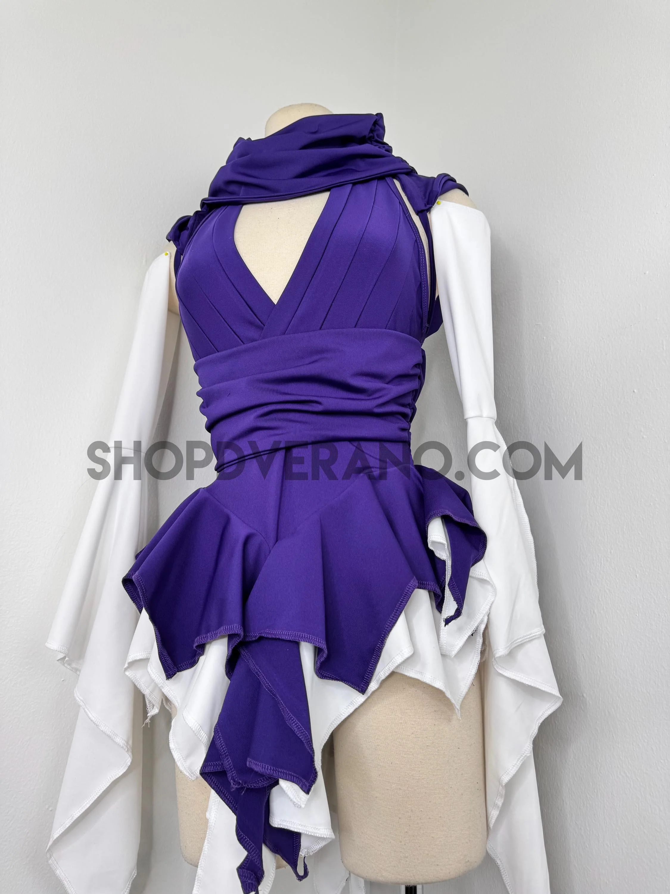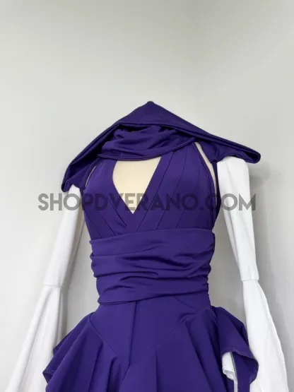 The wrapped halter bust design creates a secure and flattering fit, contouring the body with layered precision. The cinched waistband enhances your natural silhouette, while the cascading V-cut fairy panels are designed to elongate the frame and create fluid movement with every step. As you move, the layered skirt flows effortlessly, creating a striking yet graceful motion.