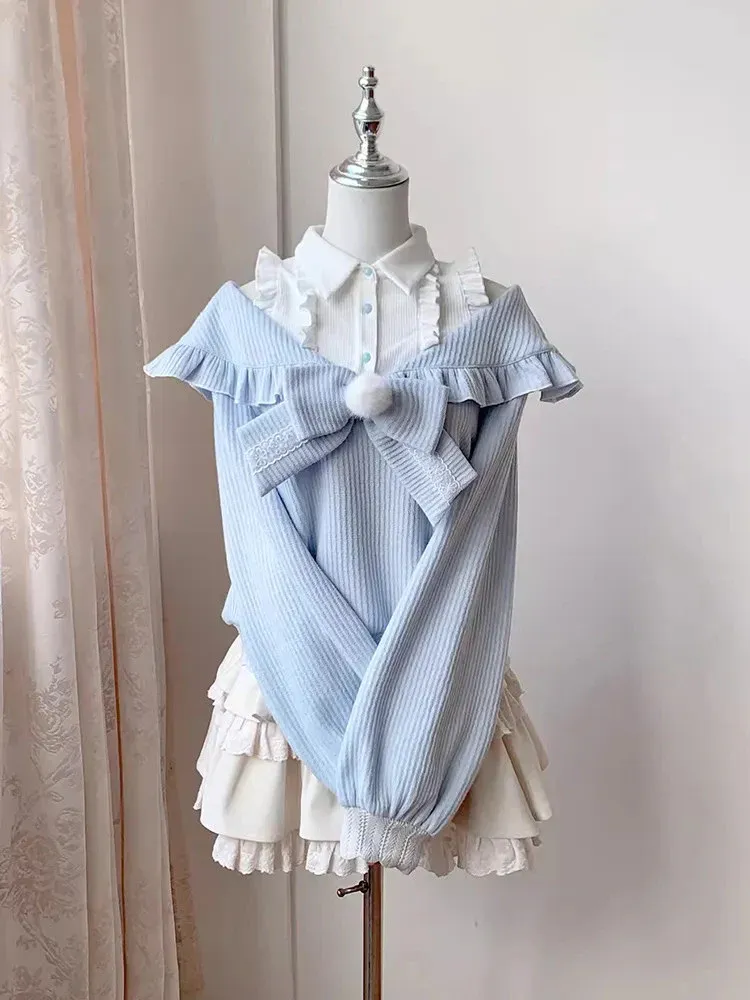 Bow-tie off-shoulder patchwork sweater and skirt two-piece set