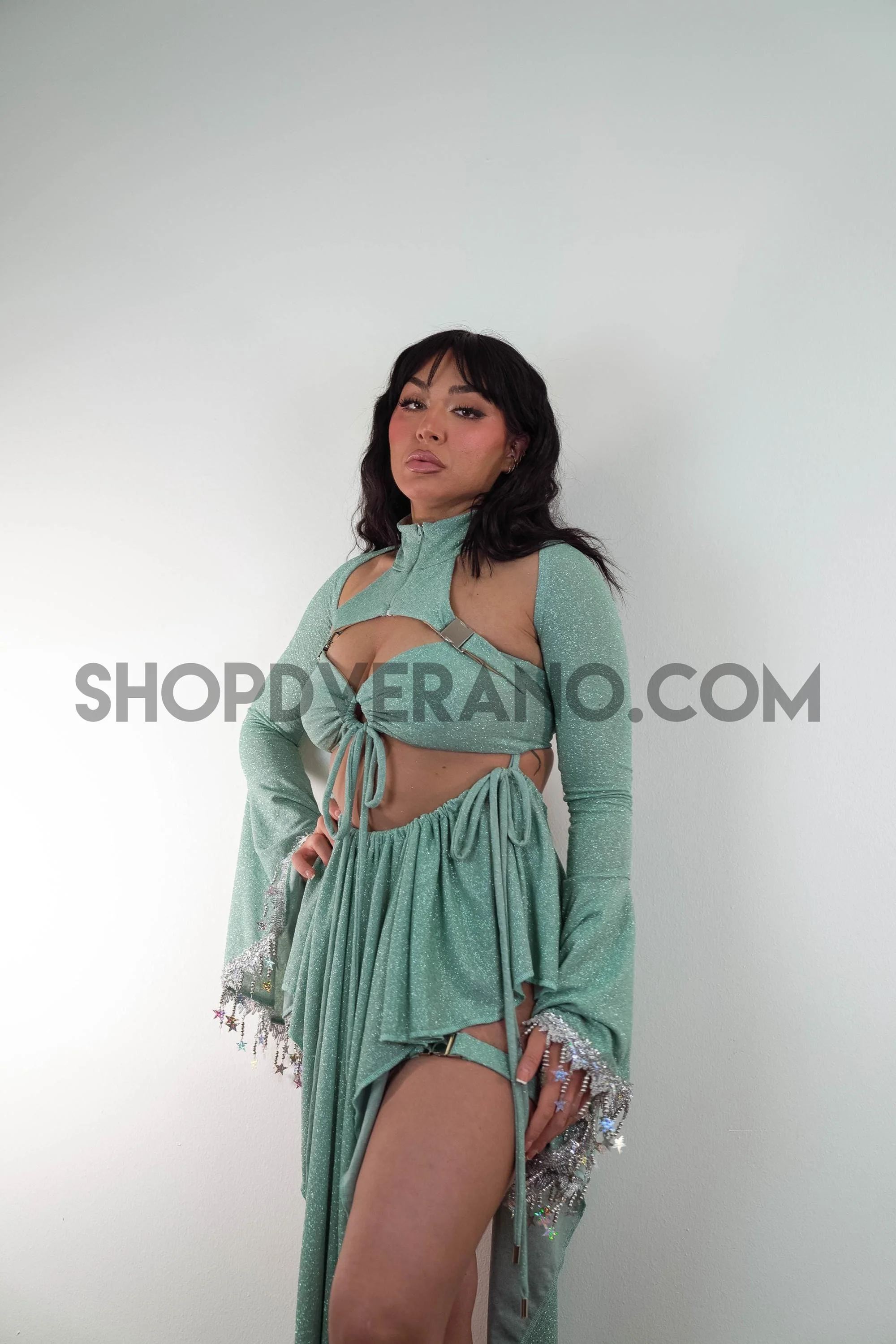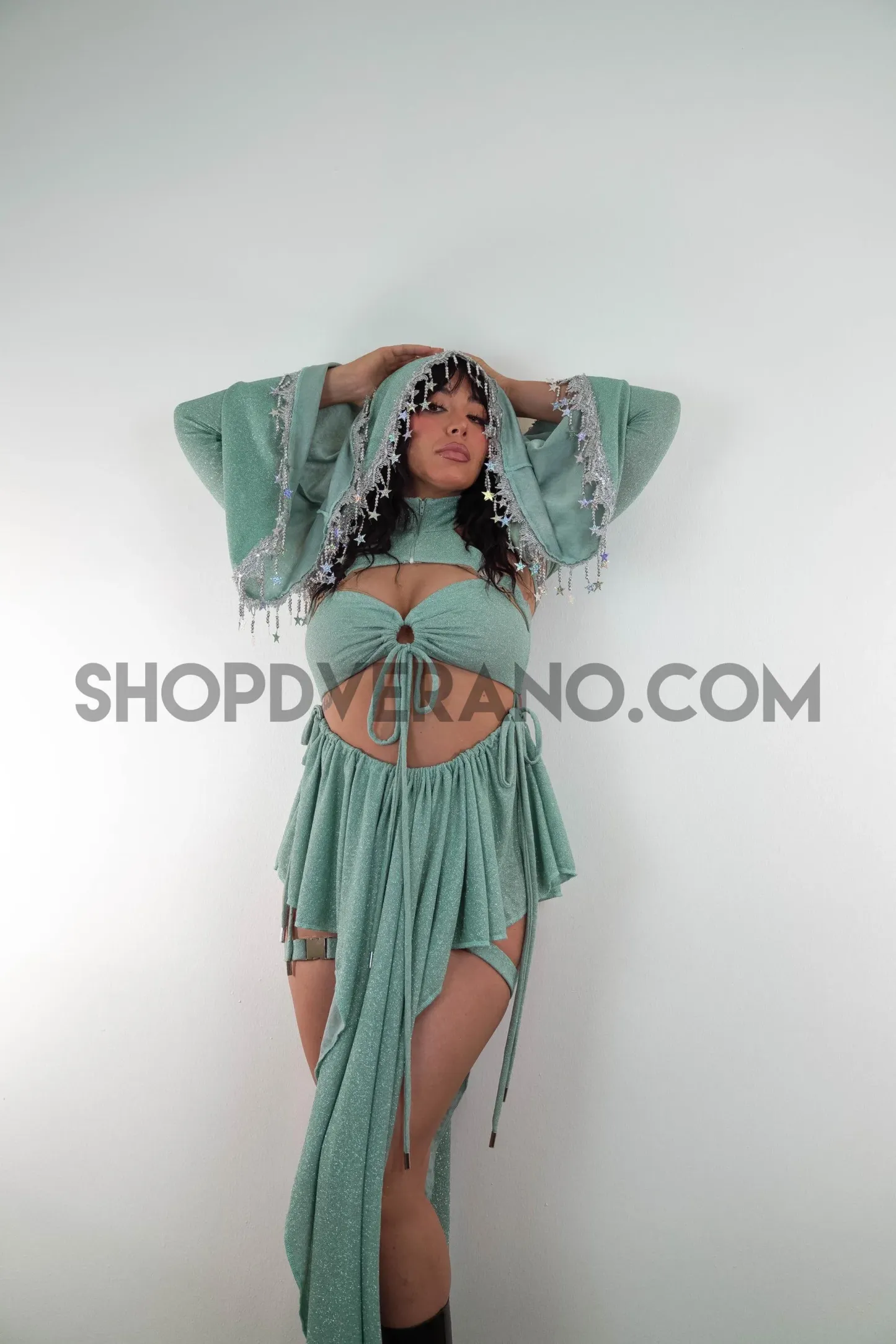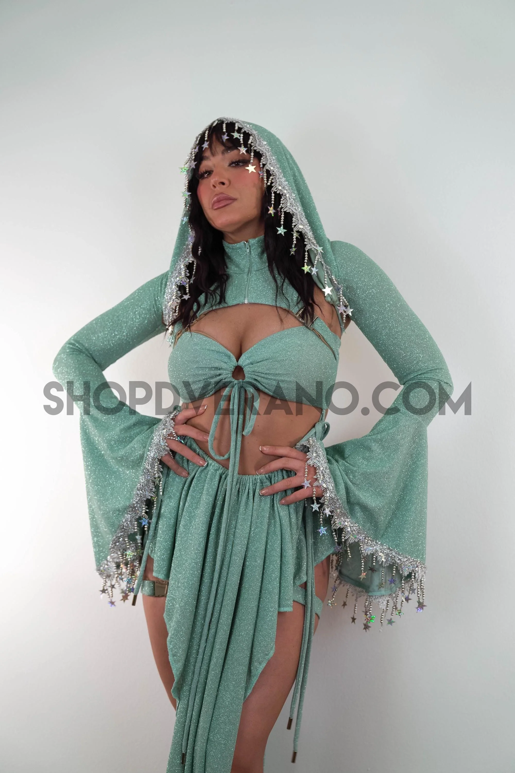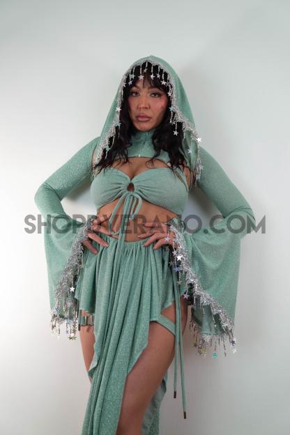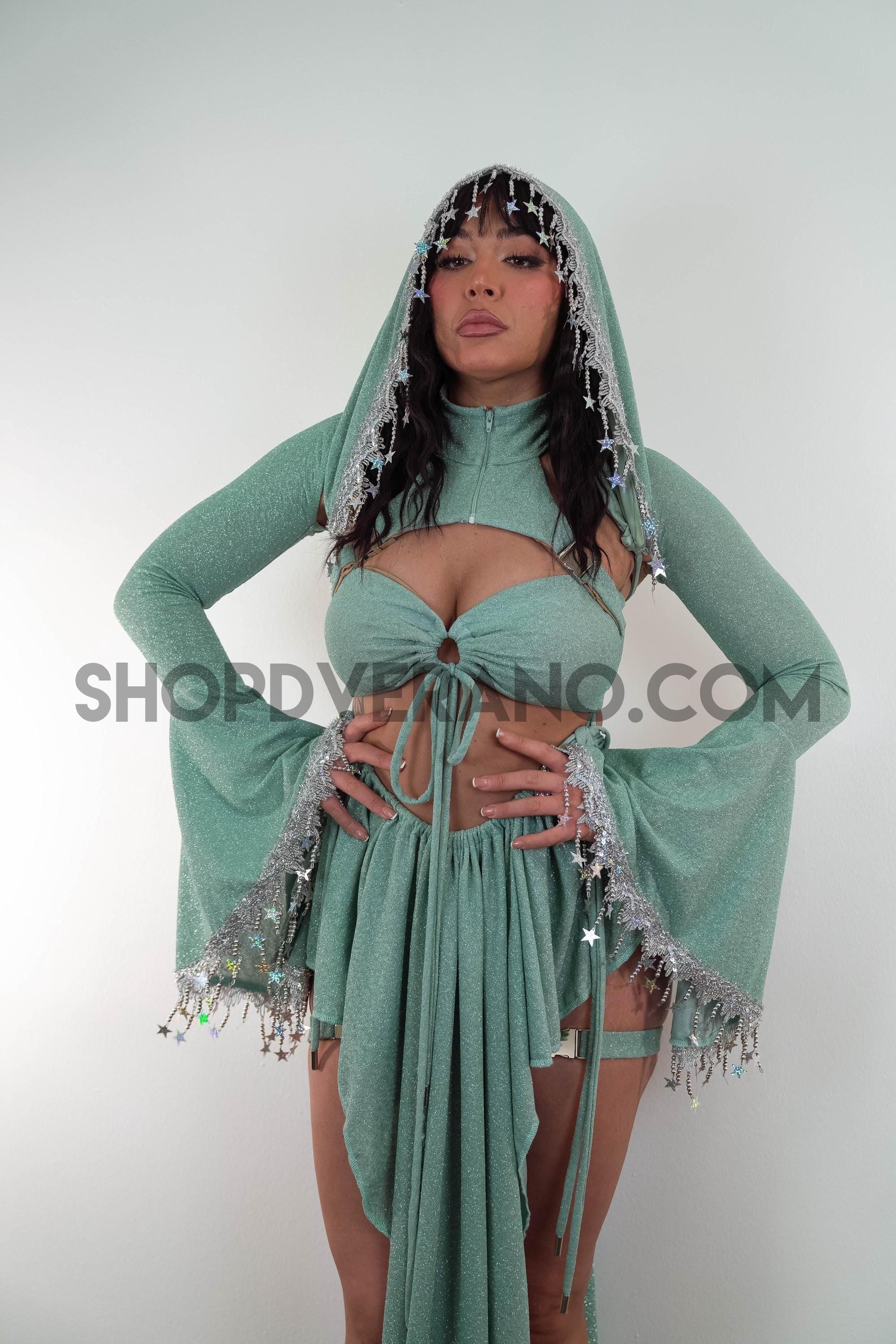 Step into your radiant, galactic fantasy with the Celestial Bloom Fairy Set, a luminous blend of ethereal charm and festival ready magic. This stunning design features a cyberpunk-inspired fairy top paired with a unique V-drape fairy skirt, expertly cut to accentuate your curves and create a sculpted, flowing silhouette that moves effortlessly with every dance and beam of light.
