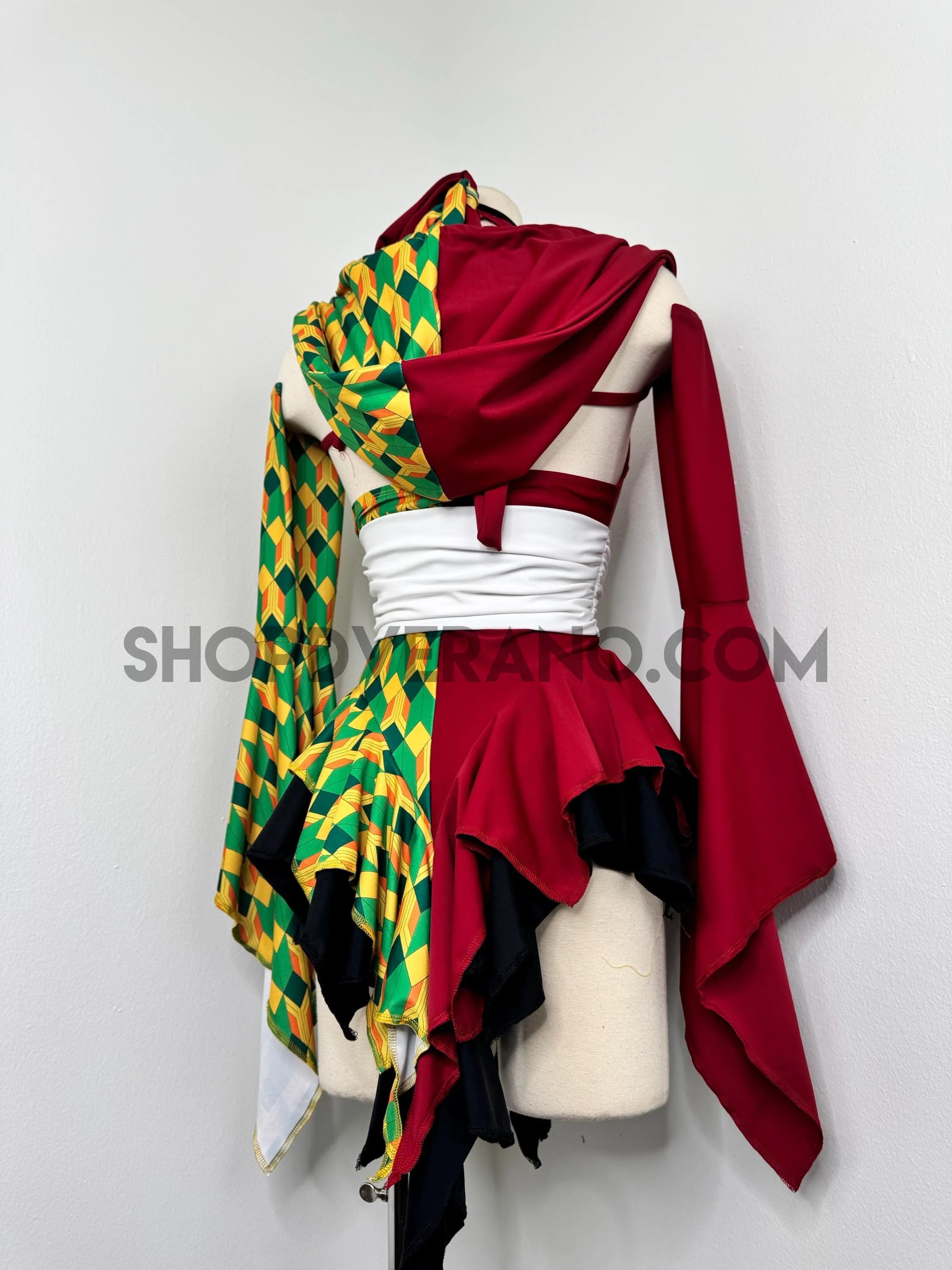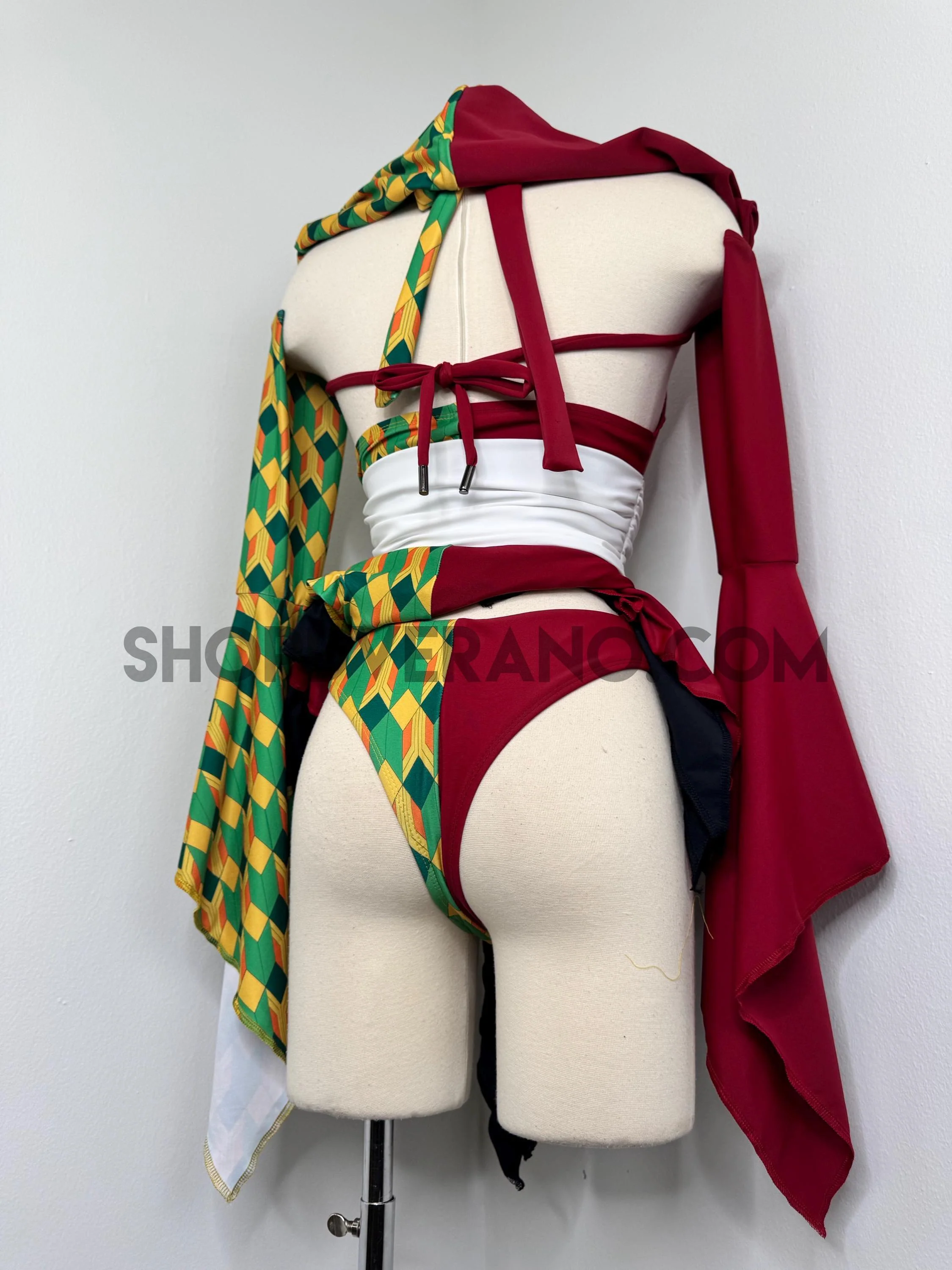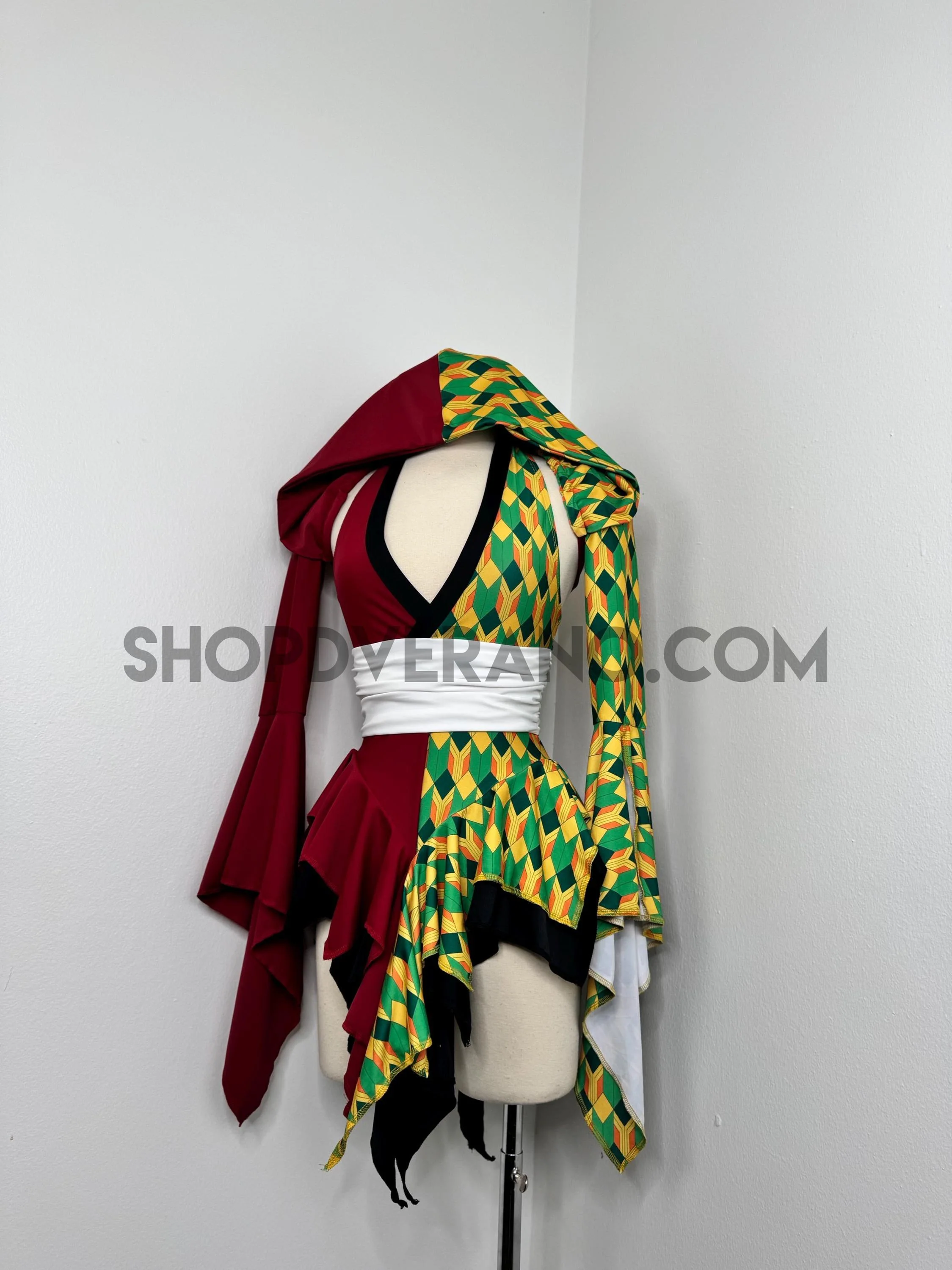 A dramatic fairy sleeve design completes the look; featuring one bold solid burgundy fairy sleeve and one with geometric print. The optional hoodie adds a mysterious, warrior inspired edge, giving the design an elevated and commanding presence.