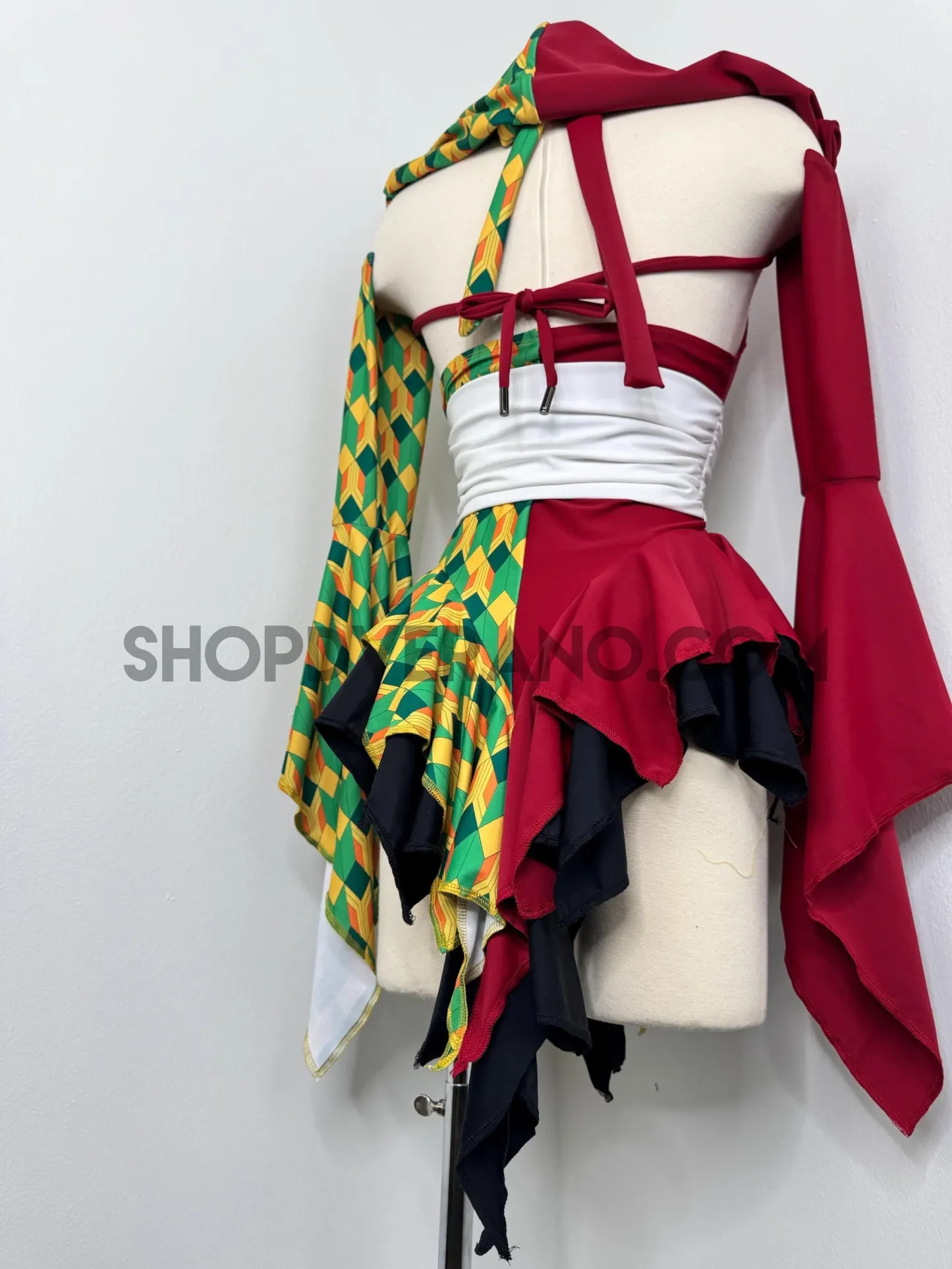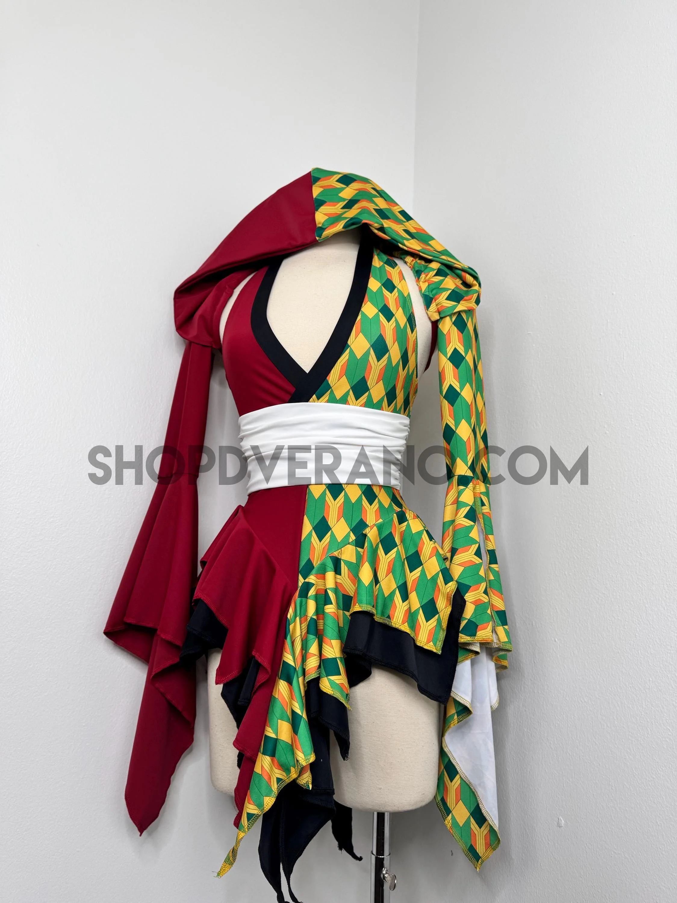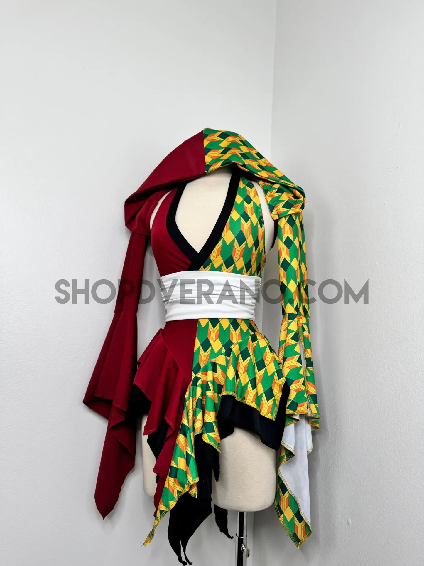 A dramatic fairy sleeve design completes the look; featuring one bold solid burgundy fairy sleeve and one with geometric print. The optional hoodie adds a mysterious, warrior inspired edge, giving the design an elevated and commanding presence.