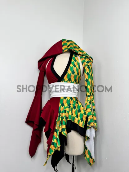 Designed with a bold asymmetrical color story, the Chilltide Fairy Set features a striking combination of half burgundy, and half emerald green & golden yellow geometric patterns, black accents, and a contrasting white waist wrap. The layered textures and contrasting panels create visual movement that reflects the balance between calm control and quiet power.