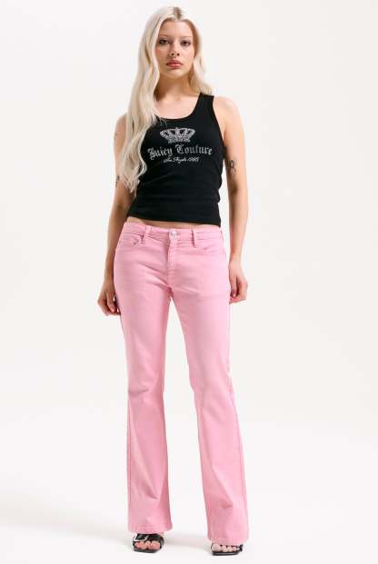 Mid- rise jeans in pink wash denim. These flared bottoms are branded with digi style Juicy logo diamante across back and feature branded rivets, and a branded metal button & zip fastening.These jeans are finished with a white branded patch to the back waistband.