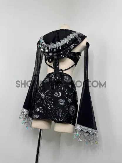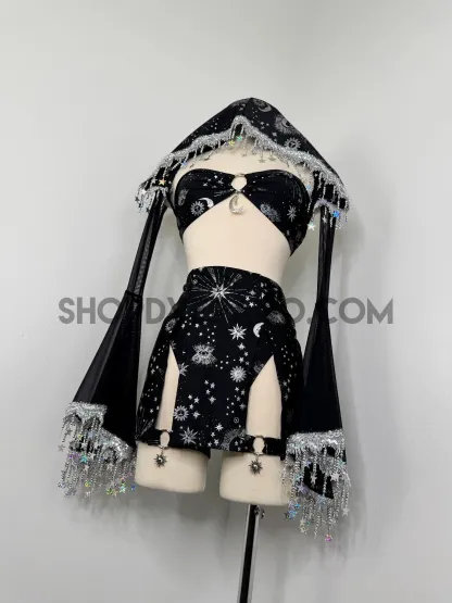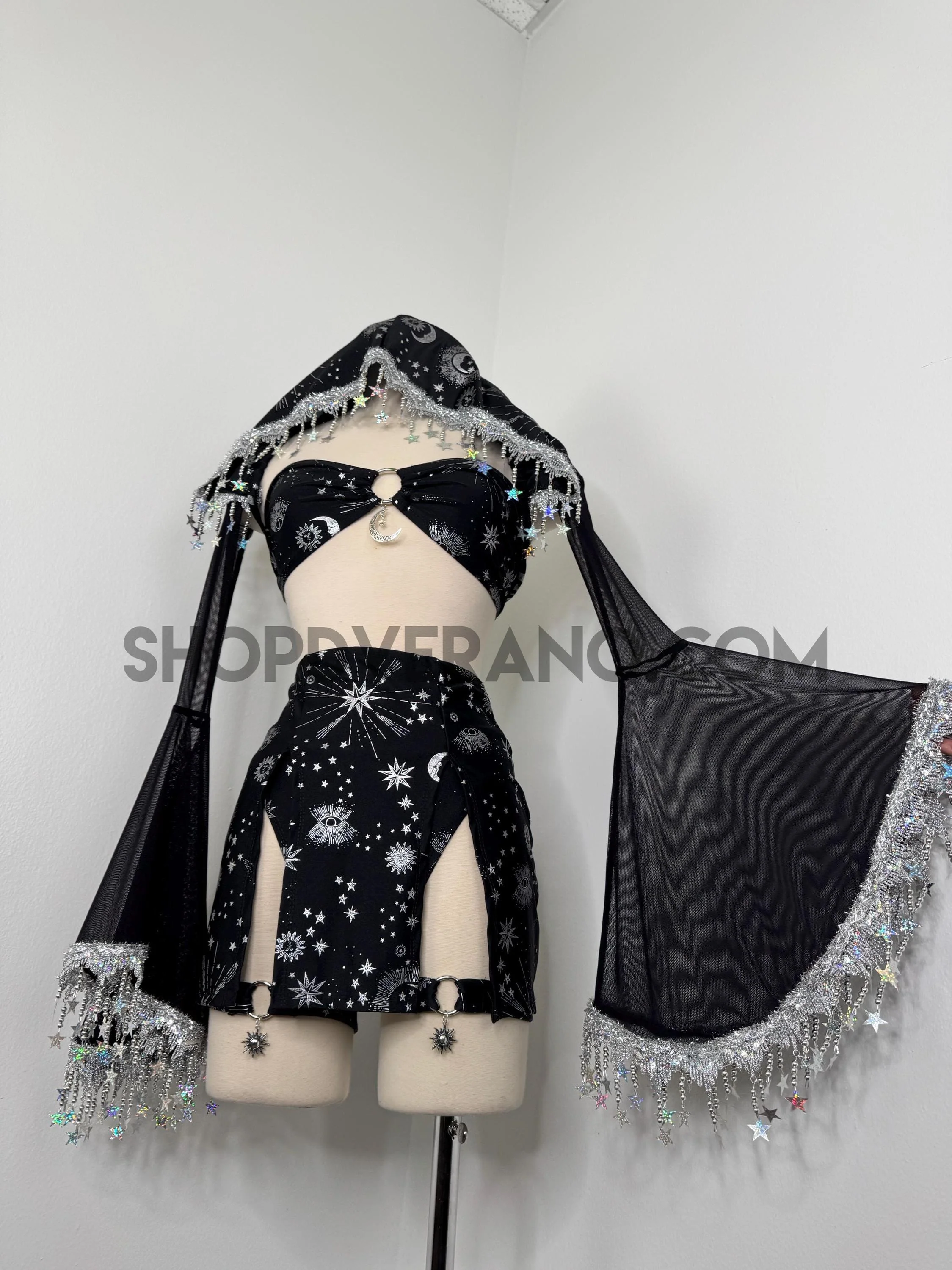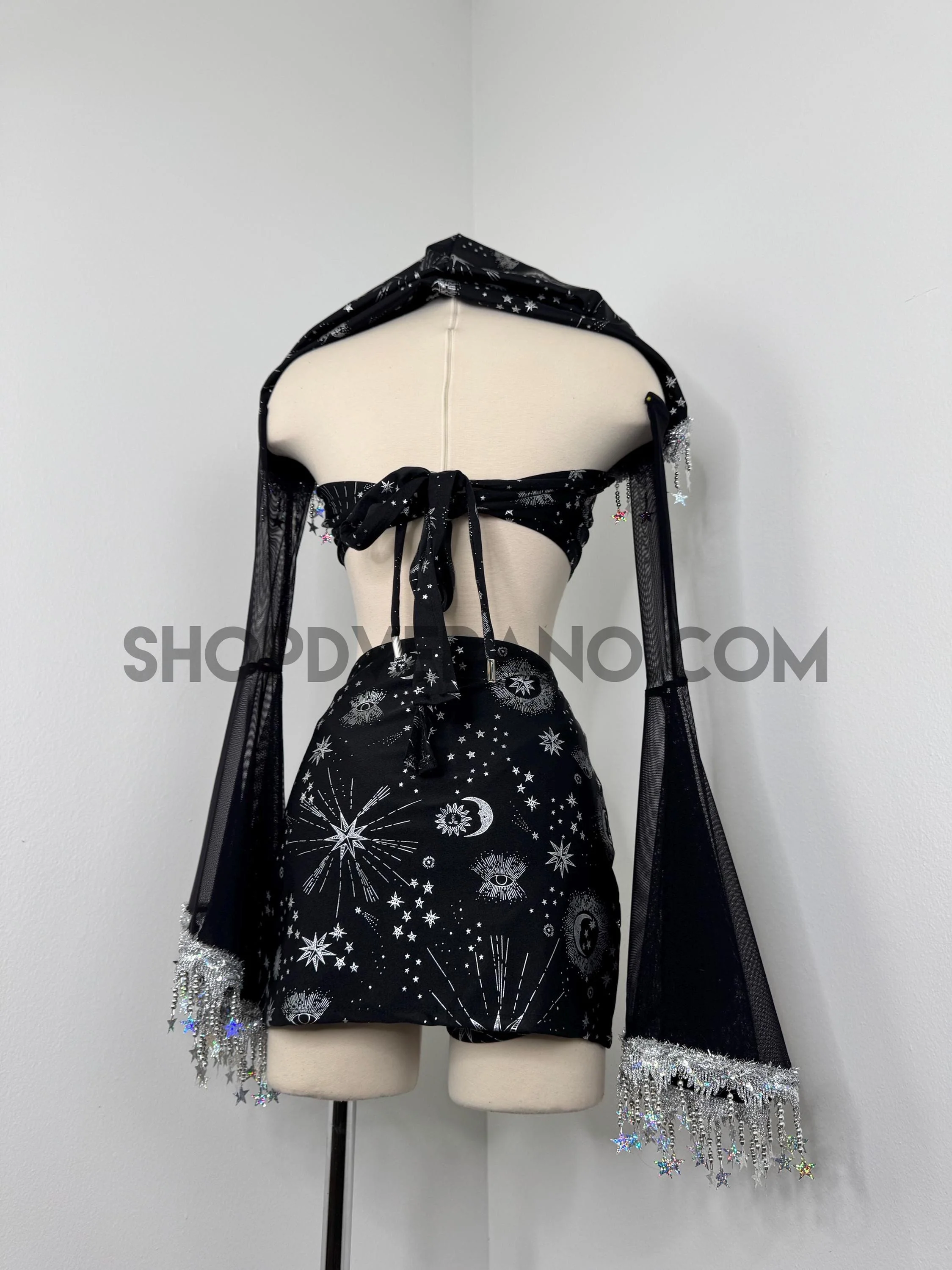 The Equinox Set is a luminous ensemble designed for those who thrive in balance ,where light meets dark and celestial energy shifts. Featuring cosmic inspired print galaxies and stars, this rave set channels moonlit magic with every step you take. Crafted to flatter and empower every body type, it’s made from high quality 4-way stretch Lycra Spandex with 230 gsm thickness, giving you a sculpted, supportive, and comfortable fit that moves with you all night long.
