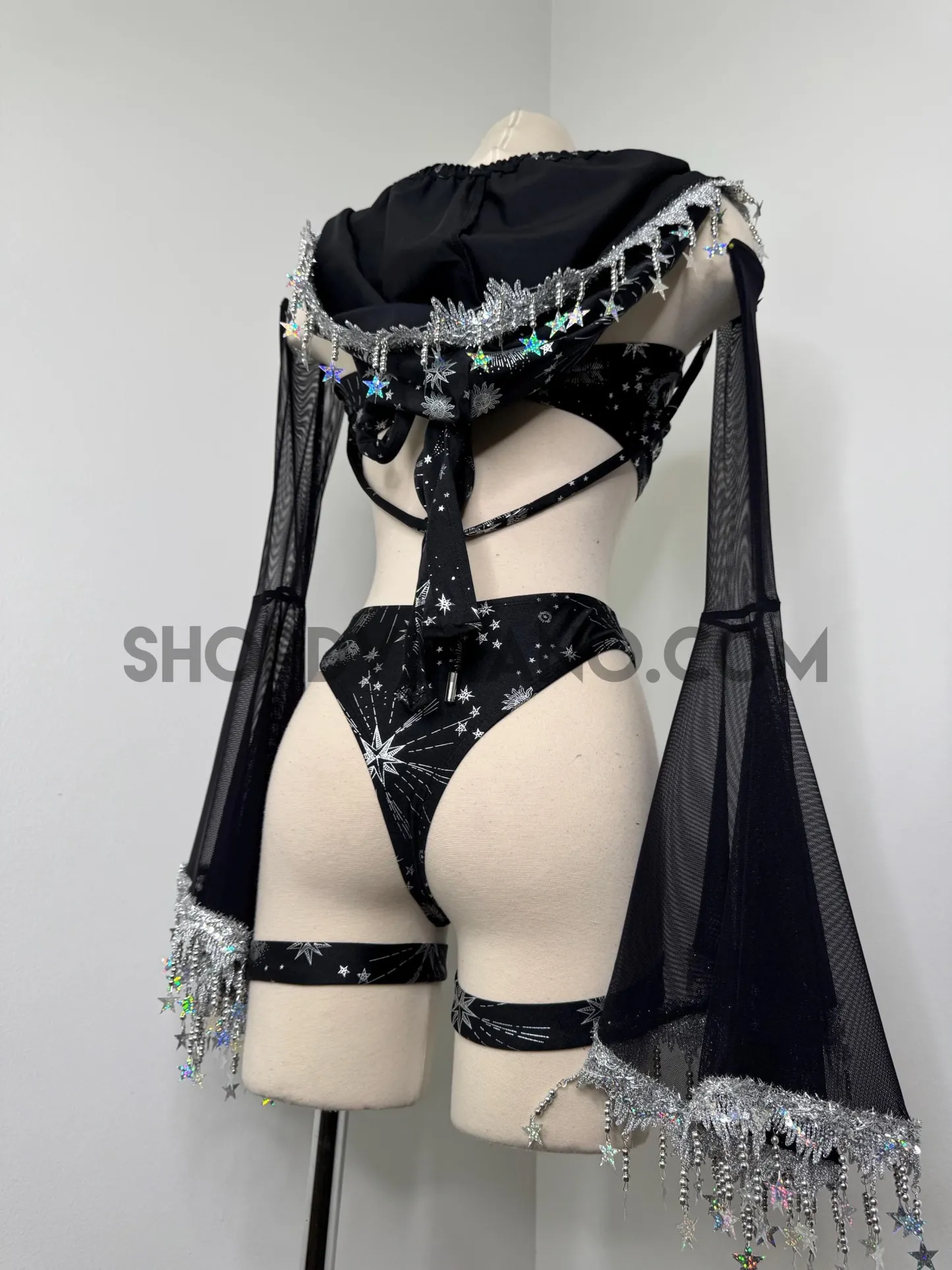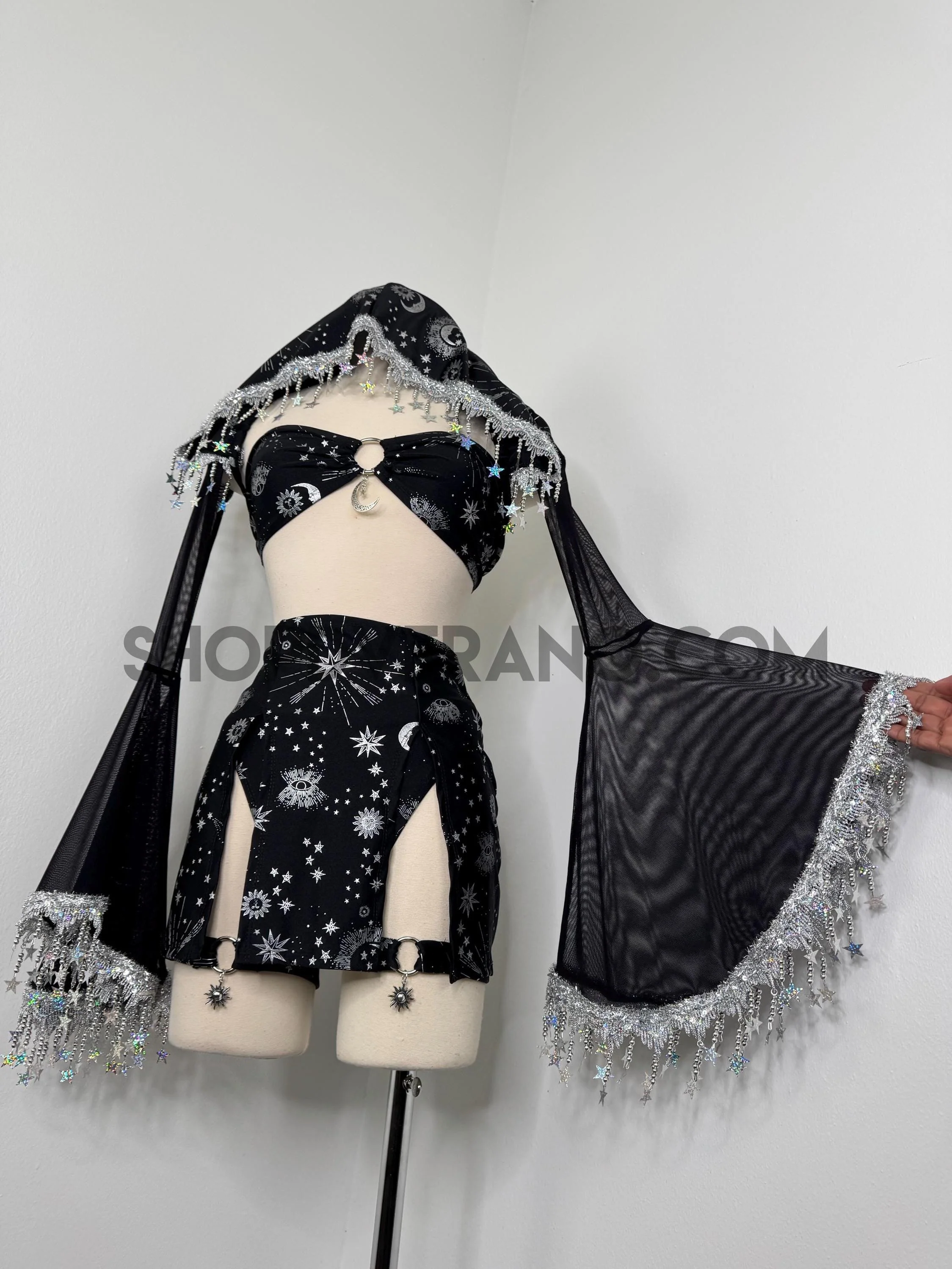 Equinox Set features a crescent moon charm at the bust, paired with silver sun charms on the leg straps for a striking contrast. The tie bandeau allows you to customize your fit, while the bikini bottoms accentuate your curves. Optional add-ons like the matching hoodie and skirt take the set to the next level for a fully styled fantasy fit.