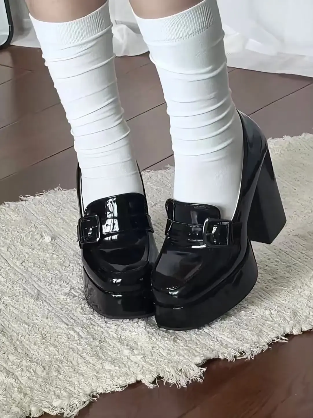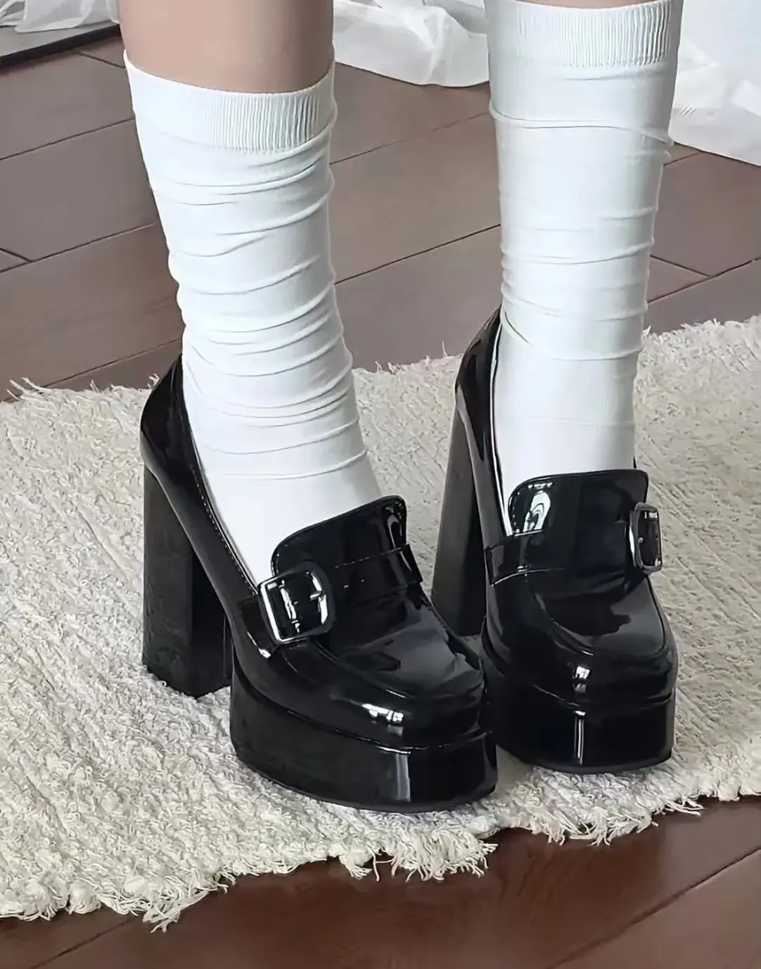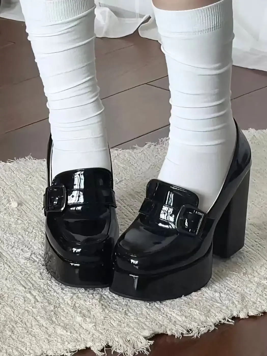 Platform Mary Jane shoes feature a clean, structured silhouette with a rounded toe and a glossy patent finish for a sharp, youthful look. The thick platform balances the high heel for stable lift, while the classic strap design keeps the profile neat and versatile. Designed for everyday styling, the elevated shape delivers confident height with a polished, wearable presence.