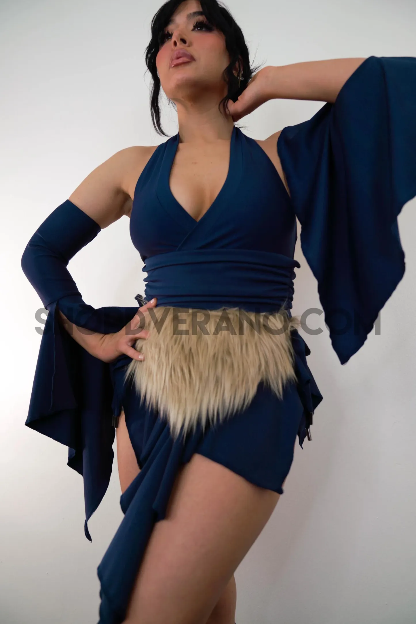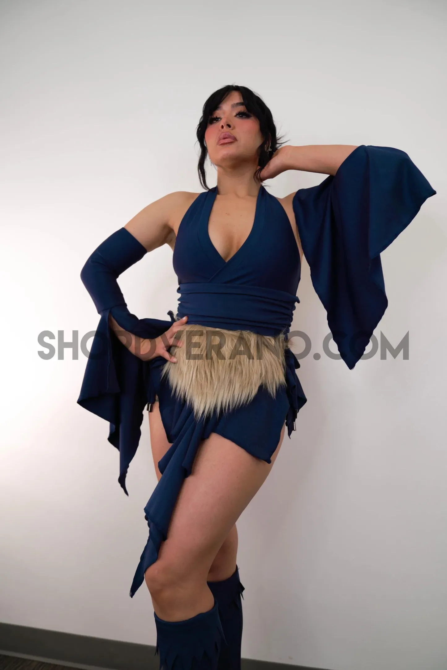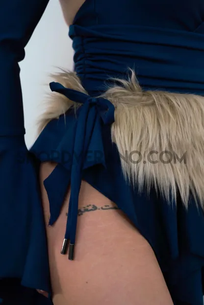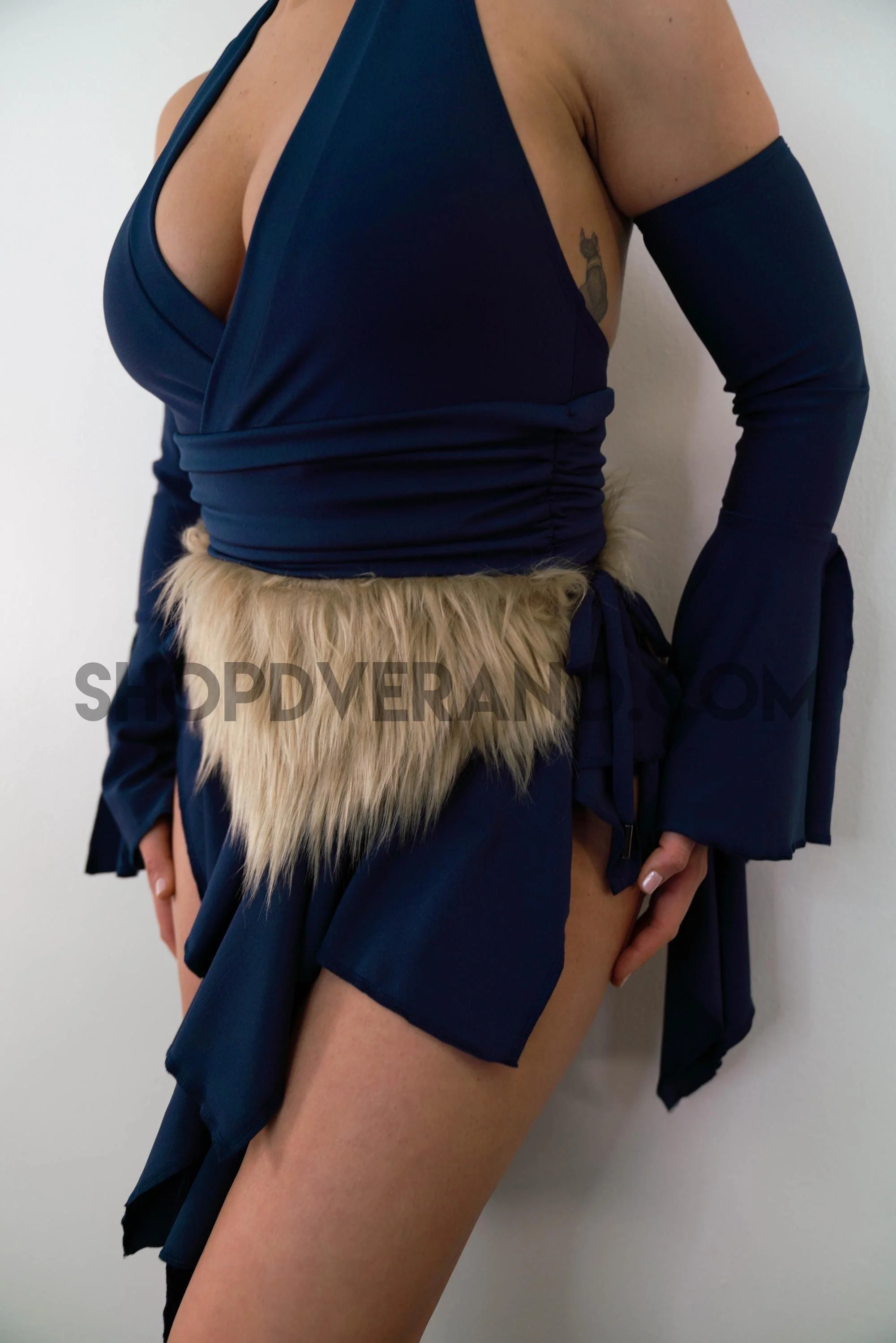 Designed in a navy tone with tan fur accent belt, the Feral Fairy Set reflects a balance between strength and freedom; grounded, yet unpredictable. Crafted from high quality 4-way stretch fabric, it hugs your curves while allowing full flexibility for movement, making it perfect for long nights of dancing, exploring, and letting loose.