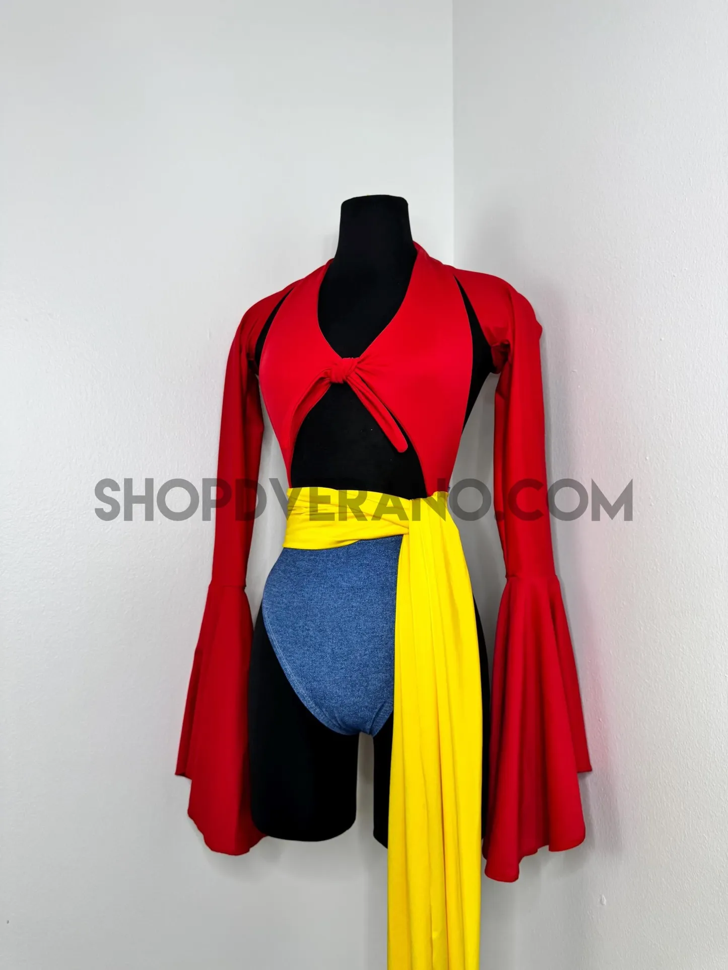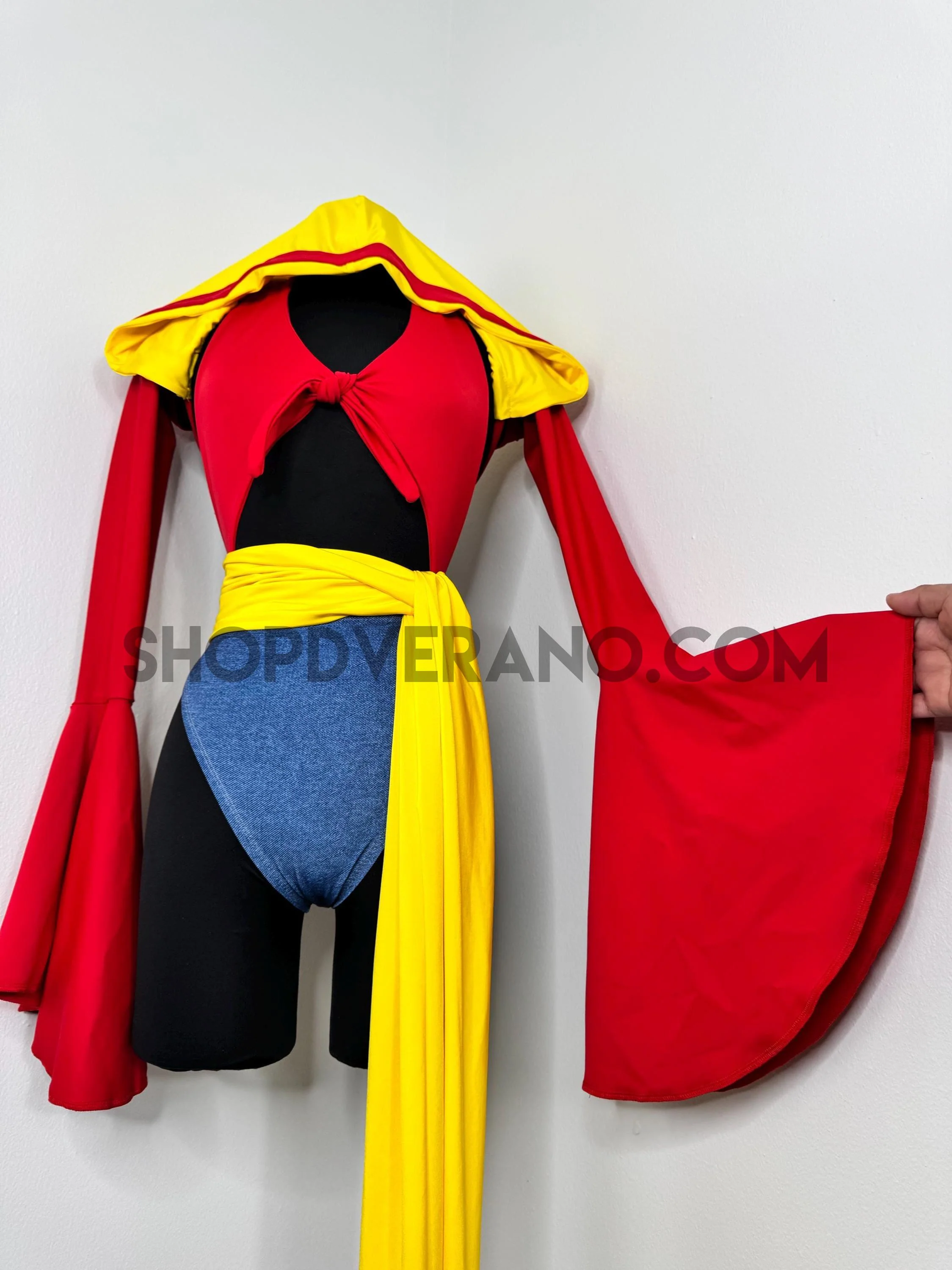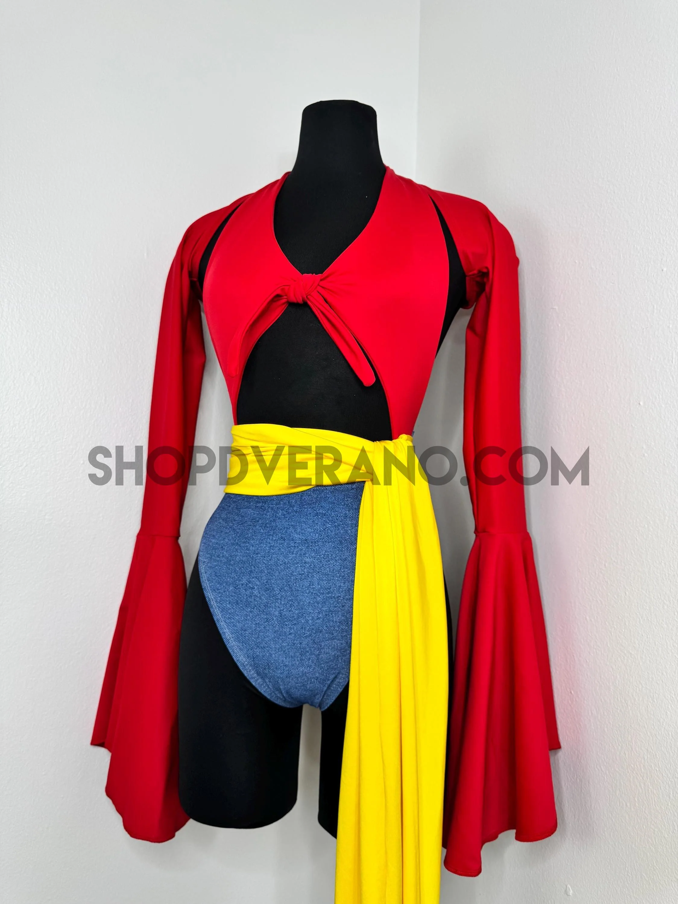 The halter style bodysuit ties at the back for an adjustable, secure fit, allowing total freedom of movement. A contrasting yellow sash style belt cinches the waist, adding definition while enhancing the playful silhouette. The look is finished with bolero style bell sleeves that add dramatic flow and movement, paired with a fully lined hoodie for versatile, layered styling.