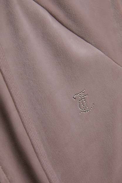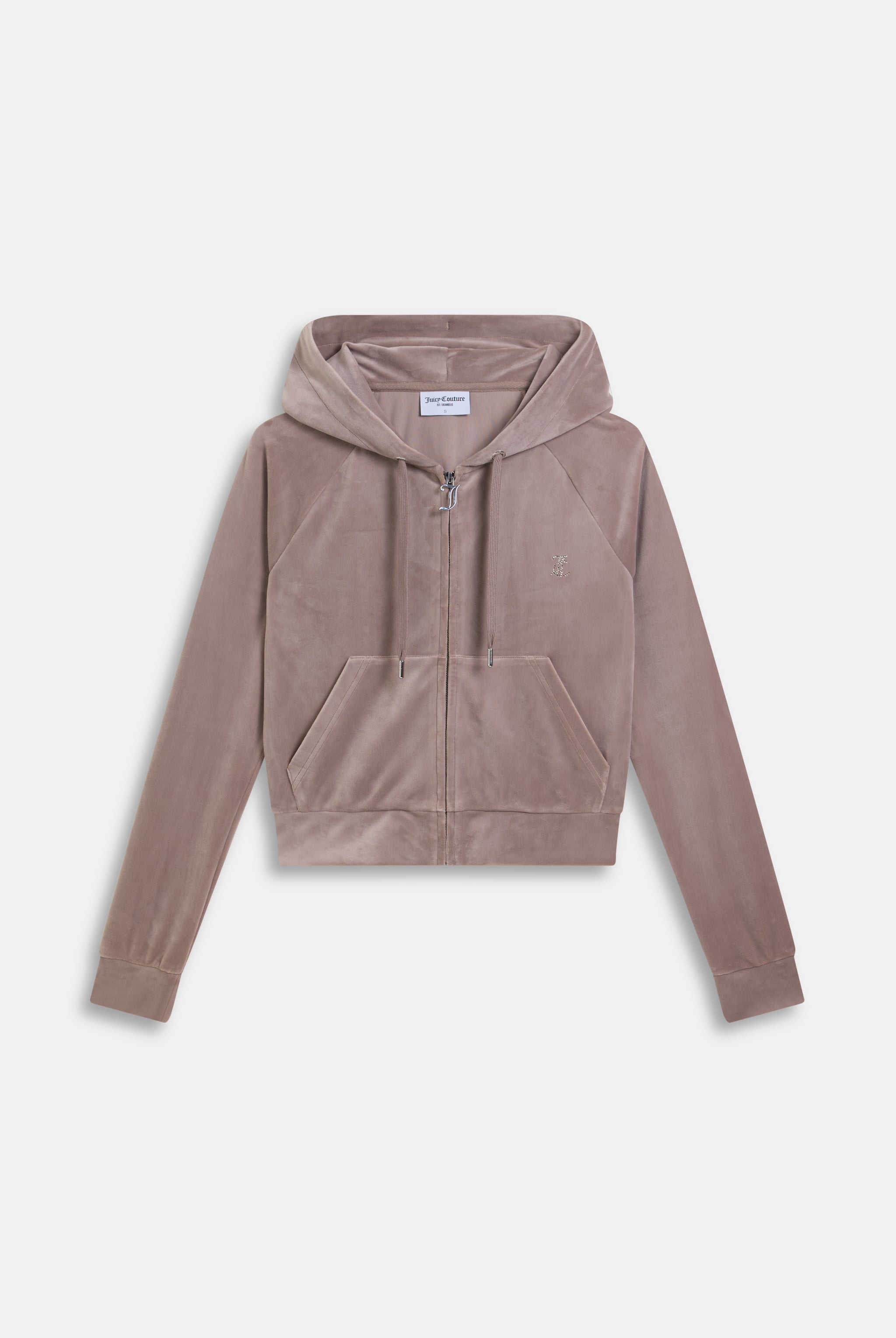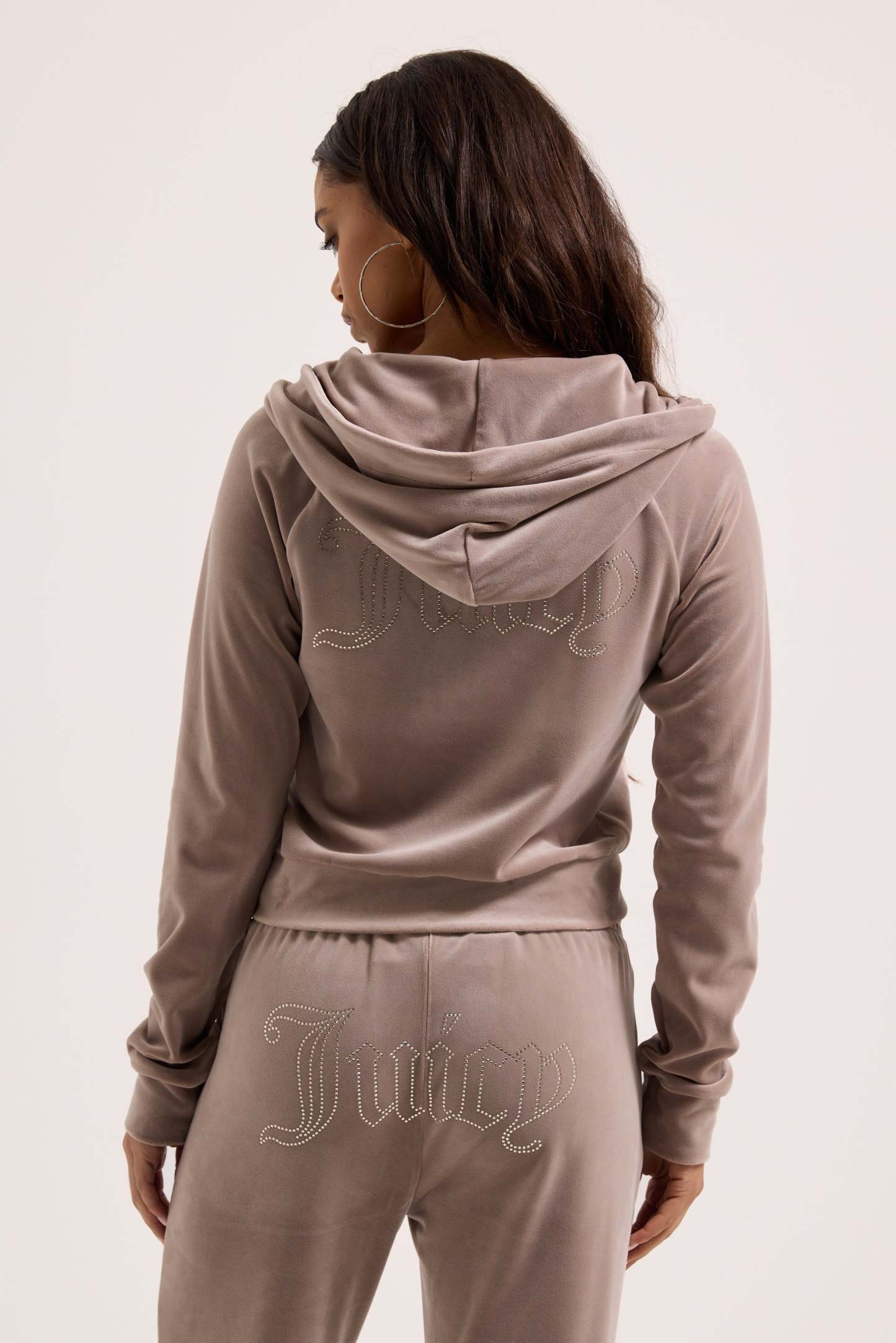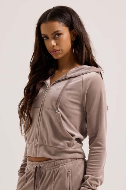 Diamanté embellished hoodie in fungi classic velour. Slim fit zip-through style with a hood, front pockets, and a statement tonal outline diamanté logo branding on the back. This hoodie is finished with a silver gothic J zip pull. Pair with the matching bottoms for a full iconic Juicy Couture tracksuit.