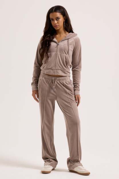 Straight leg diamanté embellished tracksuit bottoms in fungi classic velour. Mid-rise fit, with adjustable drawstring waist and pin tucks through front leg. These bottoms feature zip pockets, statement outline diamanté branding on the back and silver branded hardware.