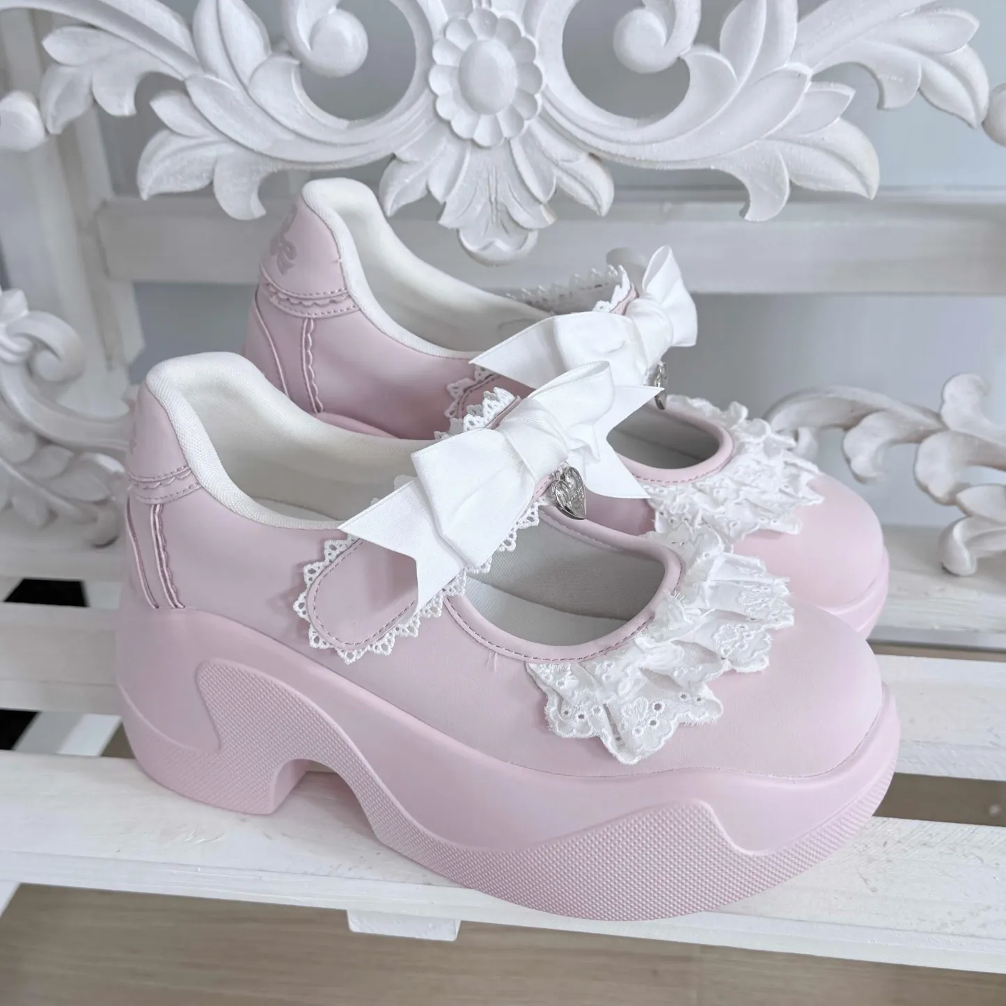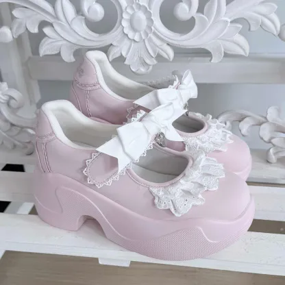 Platform sneakers feature a soft, feminine silhouette with delicate lace and bow accents for a light, playful spring–summer look. The elevated sole provides steady height while maintaining comfort, and the breathable fabric lining keeps the interior fresh for everyday wear. Designed for casual styling, the balanced platform blends sweetness and practicality in a clean, wearable shape.