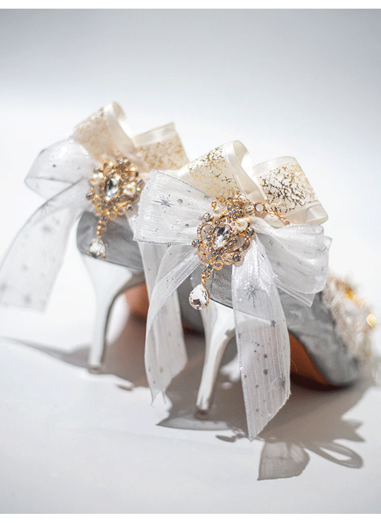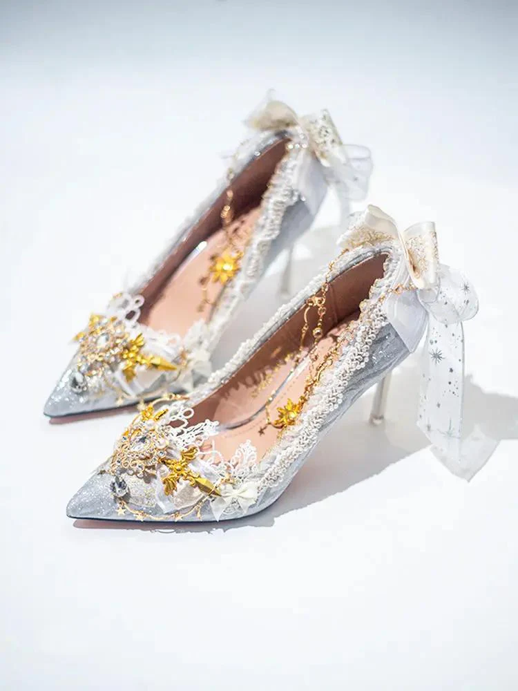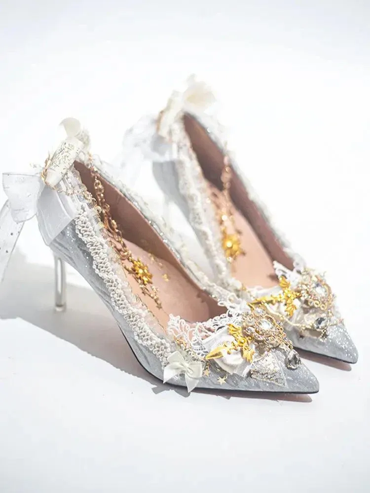 Pointed-toe Lolita stiletto heels feature a sparkling, fairy-tale–inspired silhouette designed for milestone occasions and elegant ceremonies. The slim high heel creates a refined, elongated profile, while the glittered finish delivers a dreamy, princess-like presence suited for weddings, formal looks, and special celebrations. Decorative metal accents add a polished touch to the overall design.
