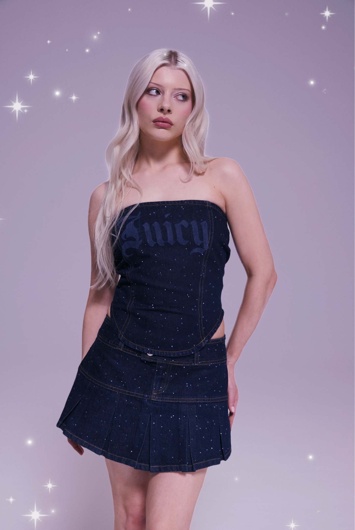 Bandeau top in stretch denim. This fitted top features zip fastening at back and features diamantes all over. This top features tonal logo printed across front.