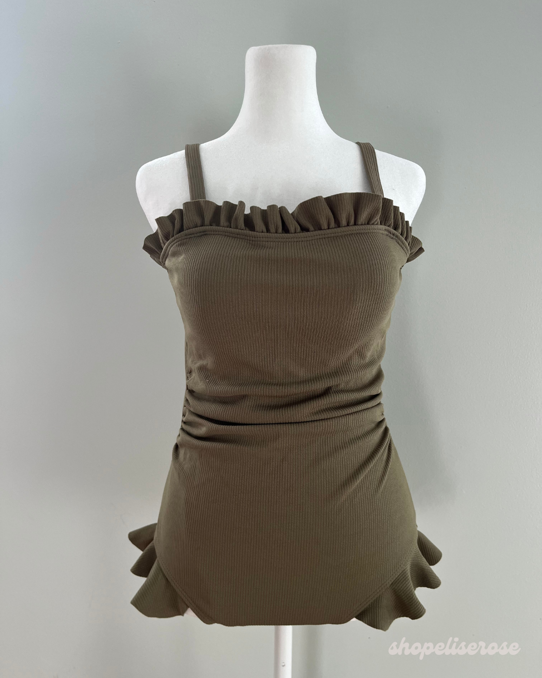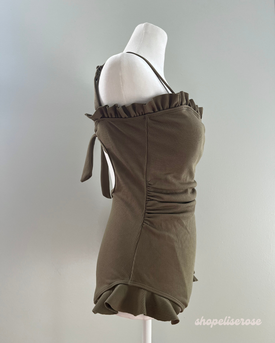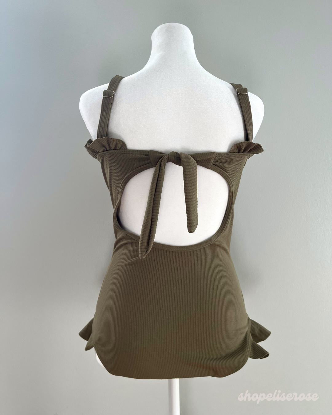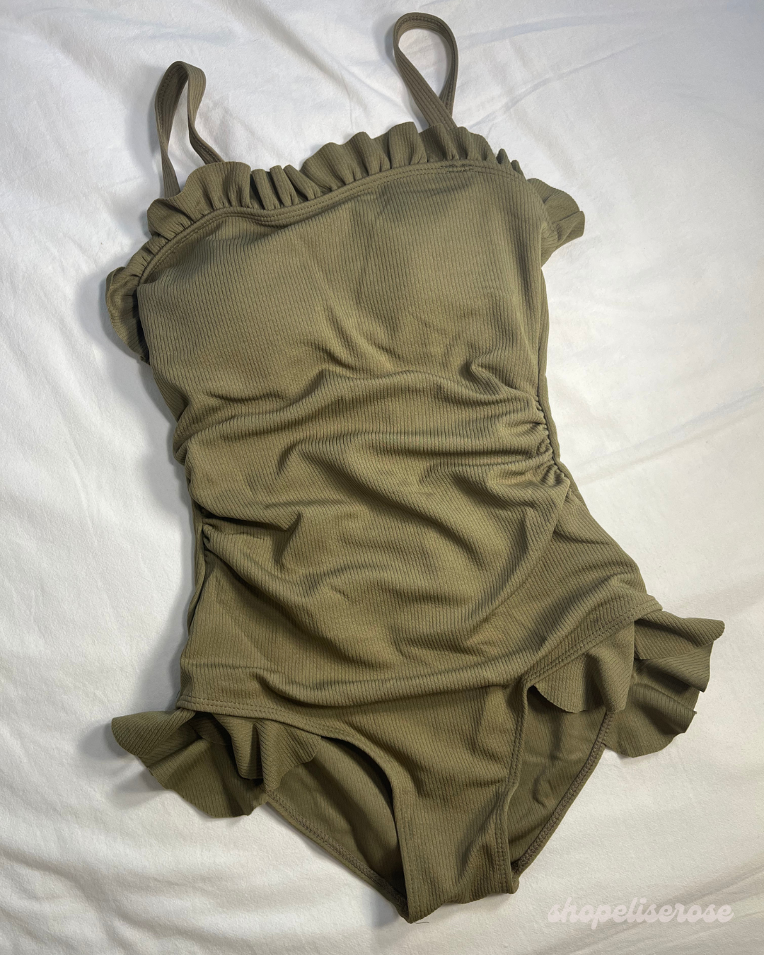 This gorgeous frilly one-piece is both modest and stylish. The sage green color gives a soft earthy vibe and the style is perfect for soft girl summer. It does not have removable pads.