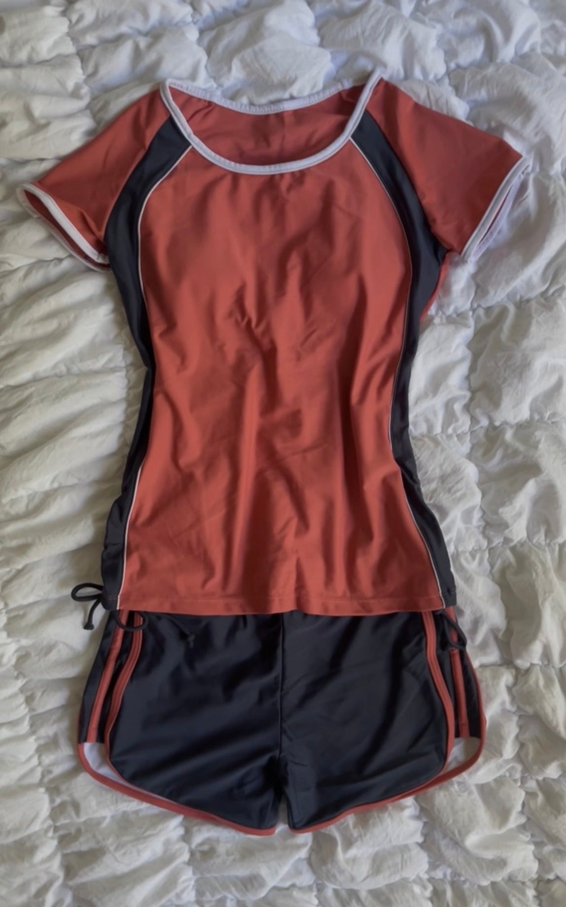 Made with quick-dry, lightweight swimsuit fabric, this t-shirt and shorts set is made for swimming! It feels like active-wear and is perfect for covering up. The swim top features a built-in bra with removable padding and comes with a matching pair of swim shorts.