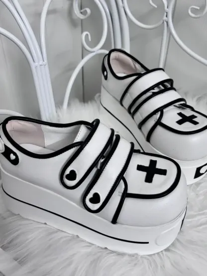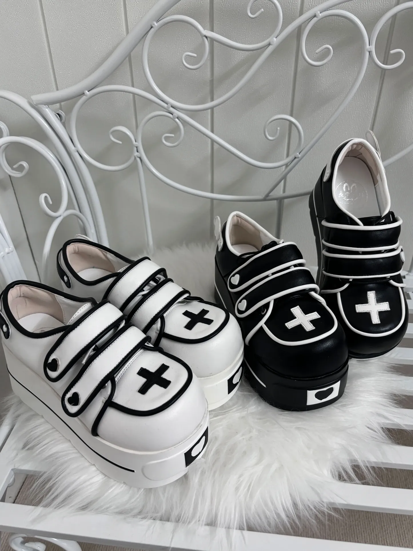 Platform shoes feature a bold subculture-inspired silhouette with a thick elevated sole and a clean, structured profile for sweet–cool styling. The balanced platform creates steady lift while maintaining comfort, and the smooth finish keeps the look sharp and distinctive. Designed for statement everyday wear, the shoes combine height and stability for a strong, wearable presence.