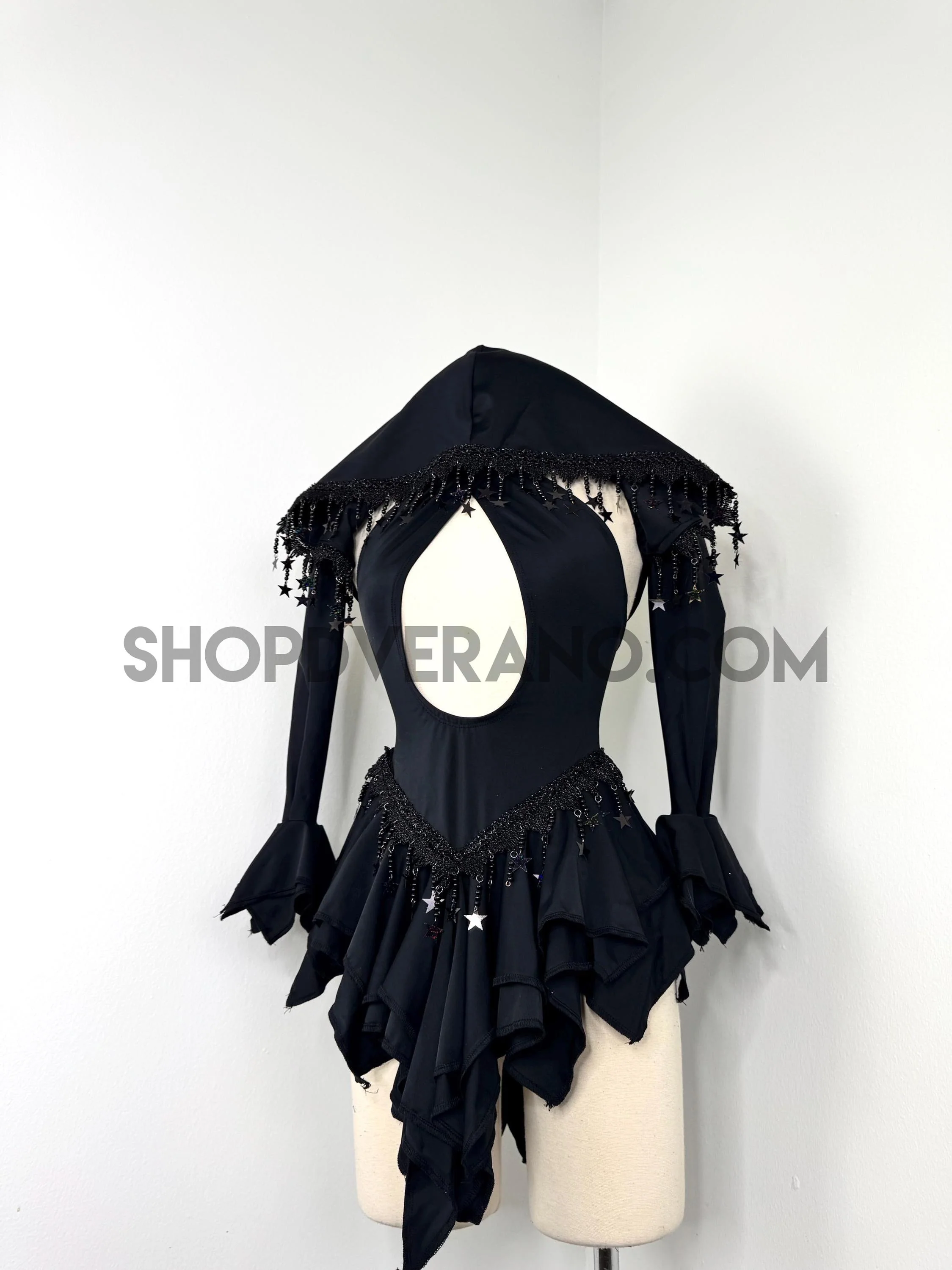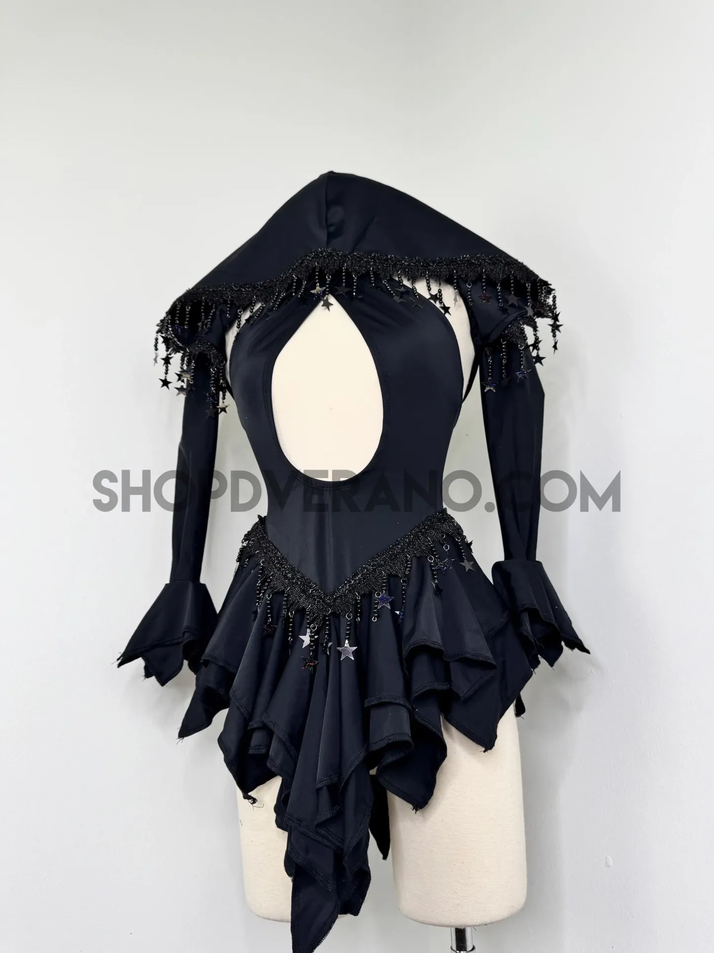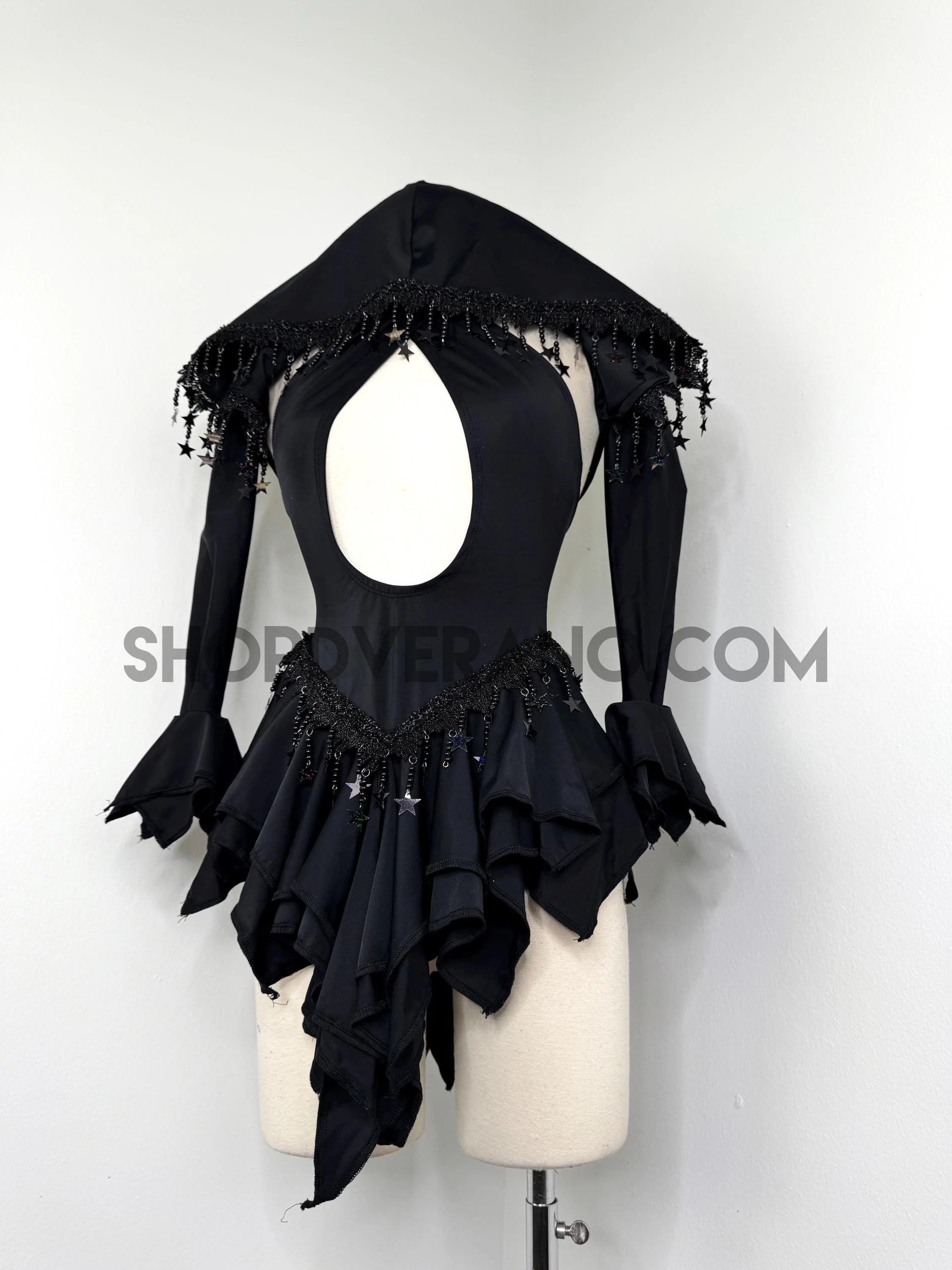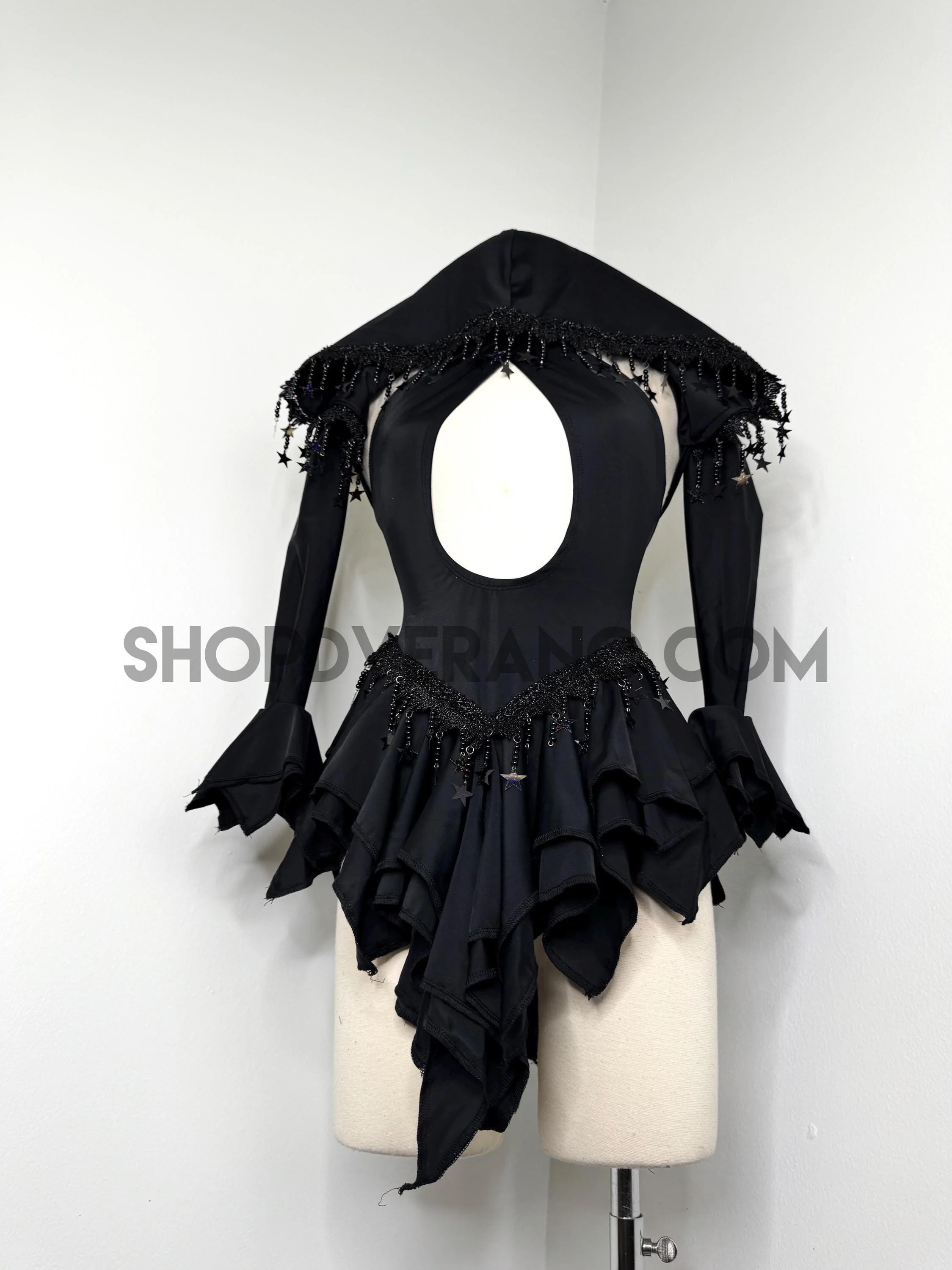 The fairy dress features a V-cut draped dress designed to elongate and accentuate the body, enhanced with black star trim along the front V to draw the eye inward and create a flattering, cinched effect at the waist. Layered fairy panels cascade effortlessly with movement, adding depth, dimension, and dramatic flow.