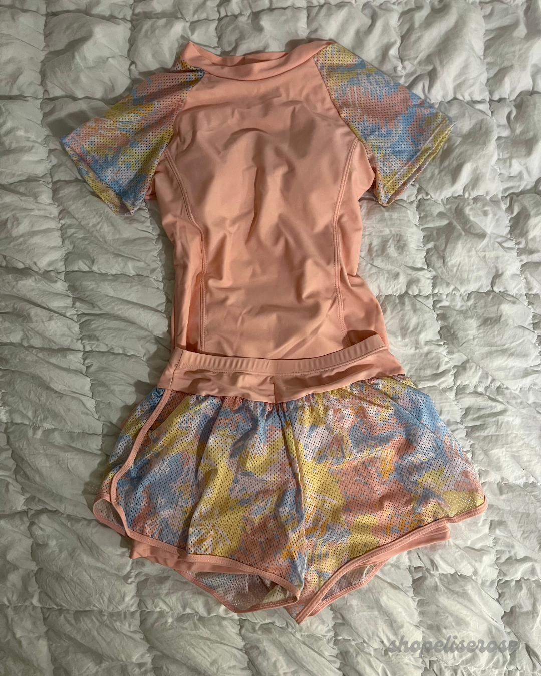 Made with quick-dry, lightweight swimsuit fabric, this t-shirt and shorts set is made for swimming! It feels like active-wear and is perfect for covering up. The swim top features a built-in bra with removable padding and comes with a matching pair of swim shorts.