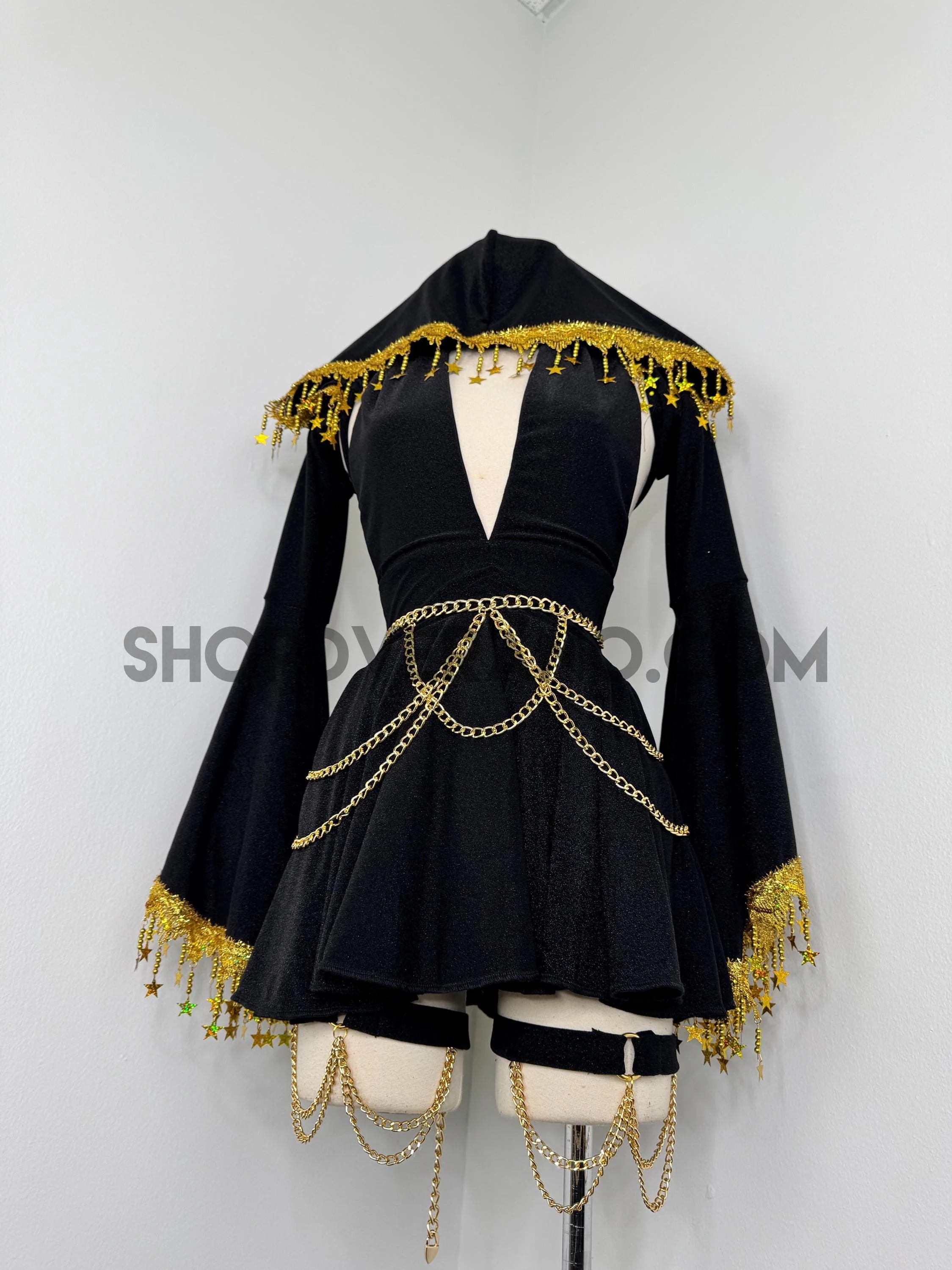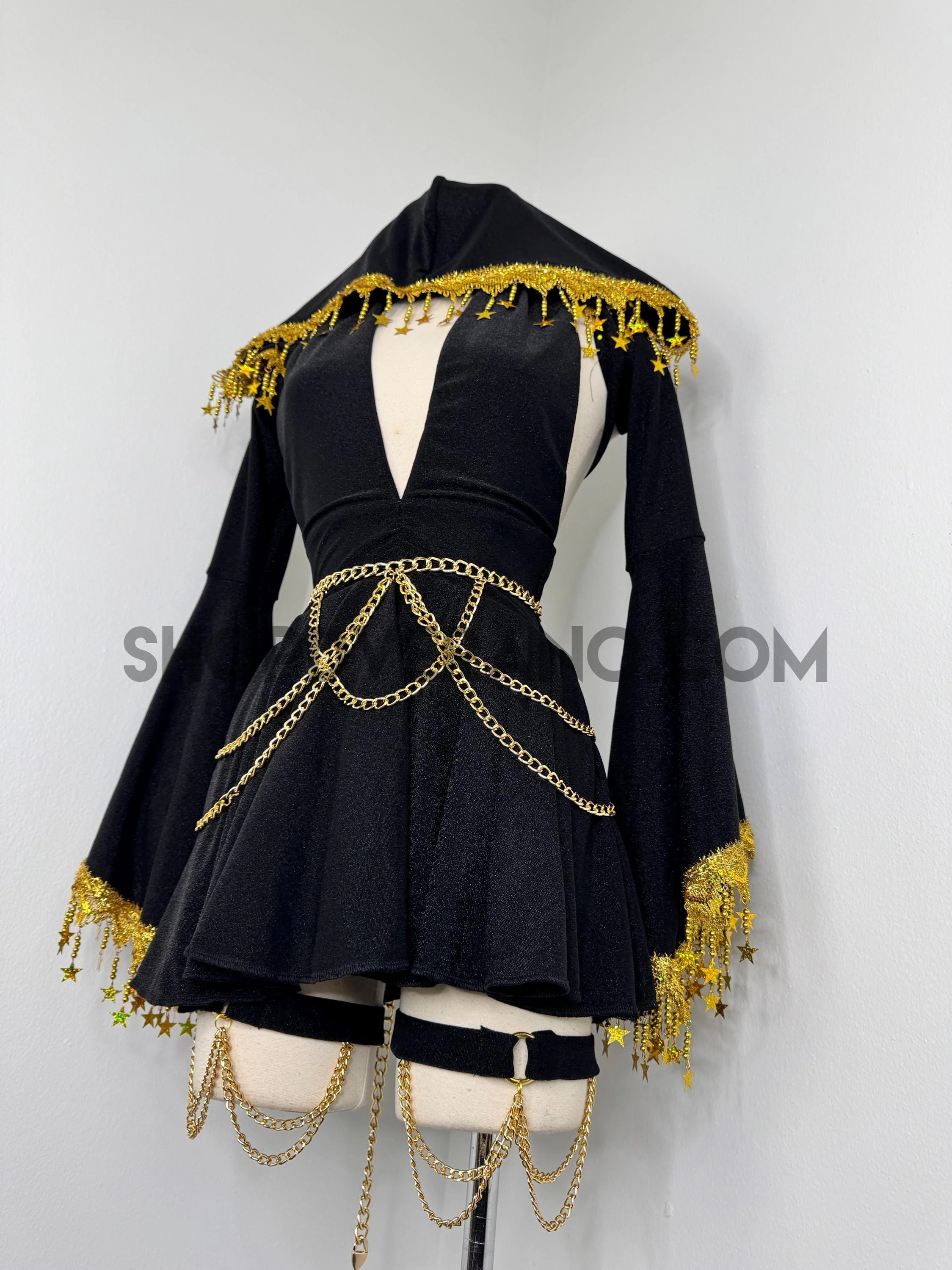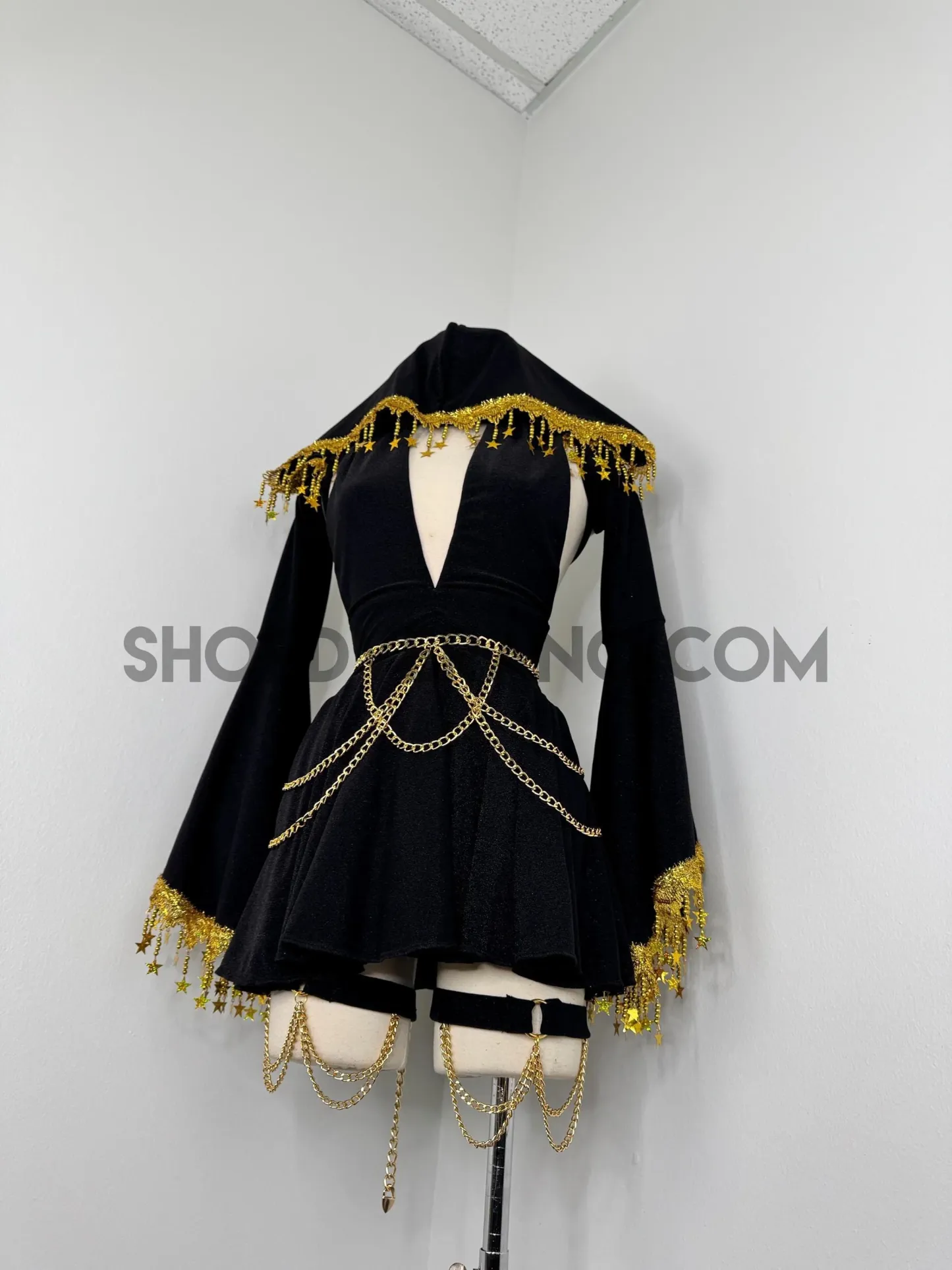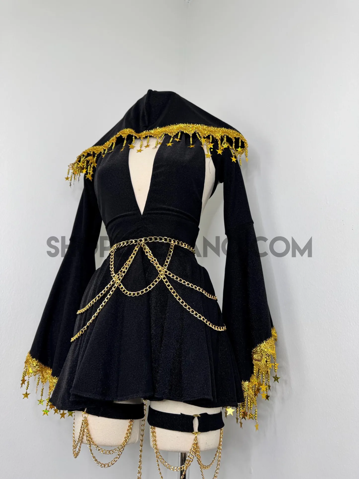Both the hood and dramatic bell sleeves are finished with holographic gold star trim, giving the entire look a rich, celestial finish inspired by night skies and starlit constellations. The look is completed with a removable, adjustable cascading chain belt that drapes beautifully at the front, along with matching stretchy cascading chain leg straps for a secure and comfortable fit.