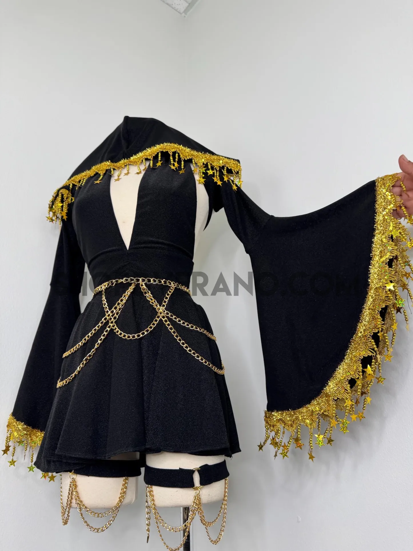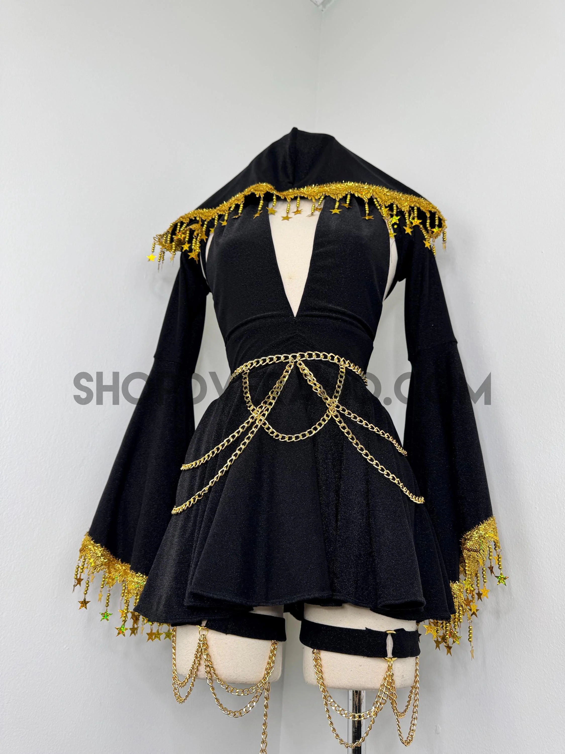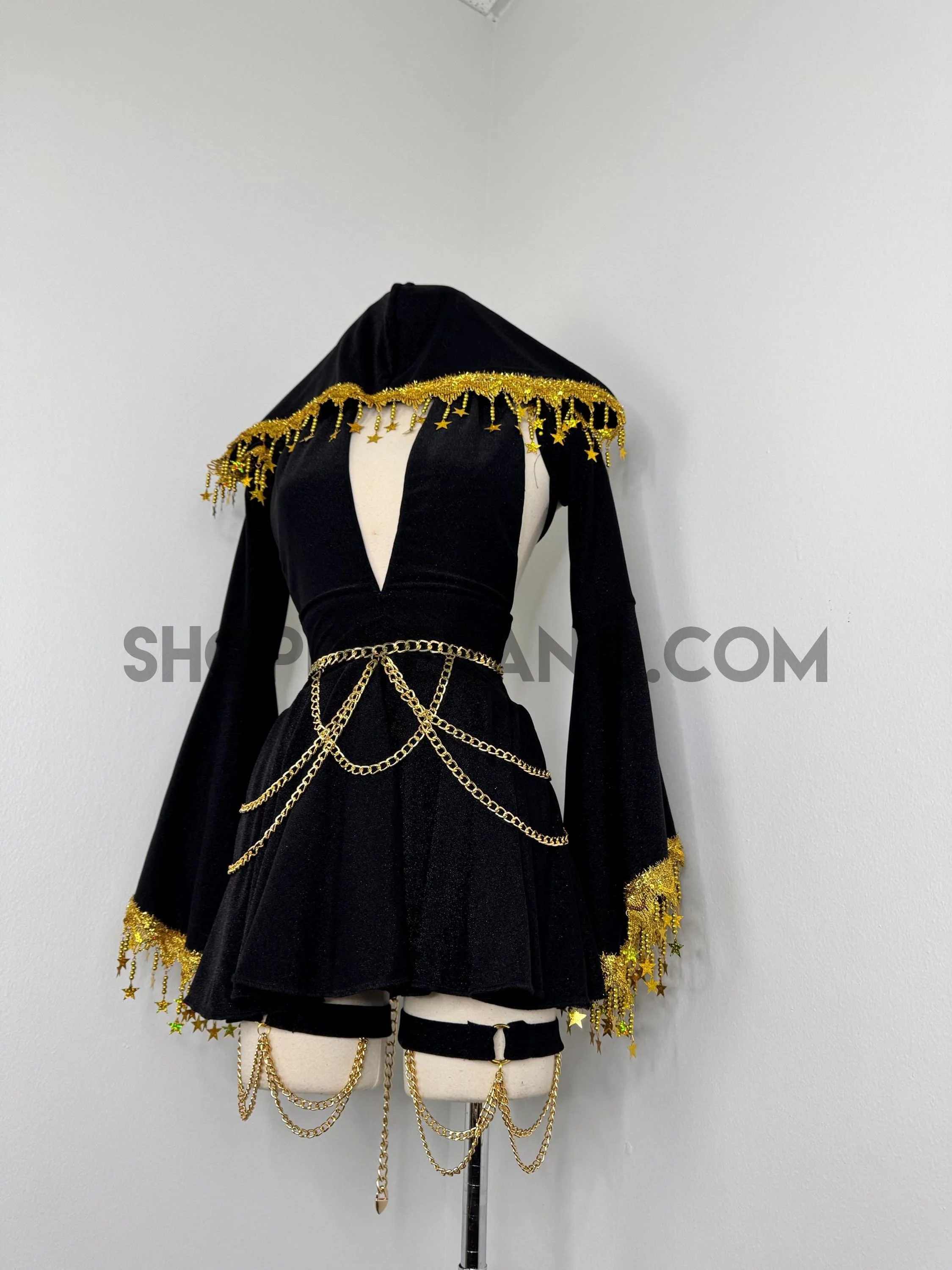 Both the hood and dramatic bell sleeves are finished with holographic gold star trim, giving the entire look a rich, celestial finish inspired by night skies and starlit constellations. The look is completed with a removable, adjustable cascading chain belt that drapes beautifully at the front, along with matching stretchy cascading chain leg straps for a secure and comfortable fit.