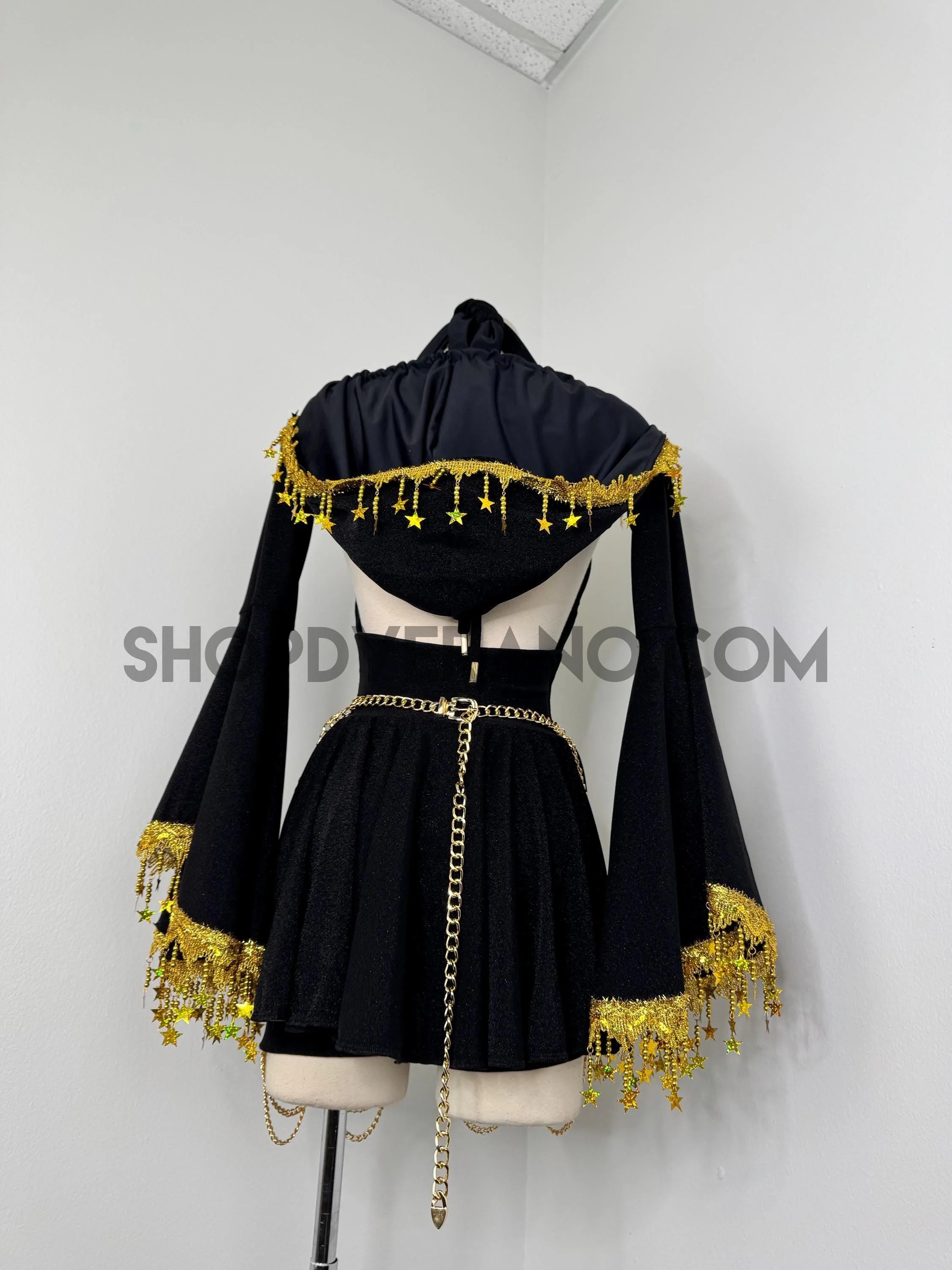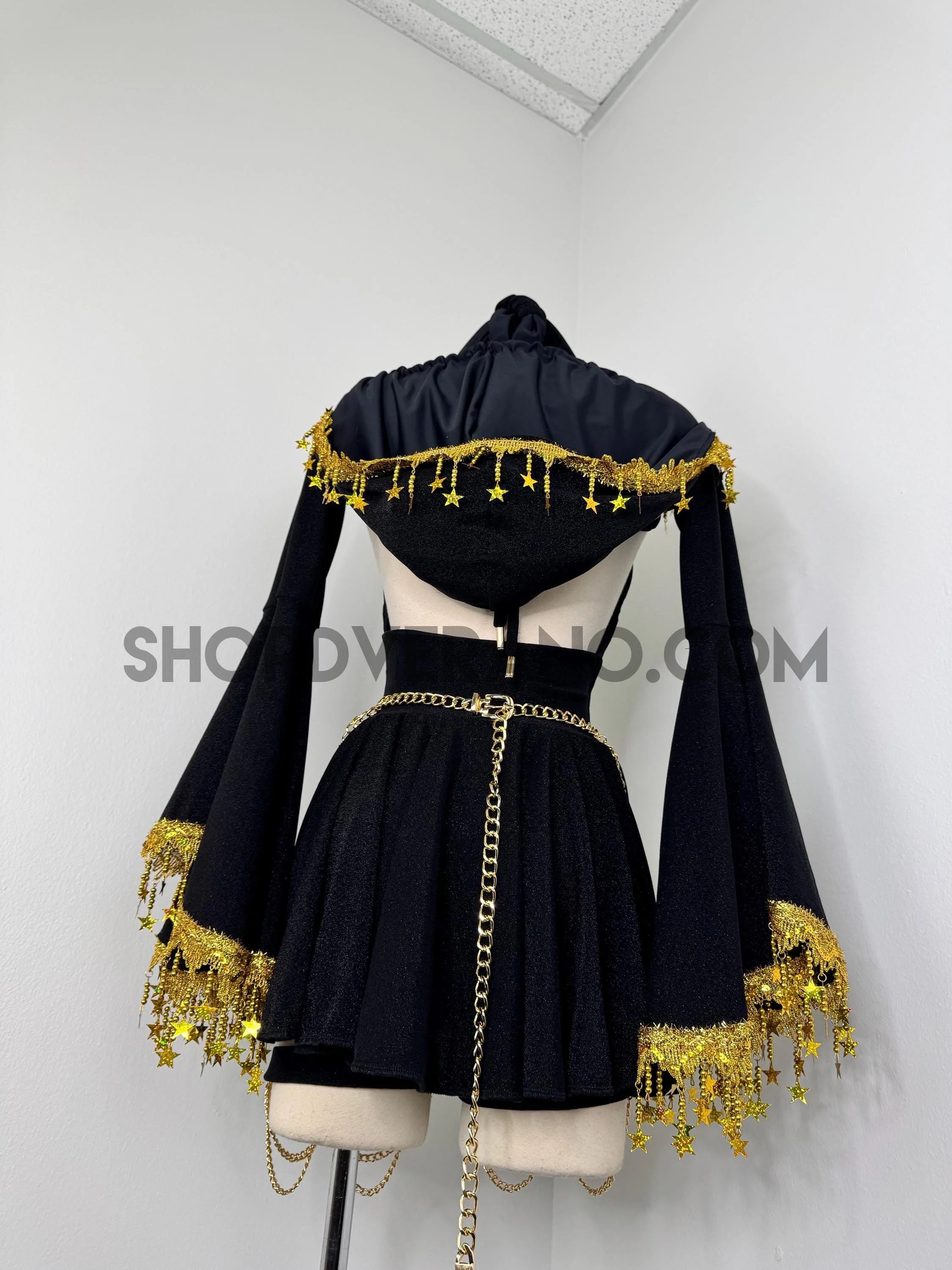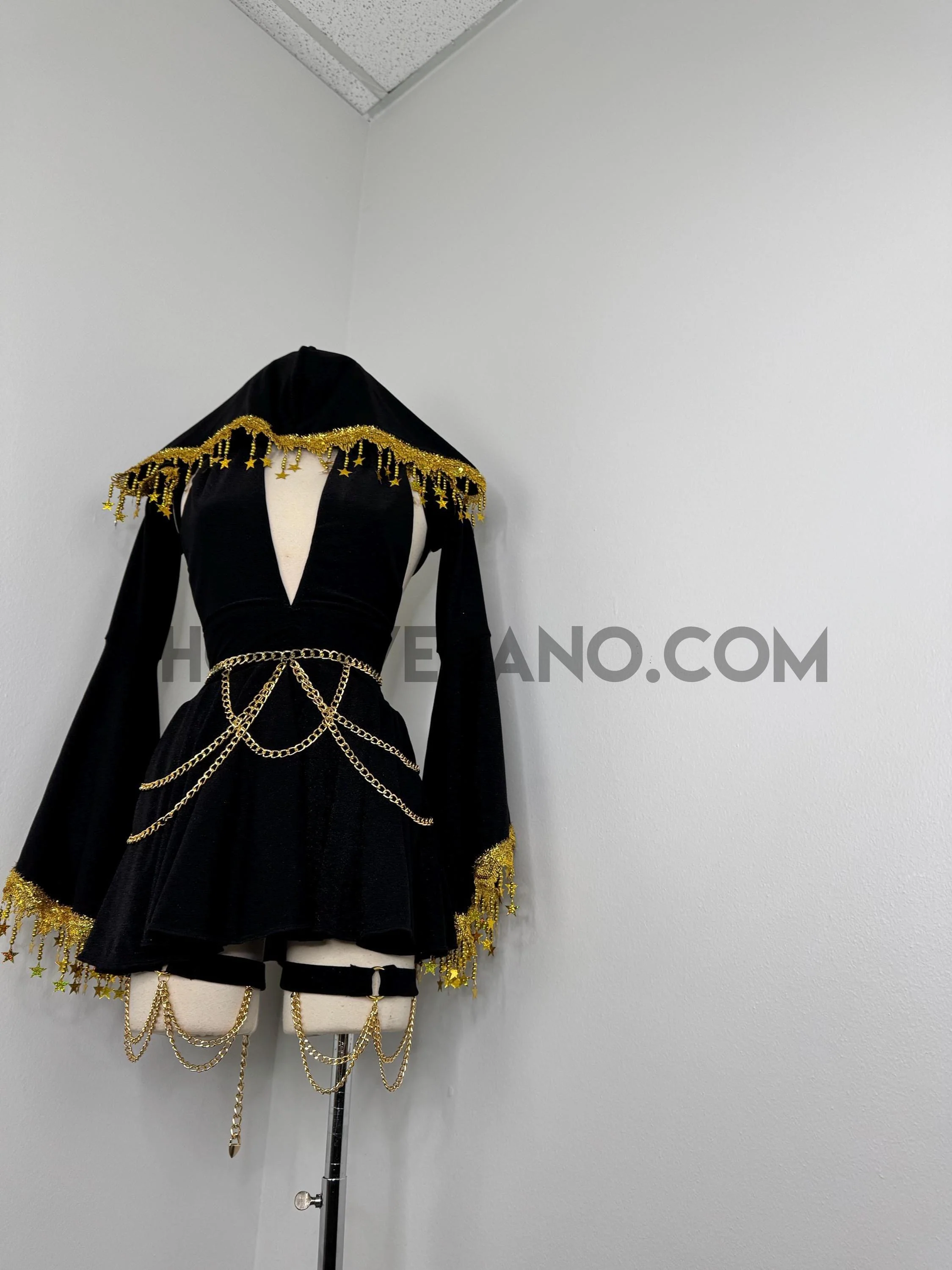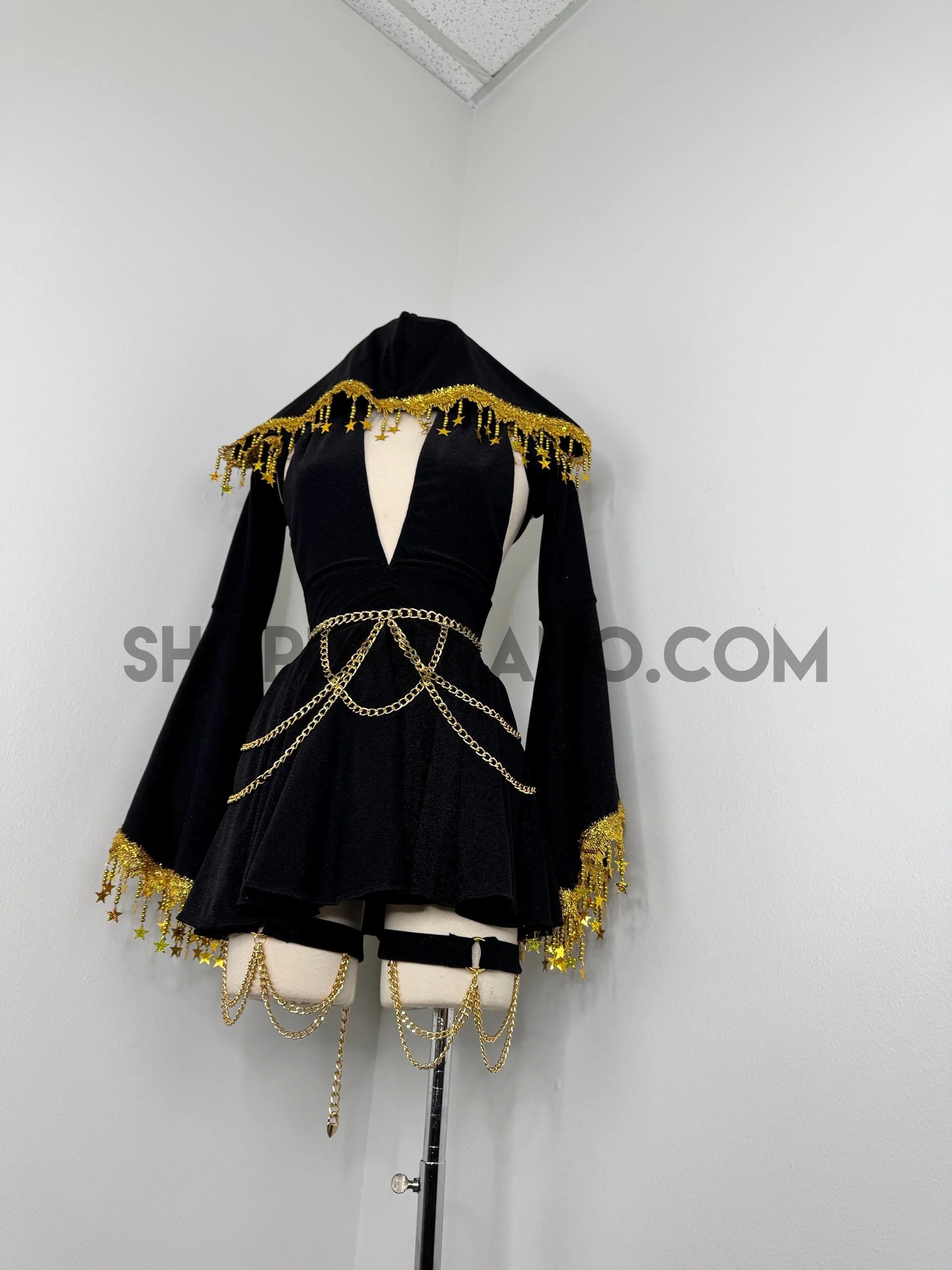 Both the hood and dramatic bell sleeves are finished with holographic gold star trim, giving the entire look a rich, celestial finish inspired by night skies and starlit constellations. The look is completed with a removable, adjustable cascading chain belt that drapes beautifully at the front, along with matching stretchy cascading chain leg straps for a secure and comfortable fit.