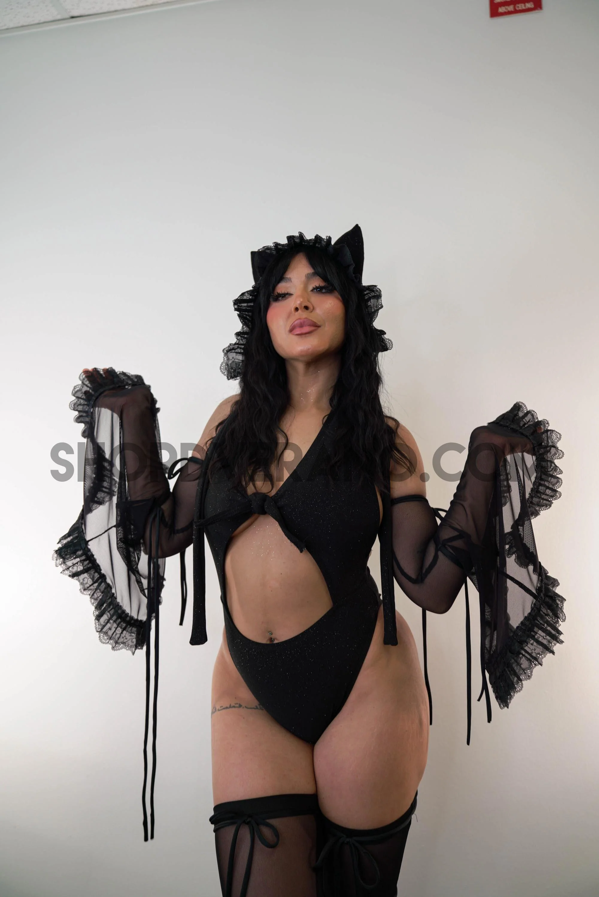 The look is paired with black mesh sleeves and matching bell leg covers, designed to elongate the body and add dramatic movement. Delicate black lace ruffles trim the edges, adding texture and depth, while black bow strap details bring a subtle, romantic contrast to the dark silhouette. Each element flows effortlessly, creating a captivating visual for a festival setting.