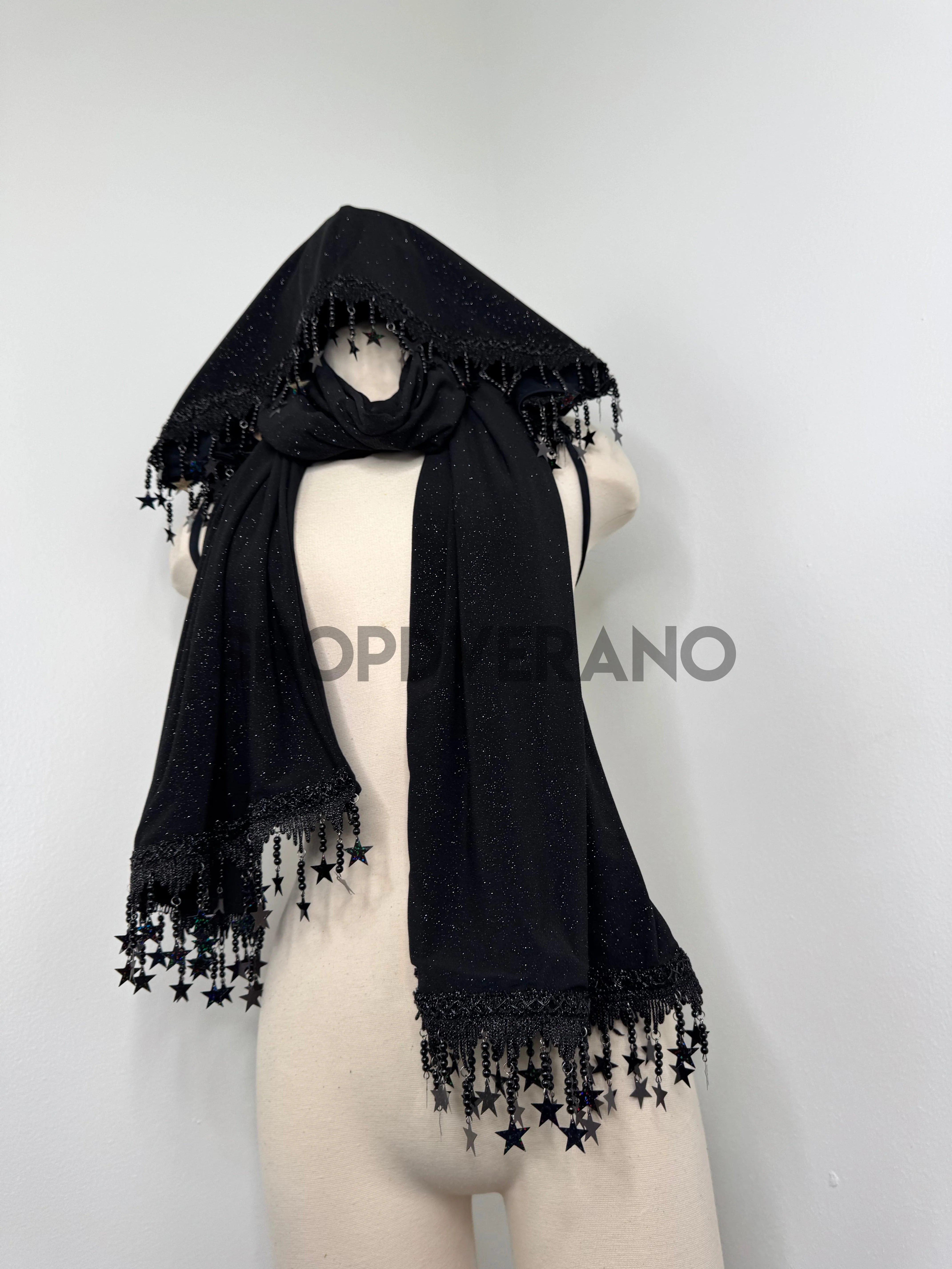 Dark, celestial, and effortlessly striking, the Obsidian Scarf & Hoodie Set is the ultimate after dark layering piece. Designed to elevate any rave, festival, or fantasy look, this set brings together deep black glitter shimmer with celestial detailing for a look that feels powerful, mysterious, and undeniably main character.