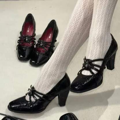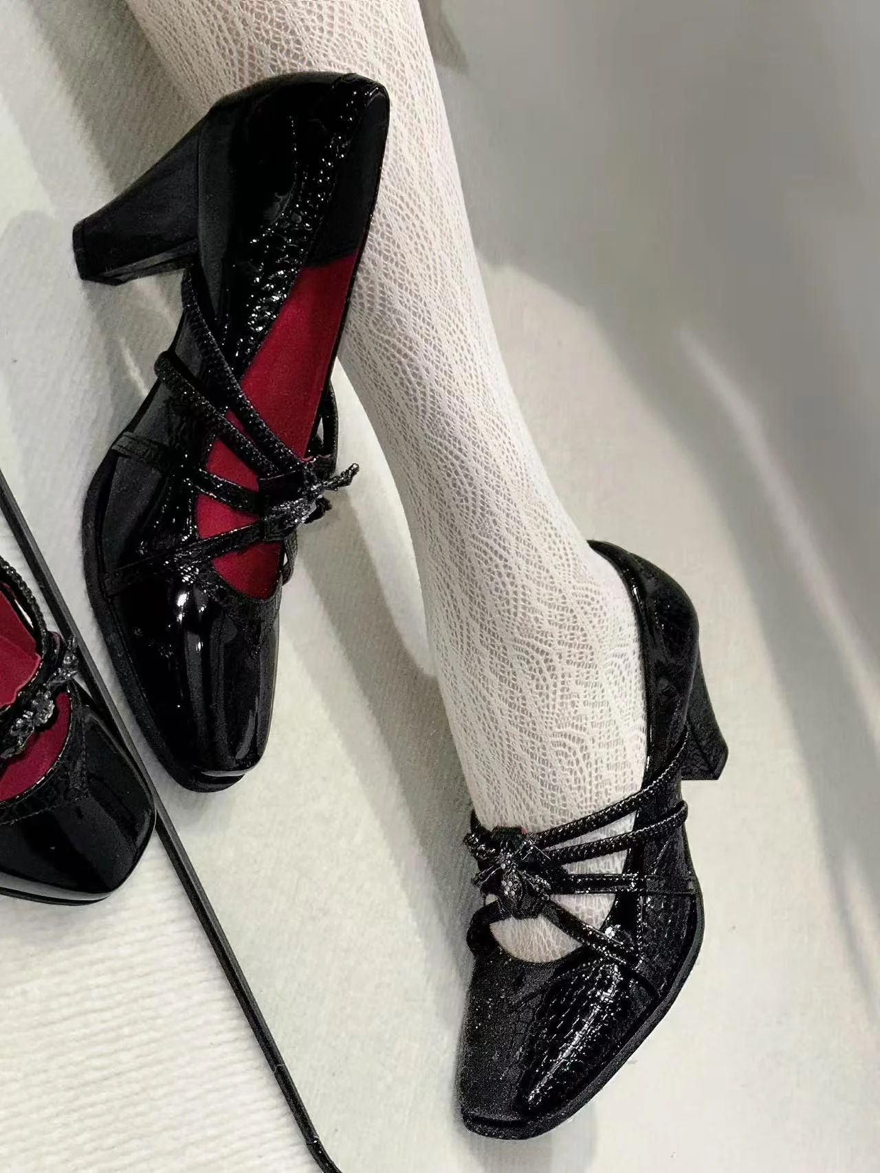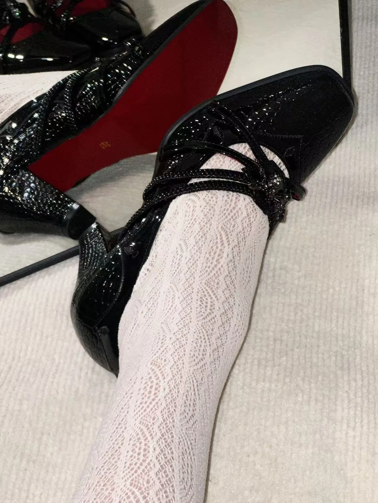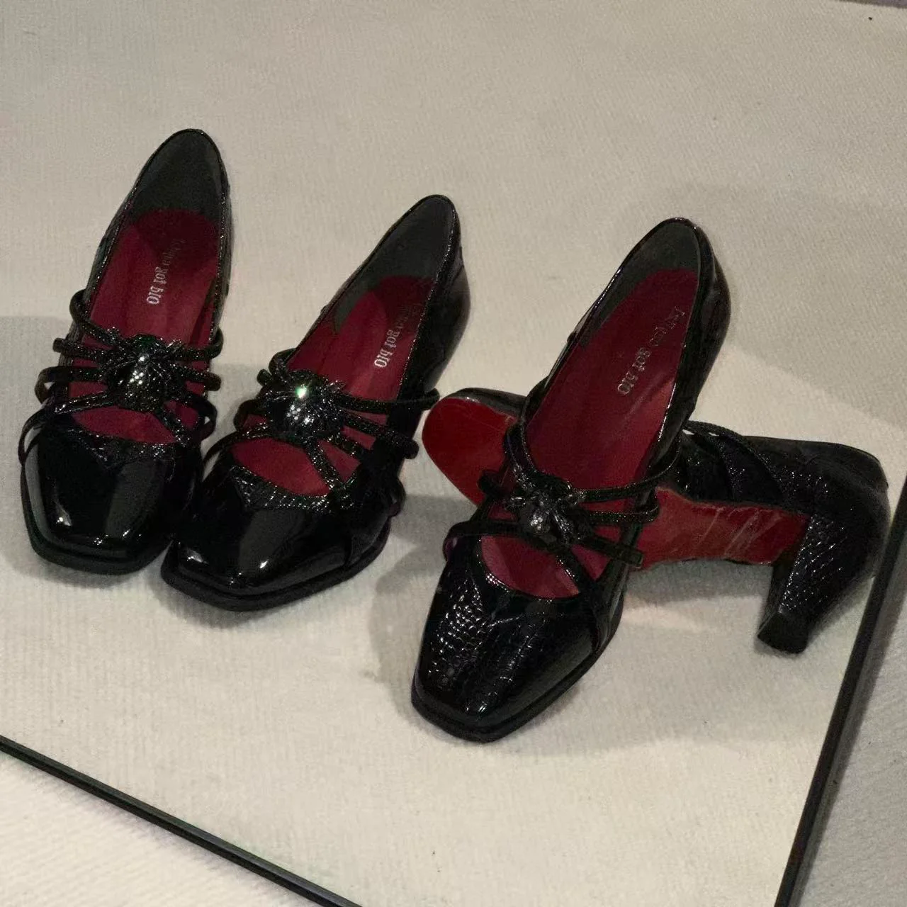 PU upper with zinc alloy detailing and a 7 cm heel.Available in cracked patent and solid patent finishes.