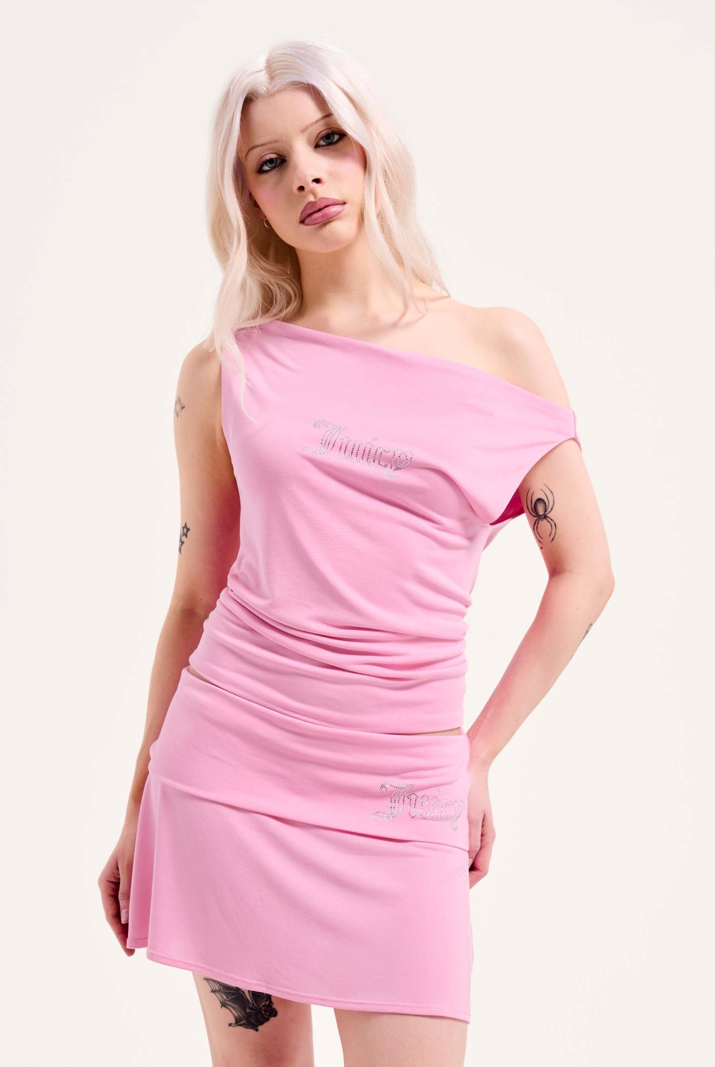 Sleeveless top with cowl drape front. This off the shoulder top features outline crystal diamante logo to front.