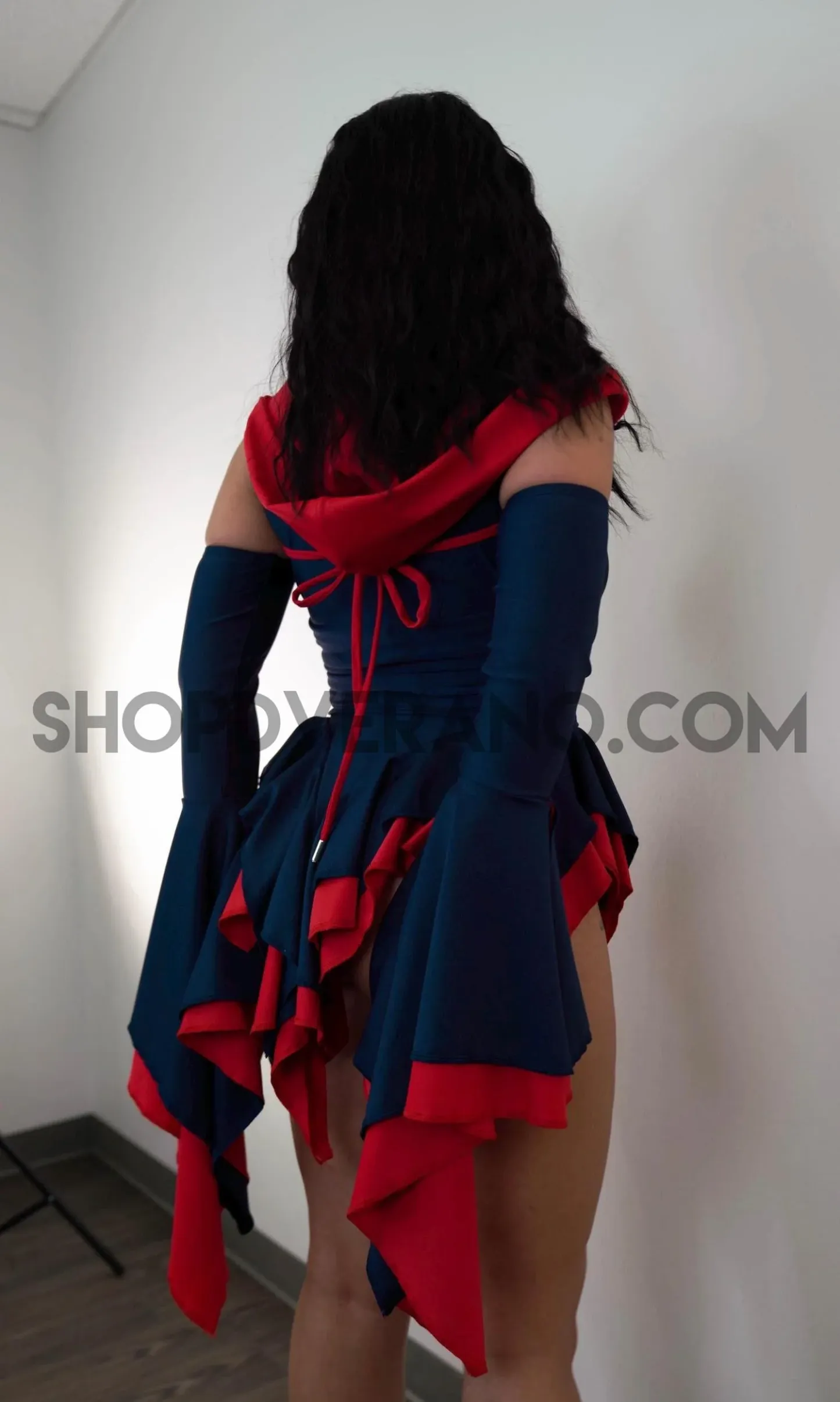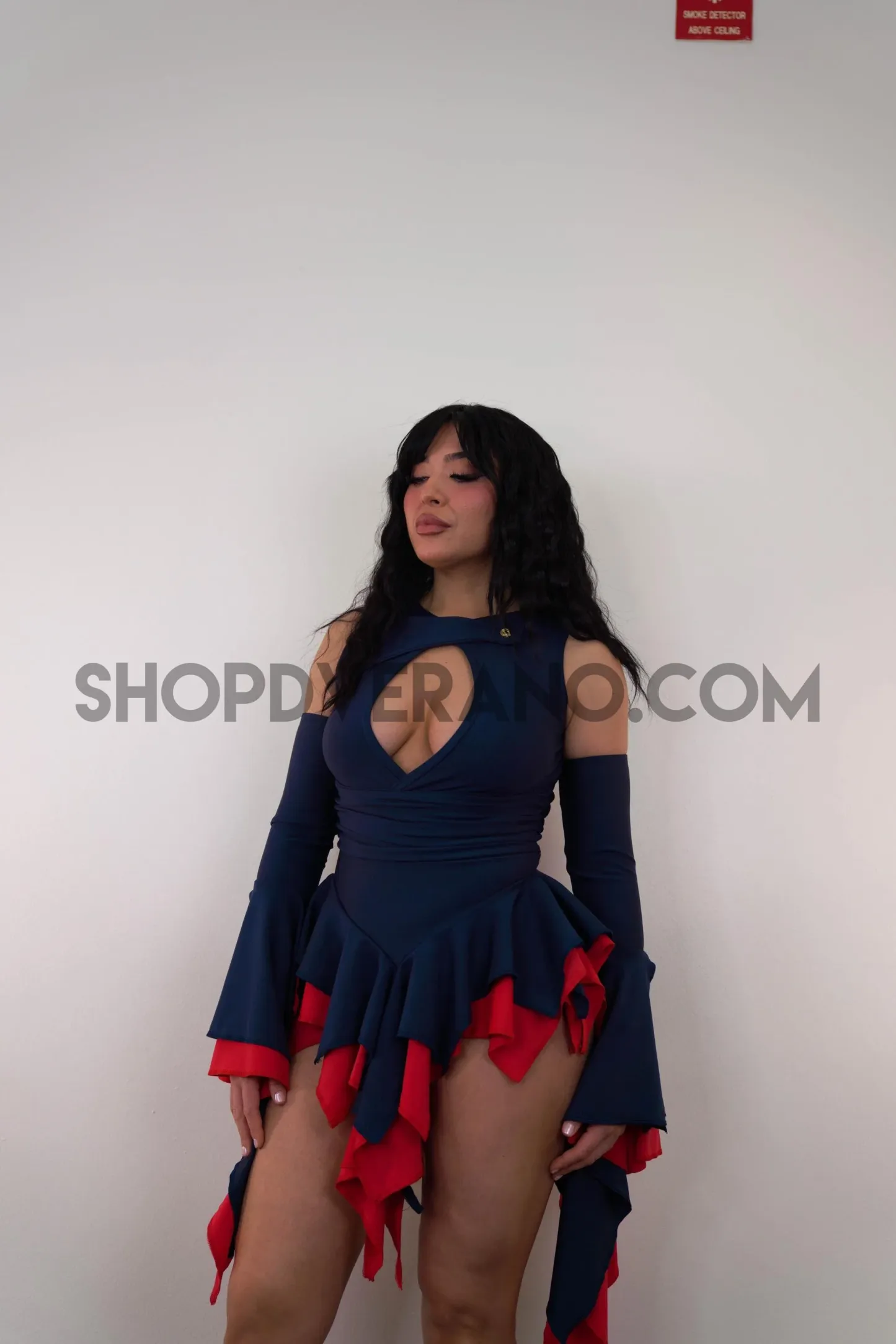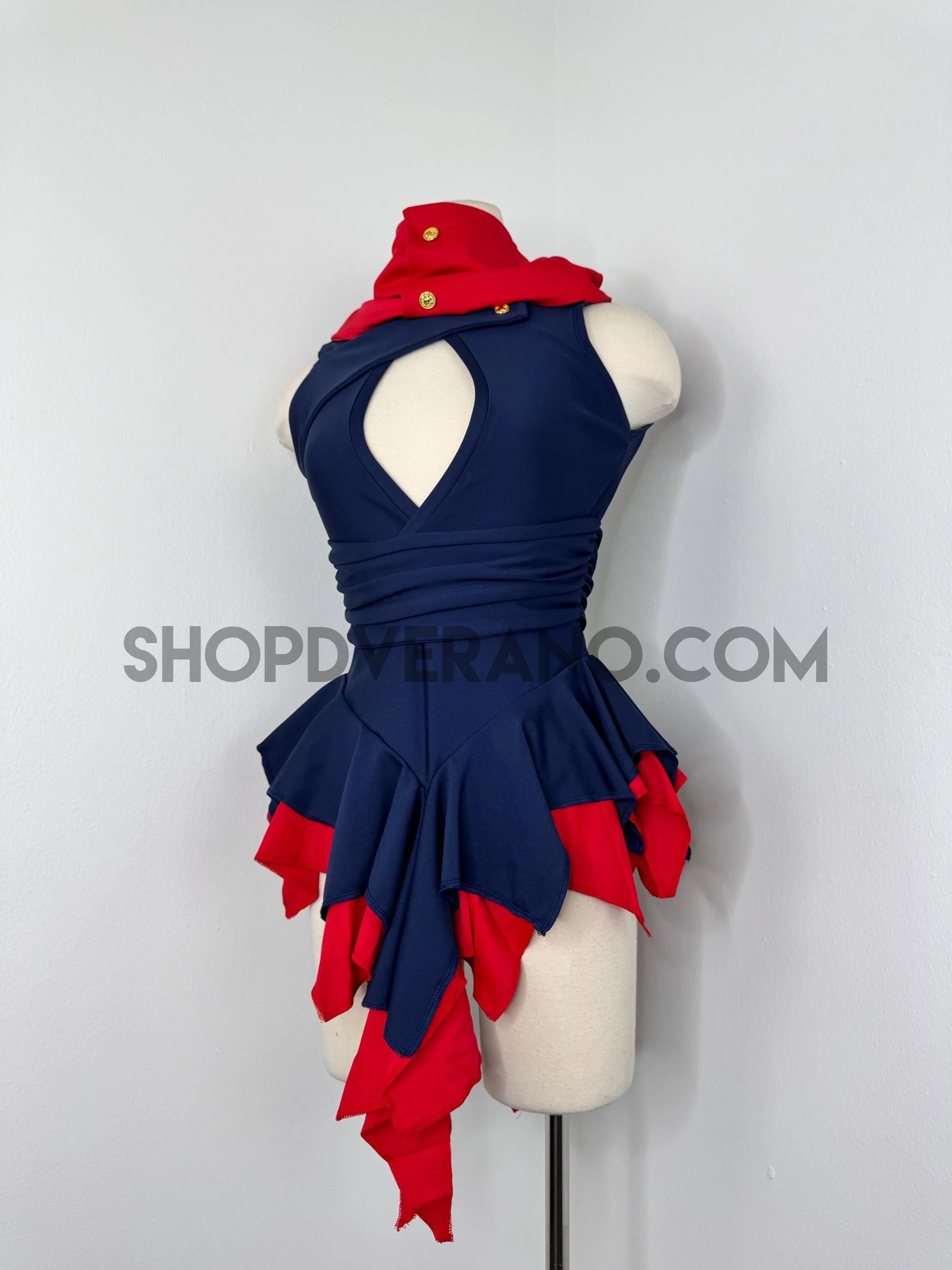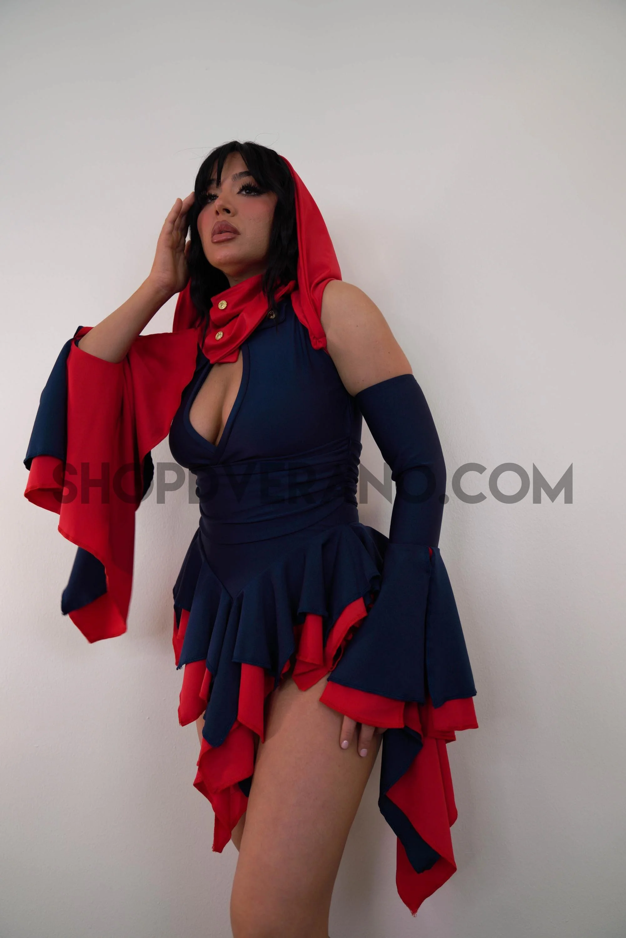 The halter cutout bust design creates a flattering and secure fit, sculpting the body while adding a bold, confident edge. The cinched waistband enhances your natural silhouette, while the layered fairy panels are designed to move with you, creating dynamic motion with every step. As you move, the red contrast layers add dimension and extra cherry on top.