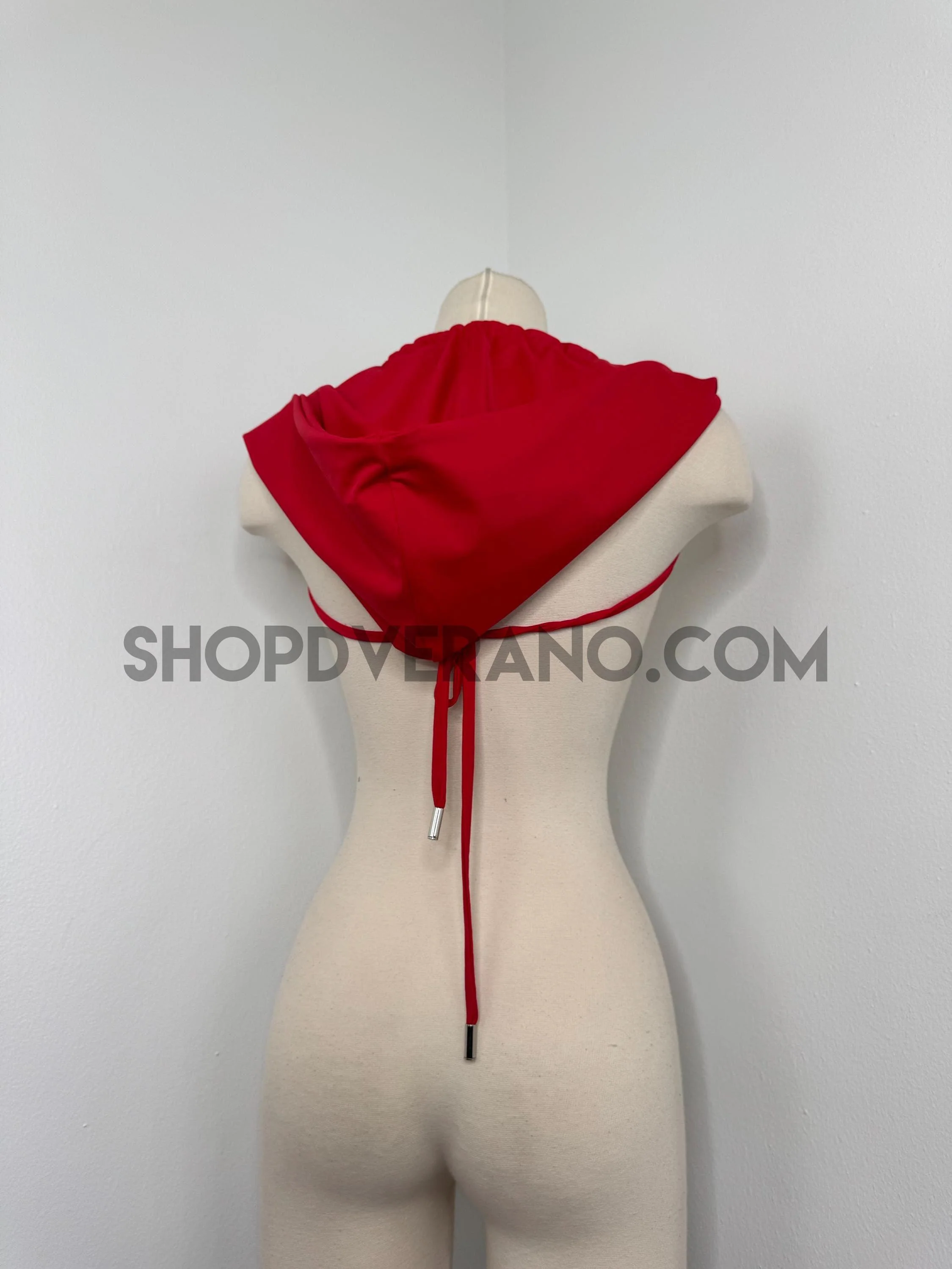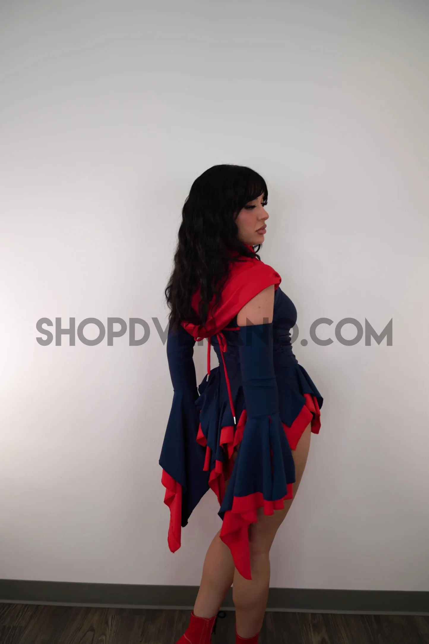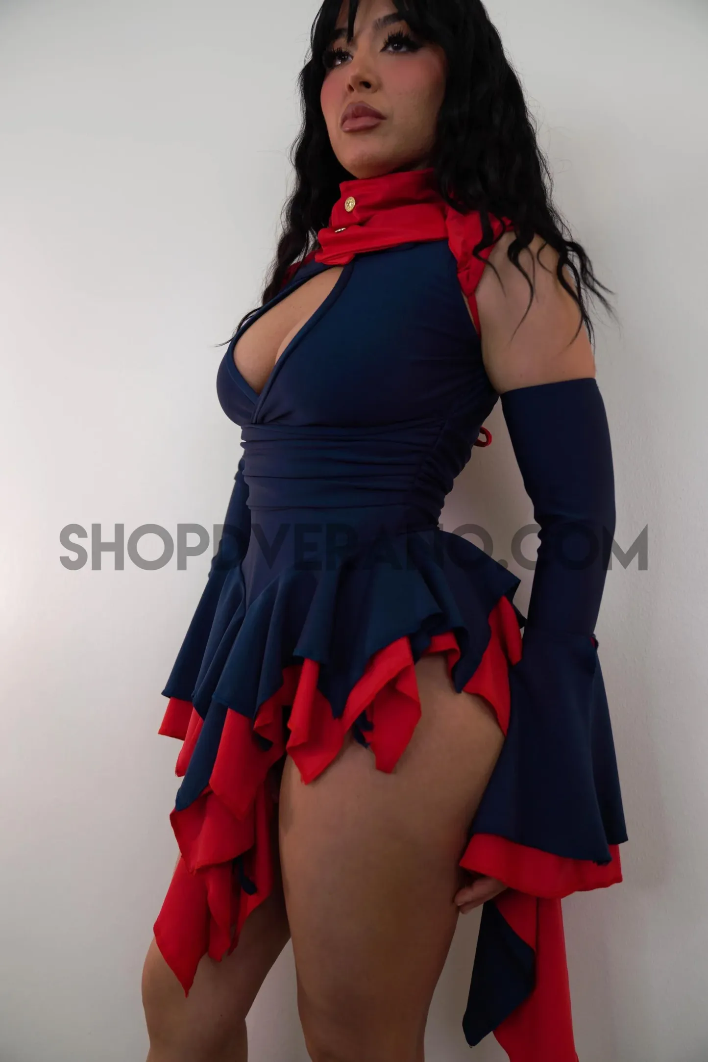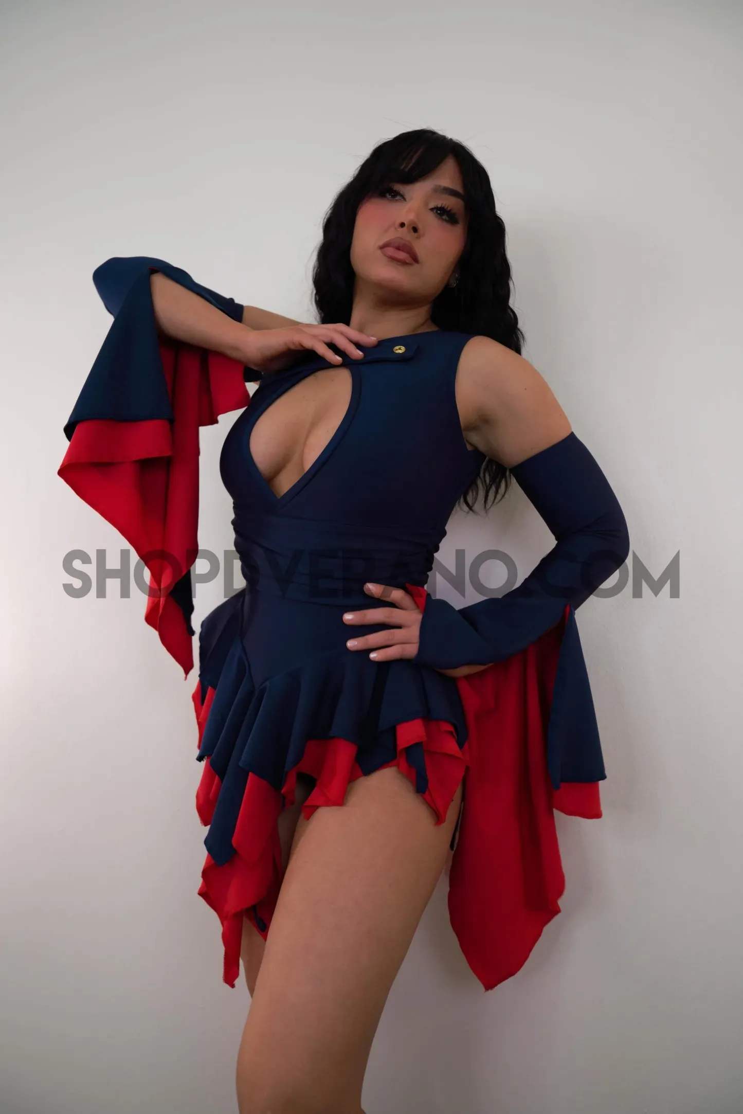 The halter cutout bust design creates a flattering and secure fit, sculpting the body while adding a bold, confident edge. The cinched waistband enhances your natural silhouette, while the layered fairy panels are designed to move with you, creating dynamic motion with every step. As you move, the red contrast layers add dimension and extra cherry on top.
