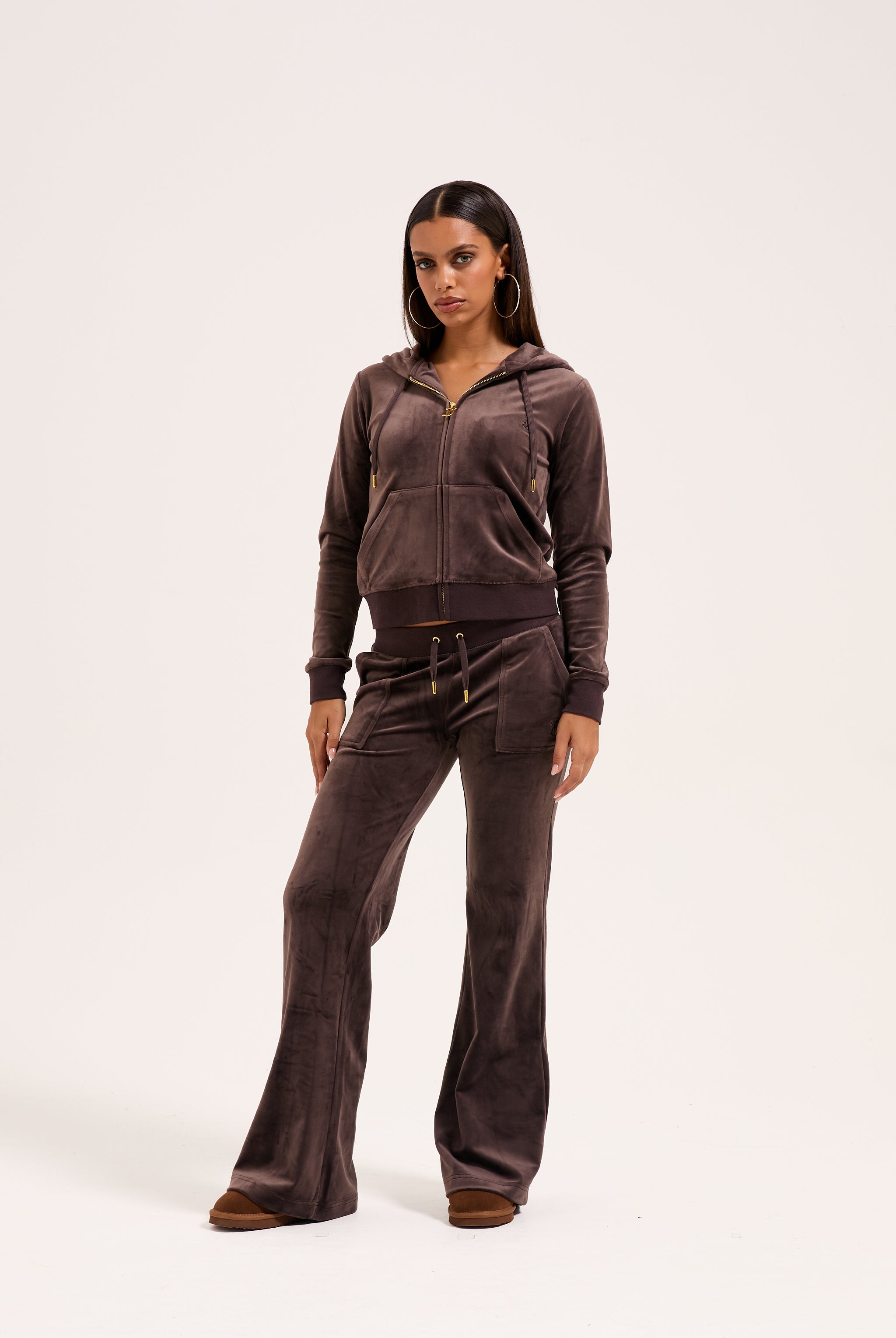Zip through hoodie in java classic velour. Slim fit, with kangaroo pockets and a self-fabric lined hood, this core hoodie features a gold statement gothic J zip pull and is branded with a tonal embroidered JC logo at the chest.