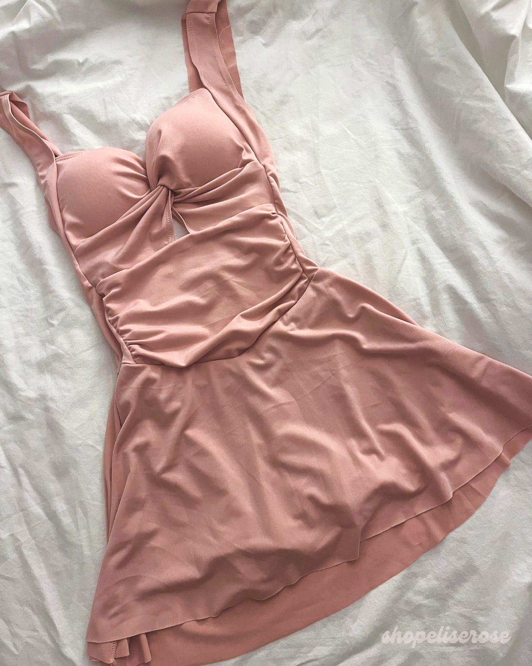 The Rose swim dress is the most flattering shade of light pink. It's form fitting, modest and offers slight tummy control/sun protection.