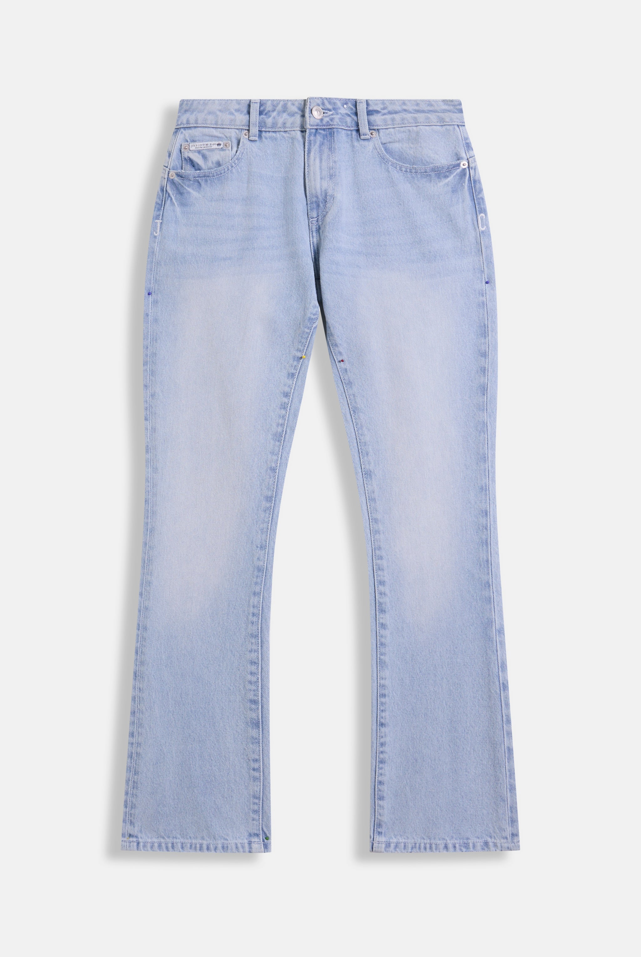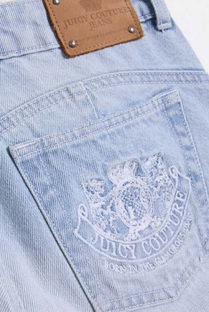 Mid-rise fit bootcut jeans in light wash denim. These bottoms are branded with dog crest diamante embroidery on back pockets and feature branded rivets, and a branded metal button & zip fastening. Five pocket jeans, they are finished with a suede branded patch to the back waistband and embroidered contrast J and C on each hip and contrast stitching.