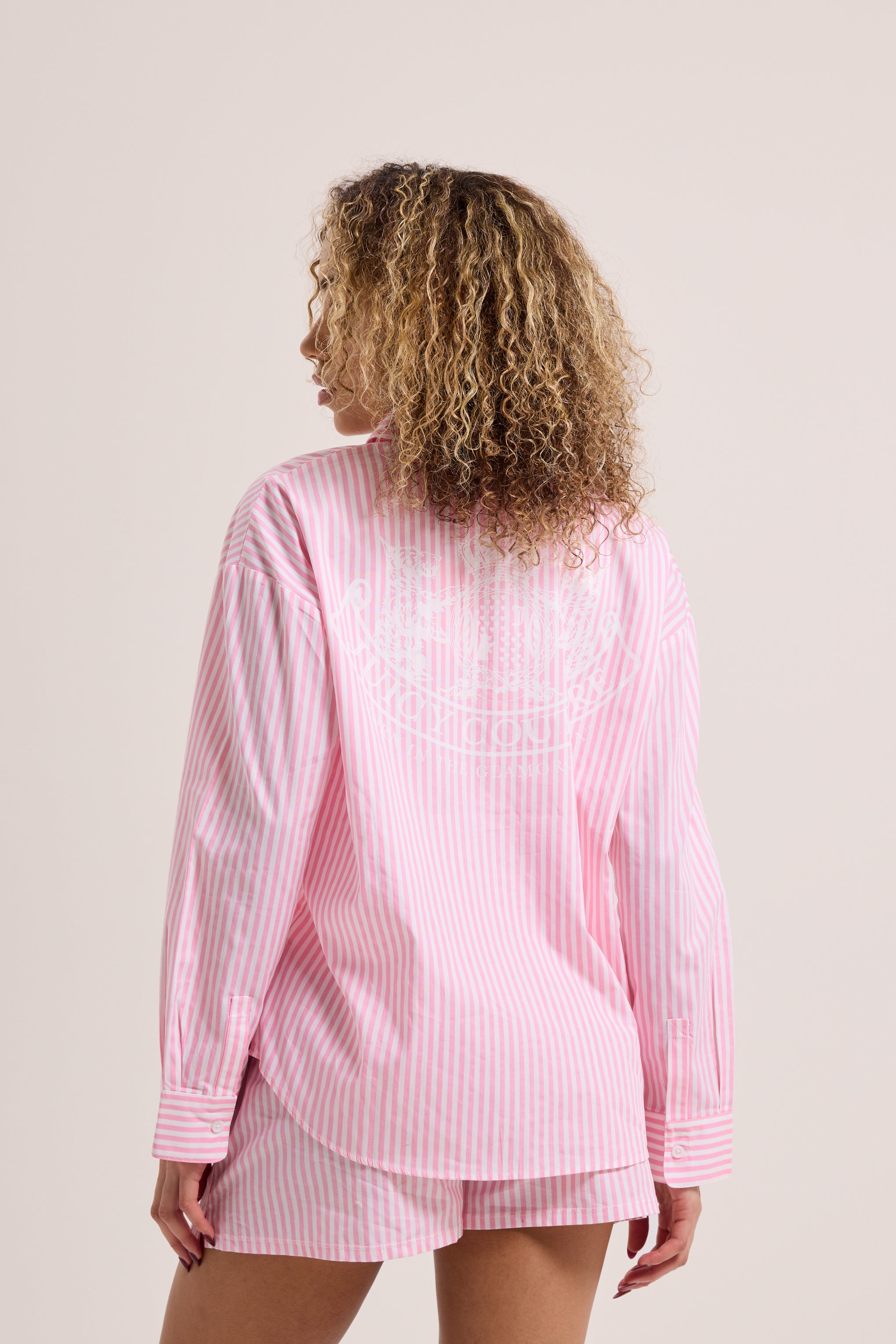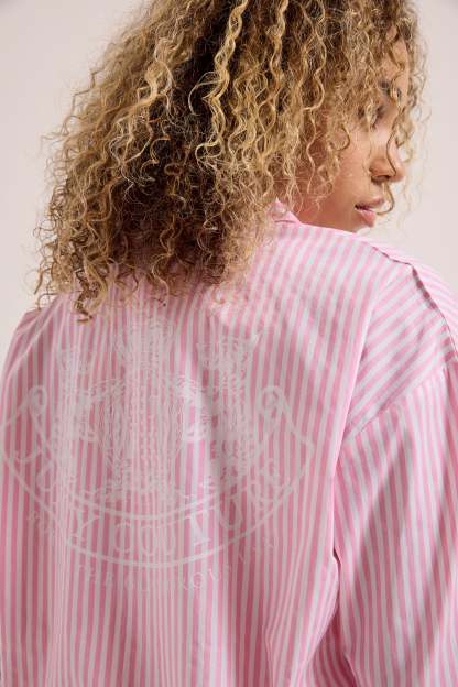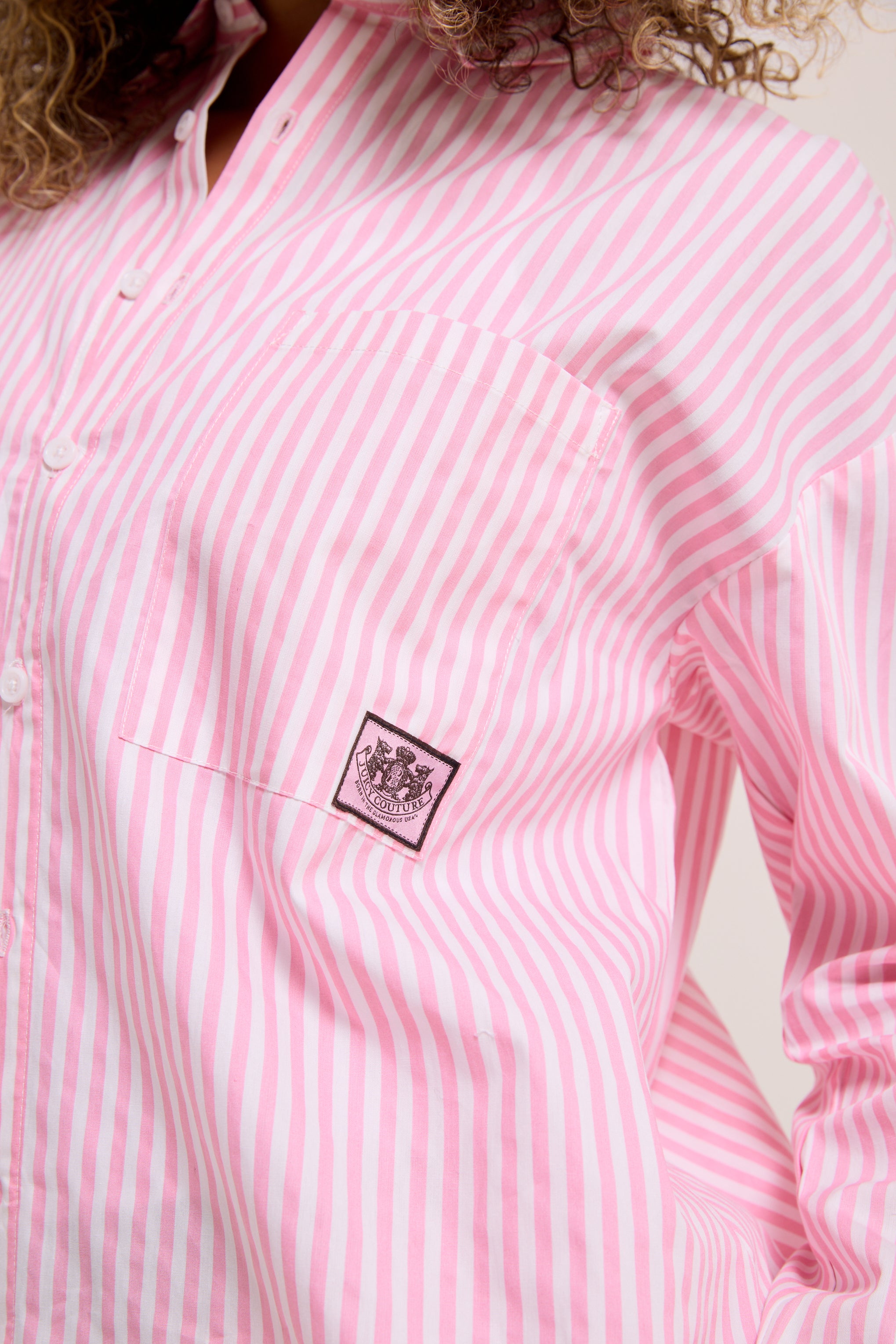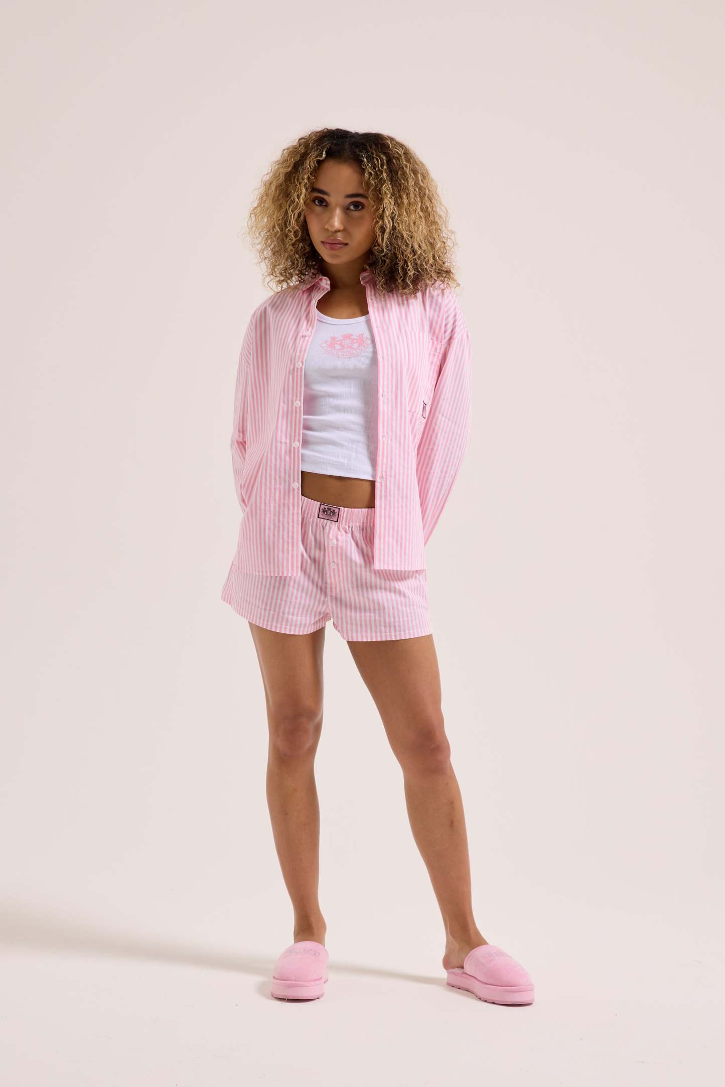 Oversized shirt in pink stripe cotton. This relaxed fit sleep shirt features crest patch on oversized front chest pocket. Wear with jeans for or pair with matching shorts for sleepwear set.
