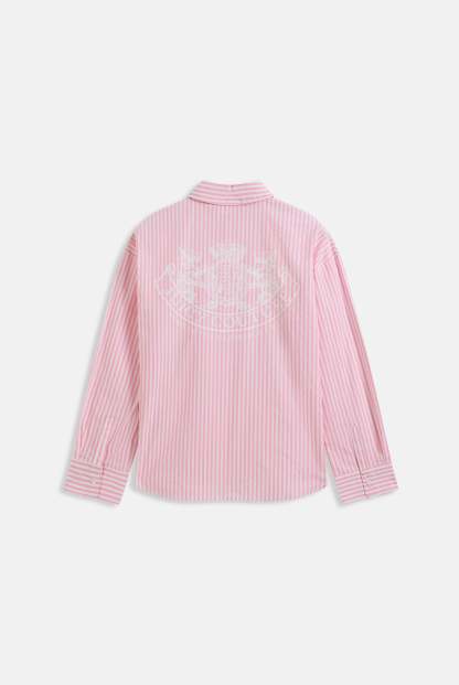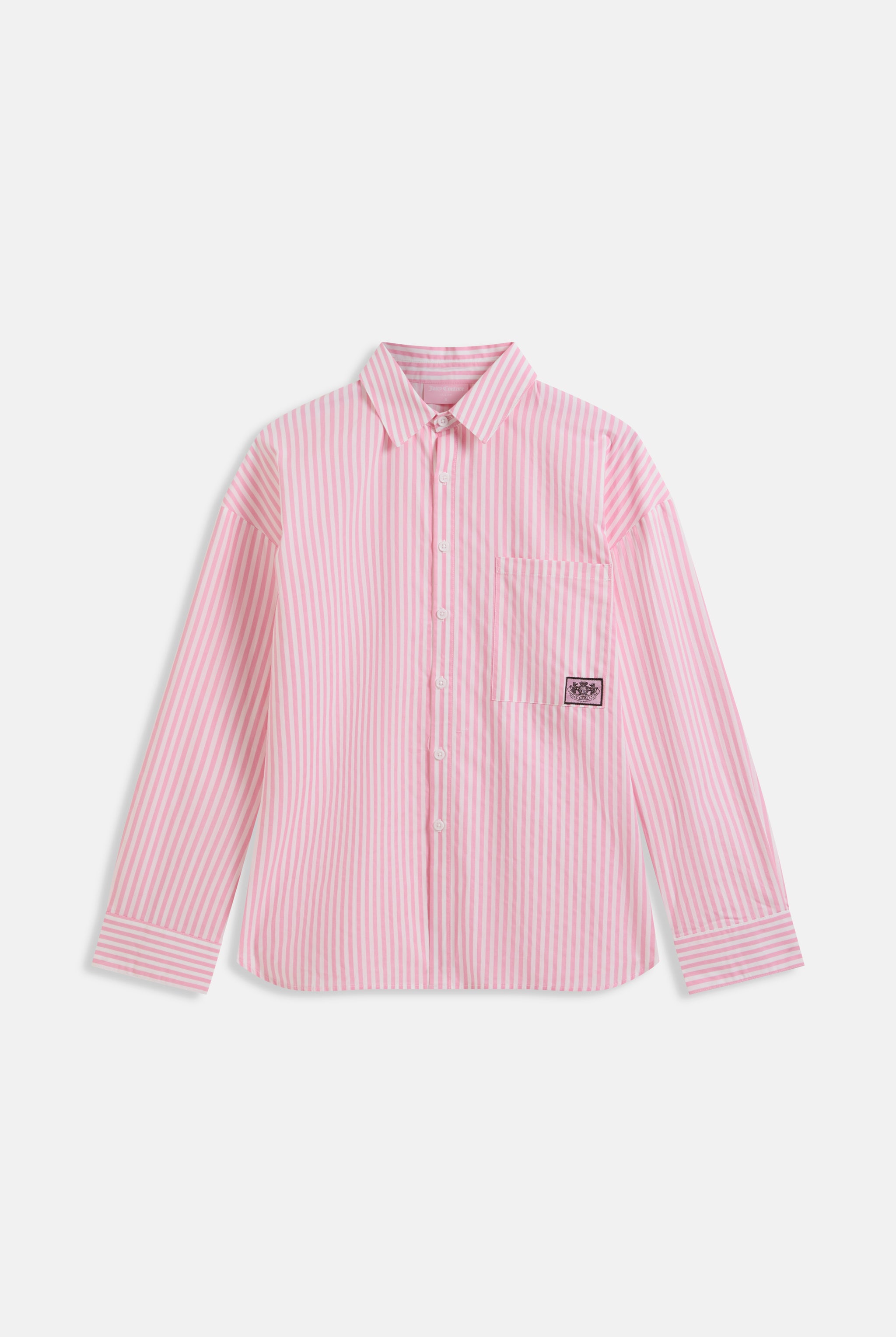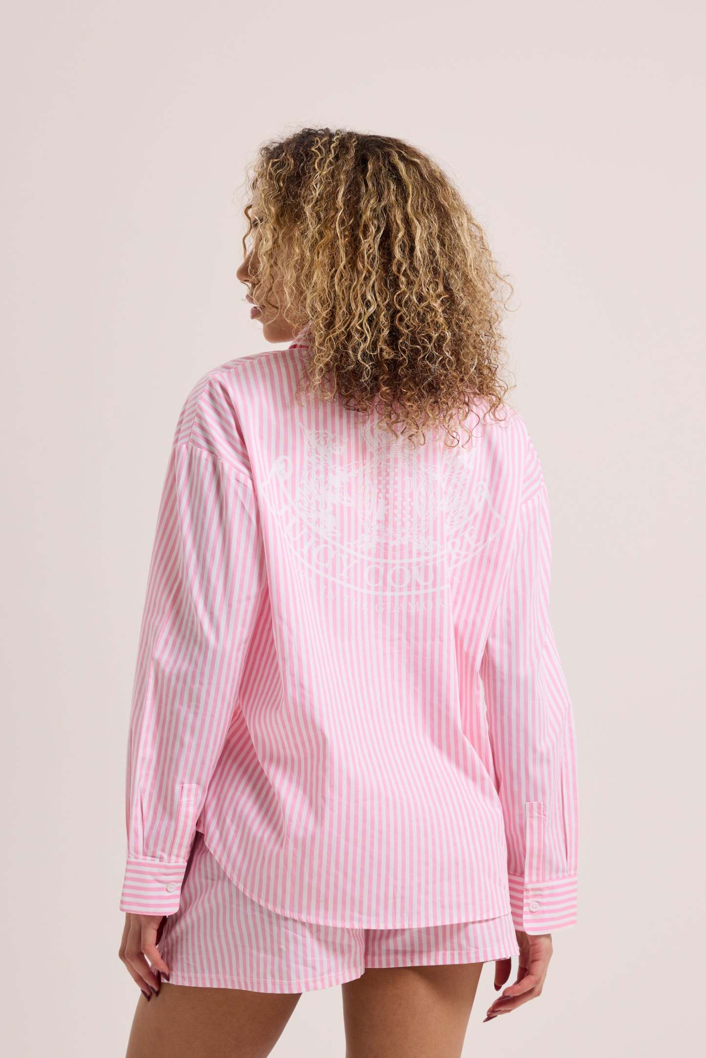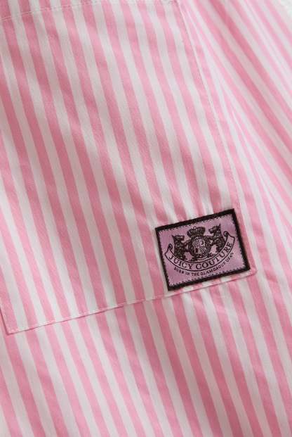 Oversized shirt in pink stripe cotton. This relaxed fit sleep shirt features crest patch on oversized front chest pocket. Wear with jeans for or pair with matching shorts for sleepwear set.