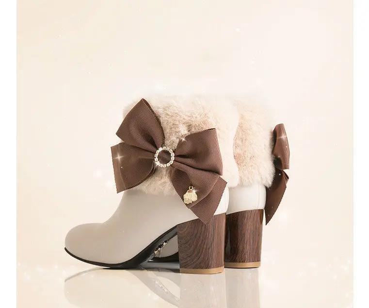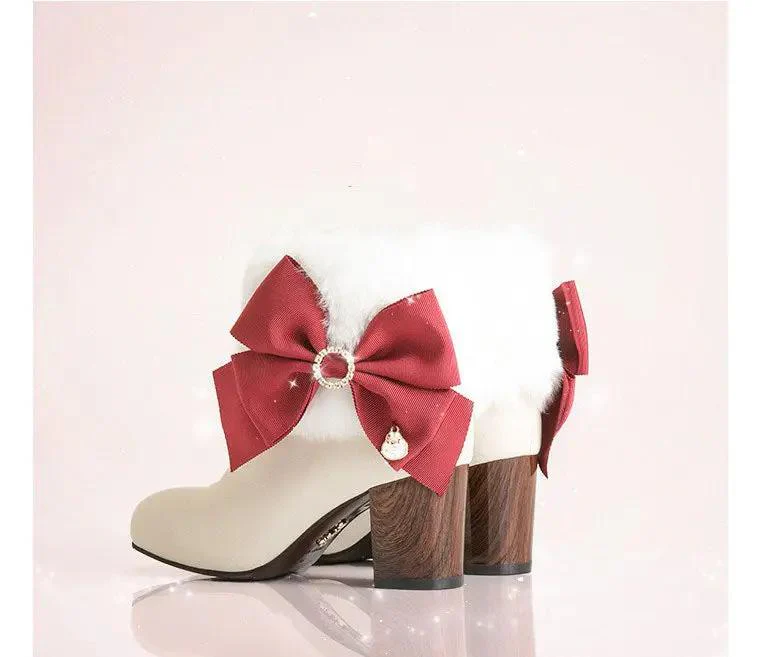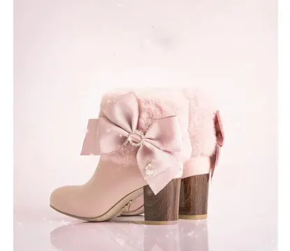 Mid-heel ankle boots feature a sweet, versatile silhouette with a rounded toe, chunky heel, and soft fur-trimmed finish for autumn and winter wear. The clean short shaft is accented with a delicate bow detail, while the side zipper allows easy on-and-off. Designed for daily styling, the balanced heel height delivers comfortable lift with a cozy, feminine look.