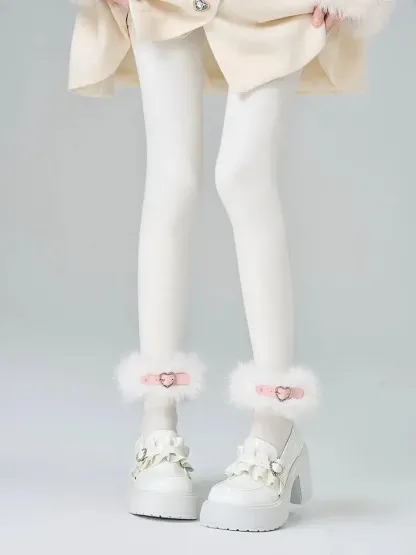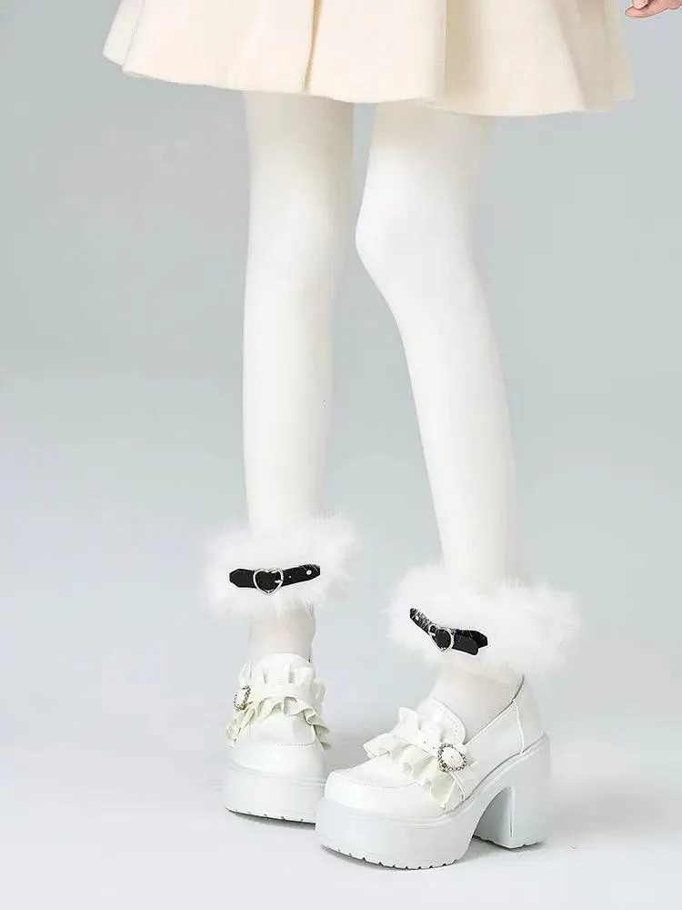 White platform Mary Jane silhouette with fluffy ankle cuffs