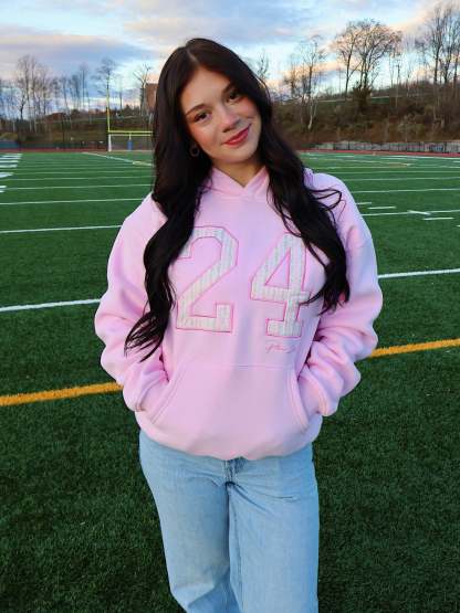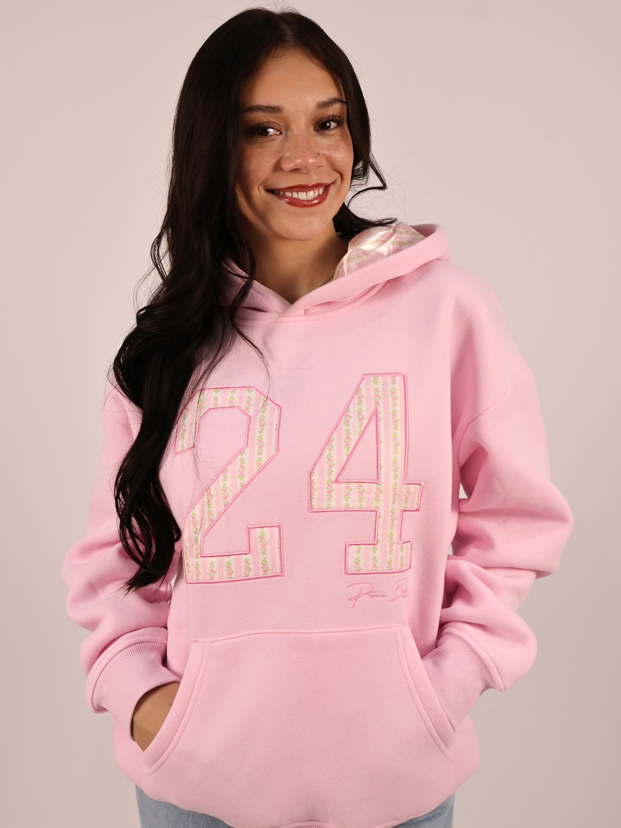 Soft pastel pink hoodie featuring a patchwork “24” on the chest. The hood is lined with our signature satin, detailed in pink floral stripes and roses. Drop shoulder, relaxed, and cozy fit made for everyday comfort. Game day just got way cuter!