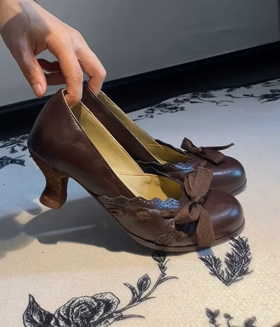 These Mary Jane heels feature a classic round-toe silhouette with a chunky heel, creating a timeless vintage look with everyday wearability. Designed to pair easily with pleated skirts, knit dresses, or wool trousers, they work well for campus outfits, daily wear, and elegant retro styling, especially when worn with socks or tights for an autumn-inspired British feel curated by Soft Jam.